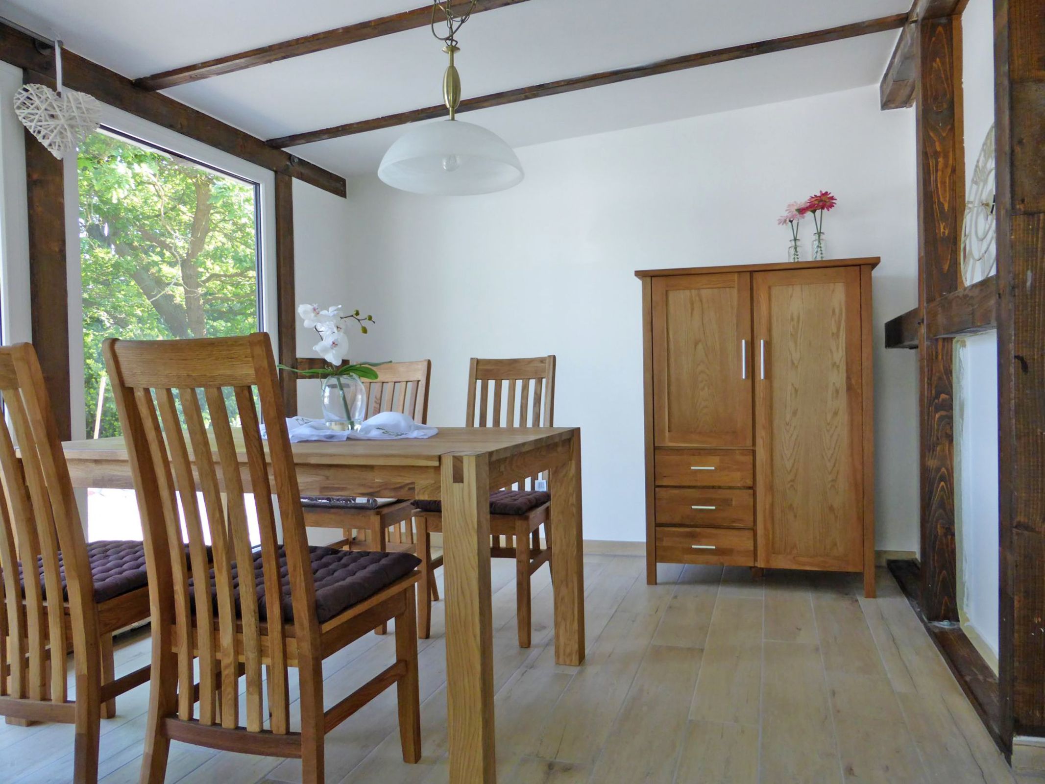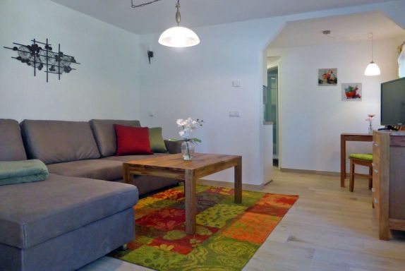 Die 47m² Ferienwohnung 1 befindet sich auf der rechten Seite des Hauses und wird über einen separaten Eingang betreten. Das Wohnzimmer ist mit einer Eckcouch mit Schlaffunktion (1,80 x 2,00m) und einem Flachbild-TV ausgestattet. Von hier aus gelangt in die helle Veranda mit Esstisch und Stühle und in die offene Küche mit Tisch, Ceran-Herd, Backofen, Geschirrspüler, Kühlschrank mit Gefrierfach, Mikrowellem, Toaster, Eierkocher, Mixer, Wasserkocher. Im angrenzenden Schlafzimmer befindet sich ein Doppelbett sowie eine Kommode mit einem TV. Das Bad verfügt über eine Dusche und ein WC.