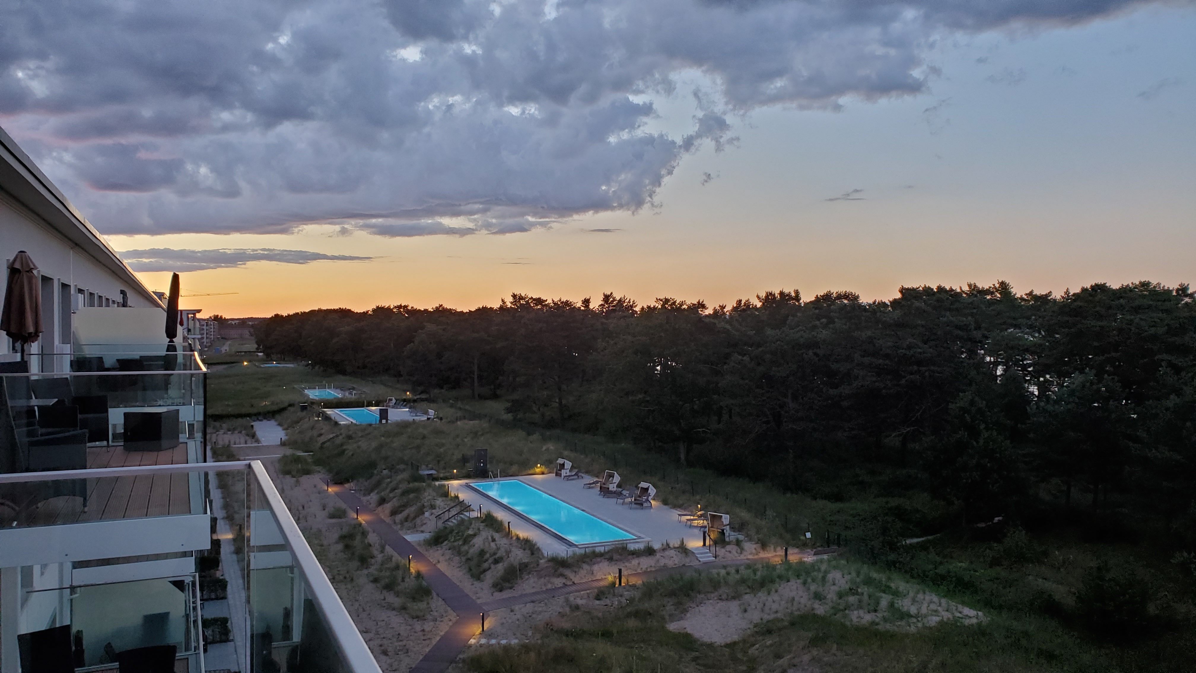 Die exklusive, hochwertig eingerichtete Ferienwohnung ganz oben im 5.OG mit unverbautem, herrlichen Blick auf die Ostsee befindet sich direkt am feinsandigen, kilometerweiten Ostseestrand inmitten einer privaten Ferienanlage. Grillplatz, Außenpool und Liegeplätzen, begrünt mit einheimischer Flora und Fauna, können Sie von oben, von Ihrem eigenen Balkon aus genießen oder exklusiv mit den Gästen der Ferienanlage teilen. Ein privater Strandzugang der Ferienanlage führt Sie durch ein kleines Kiefernwäldchen nach 20 m direkt zum Ostseesand. Ein großzügiger Innenpool mit Kinderbecken sowie eine Saunalandschaft mit Fitnessstudio sind von Ihrer Wohnung aus direkt trockenen Fußes erreichbar. Wenige Schritte führen zu einer Boutique, einem Bäcker, einer Pizzeria, einem Cafe und einem Fischbistro. Zum Ausklingen eines wunderschönen Tages oder für den größeren Hunger befindet sich ein Feinschmeckerrestaurant und eine Bar direkt im Haus.