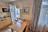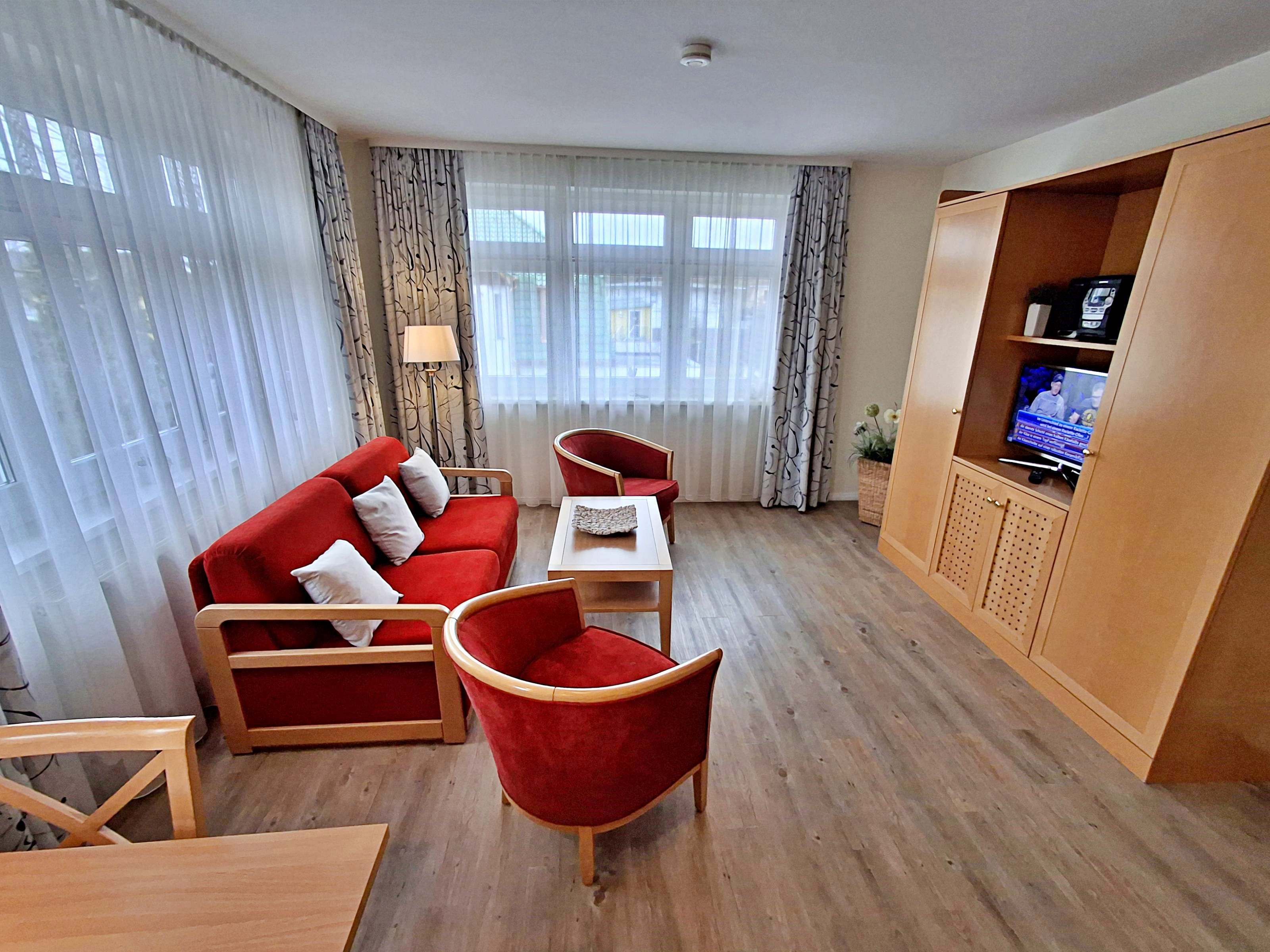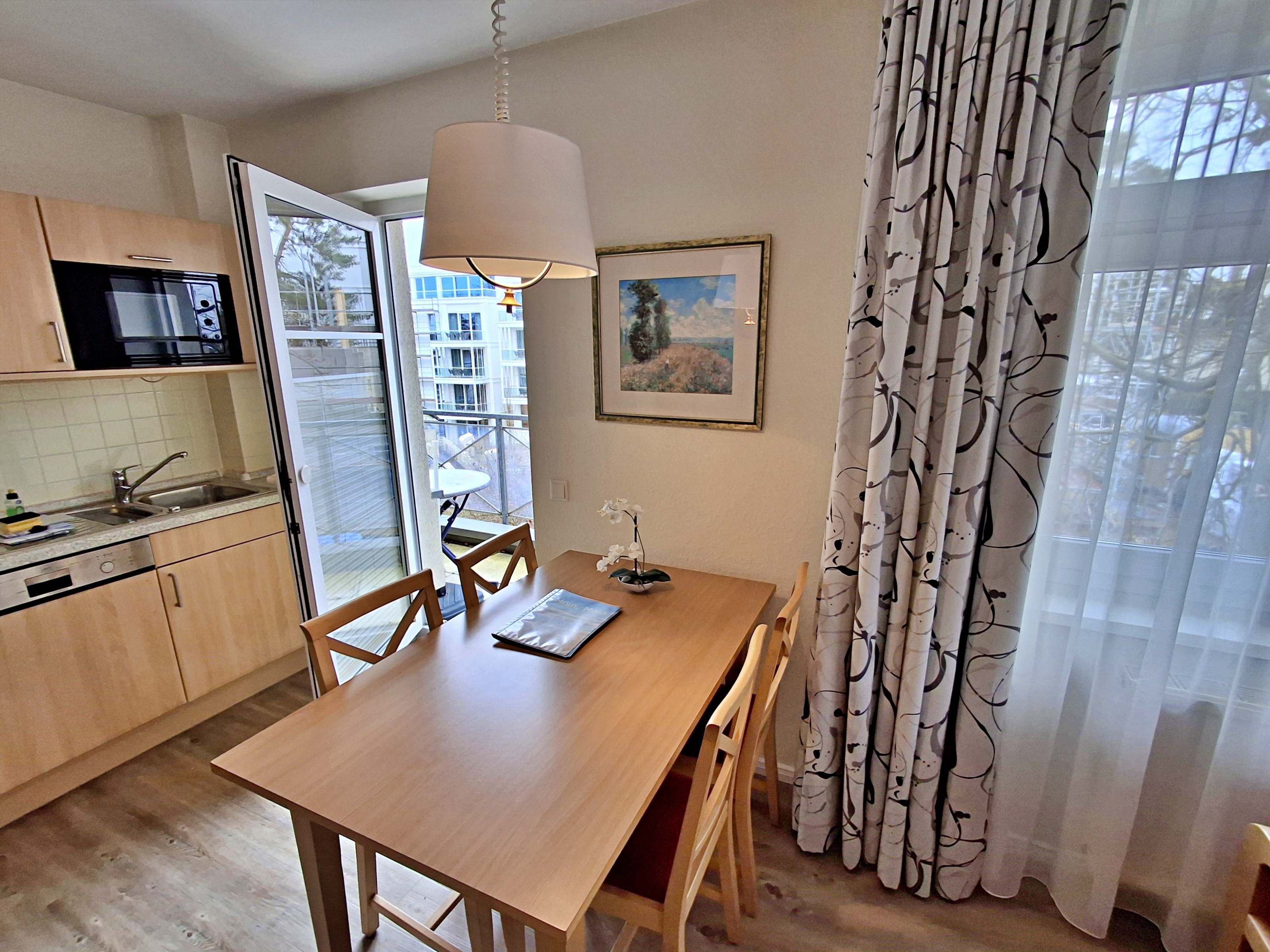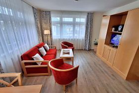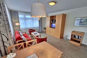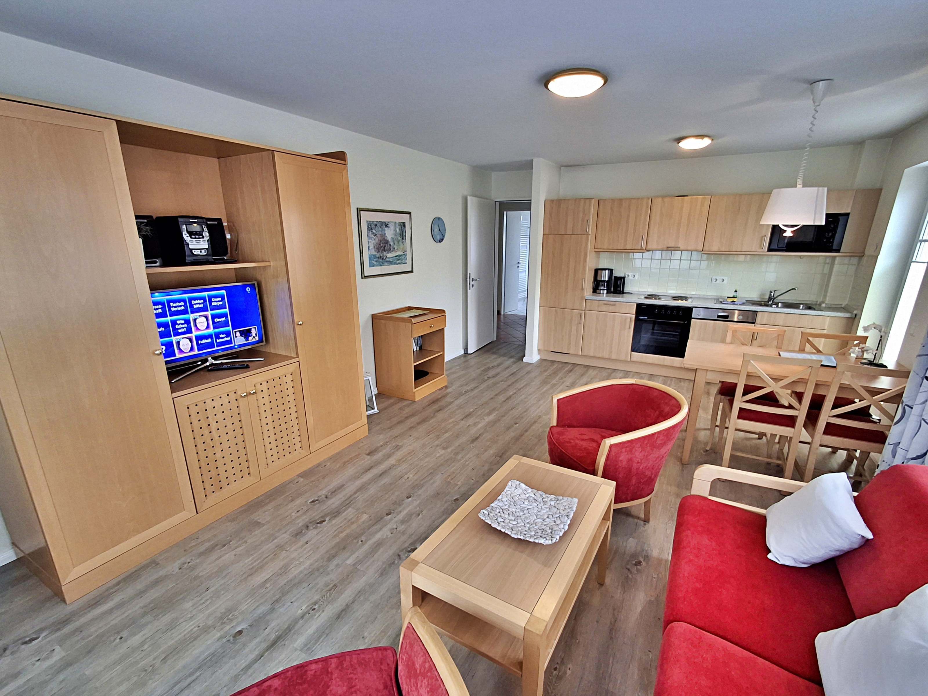 Die 54 qm große 2-Raum-Ferienwohnung befindet sich im zweiten Obergeschoss (Süd-Ostlage) der Appartementanlage und ist für 2 Personen ausgestattet. Die Wohnung verfügt über ein Wohnzimmer mit gemütlichem Sofa, Sessel sowie einer Essecke mit 4 Stühlen. Für die Unterhaltung sorgen ein Flachbild-TV und eine Stereo-Anlage. Die vollständig ausgestattete Küche mit 4-Plattenherd, Backofen, Mikrowelle, Kühlschrank mit Gefrierfach und Spülmaschine lässt keine Wünsche offen. Im Schlafzimmer befindet sich ein Doppelbett und ein geräumiger Kleiderschrank. Das Tageslicht-Bad ist mit Dusche/WC und Haarfön ausgestattet. Ein Balkon lädt zum Sitzen und Verweilen ein. Hier können Sie bei schönem Wetter schon morgens Ihren Kaffee genießen oder den Abend bei einem Glas Wein ausklingen lassen. WLAN steht Ihnen kostenfrei zur Verfügung.