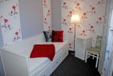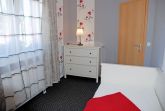 Die moderne Küchenzeile ist mit einem Herd mit Cerankochfeld, Backofen, Abzugshaube, Mikrowelle, Wasserkocher, Kaffeemaschine, Spüle, Toaster und Kühlschrank mit Gefrierfach ausgestattet. Vom Wohnzimmer aus gelangt man auf die Sonnenterrasse mit Gartenmöbeln, davor befindet sich eine Liegewiese zum Sonnen. Im ersten Schlafzimmer steht ein bequemes Doppelbett mit Nachttischen und Leselampen sowie ein Kleiderschrank. Das zweite Schlafzimmer verfügt über ein Einzelbett, das zu einem Doppelbett (160 cm) umgestaltet werden kann. Hier steht auch ein Kommode.