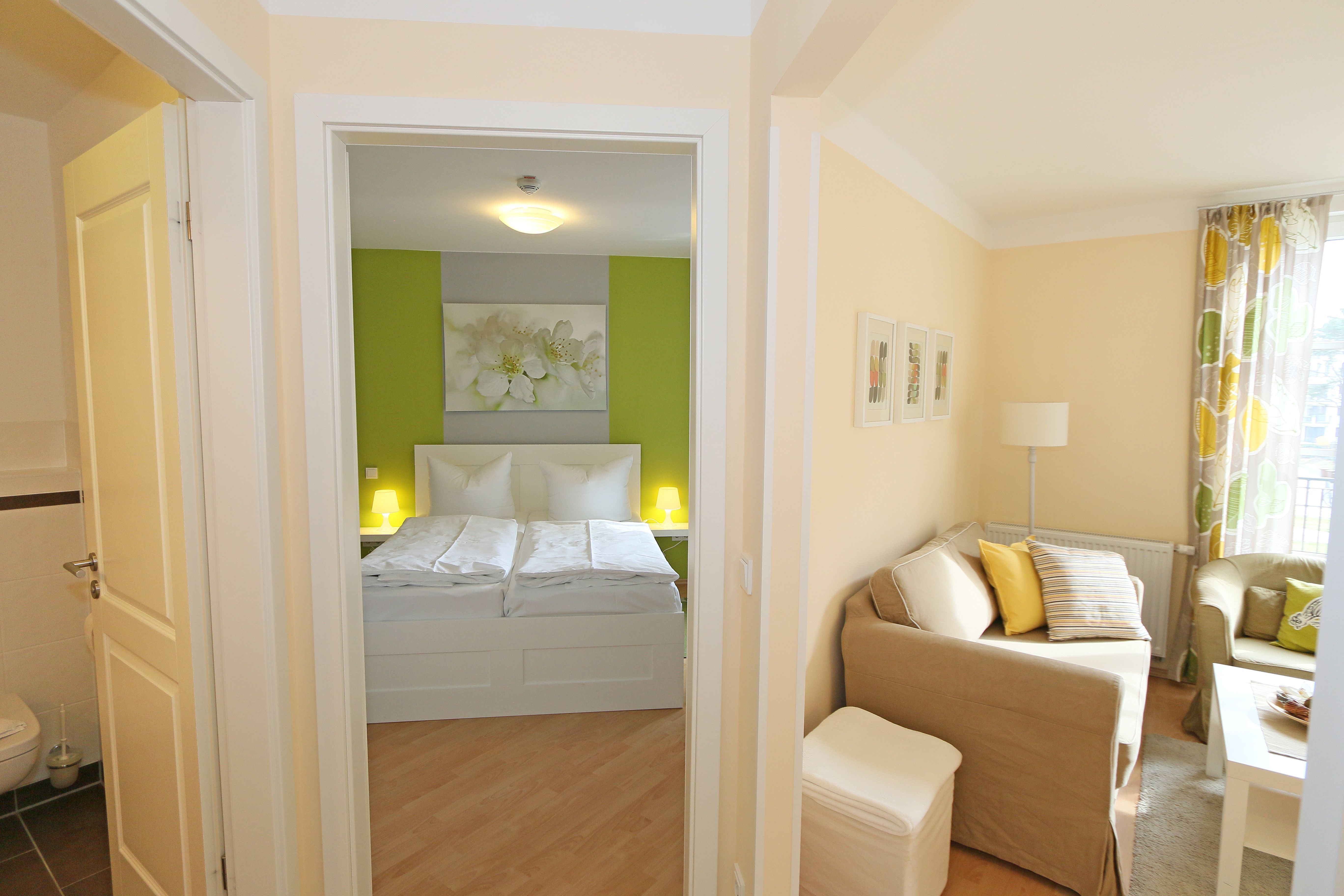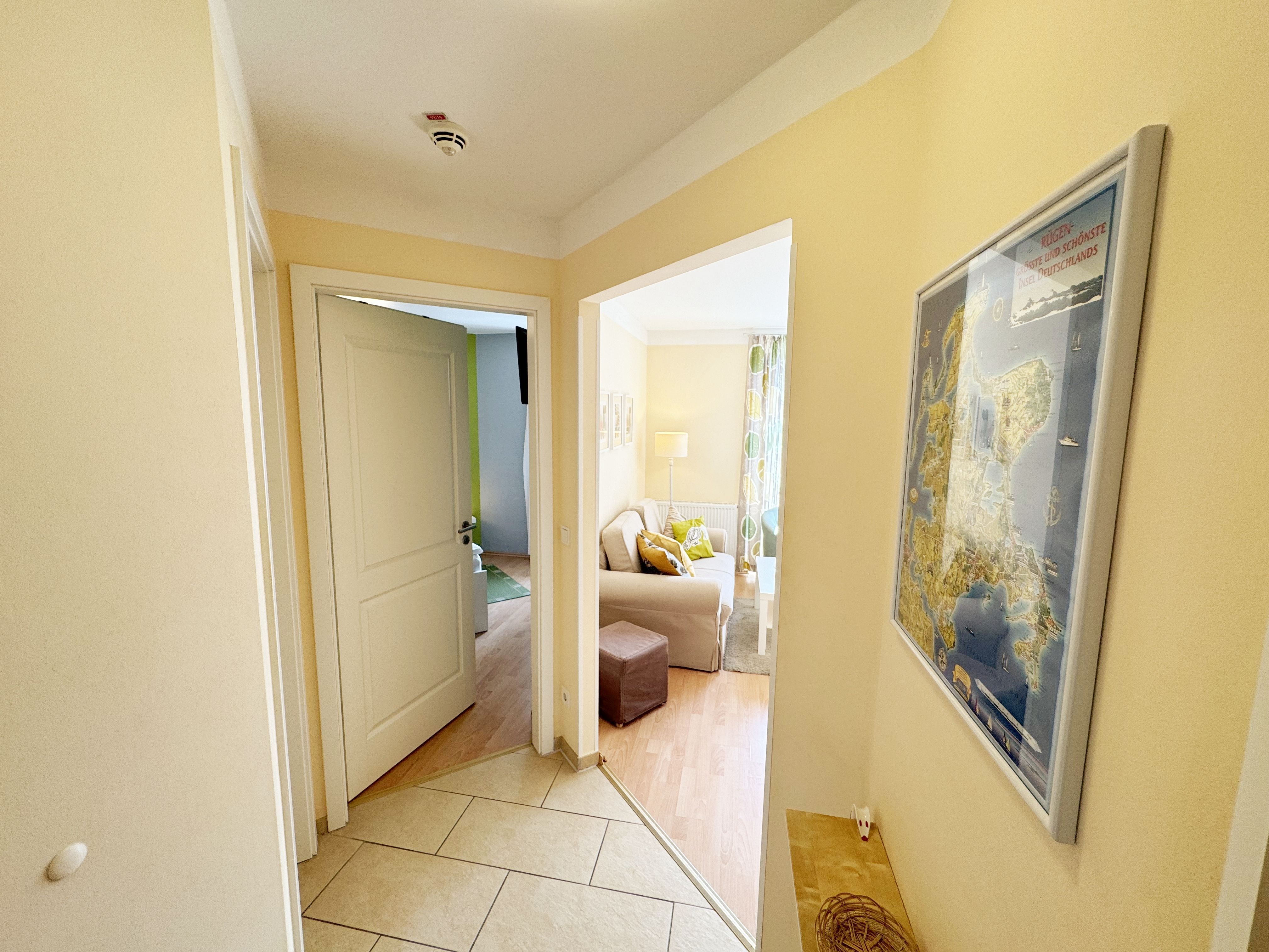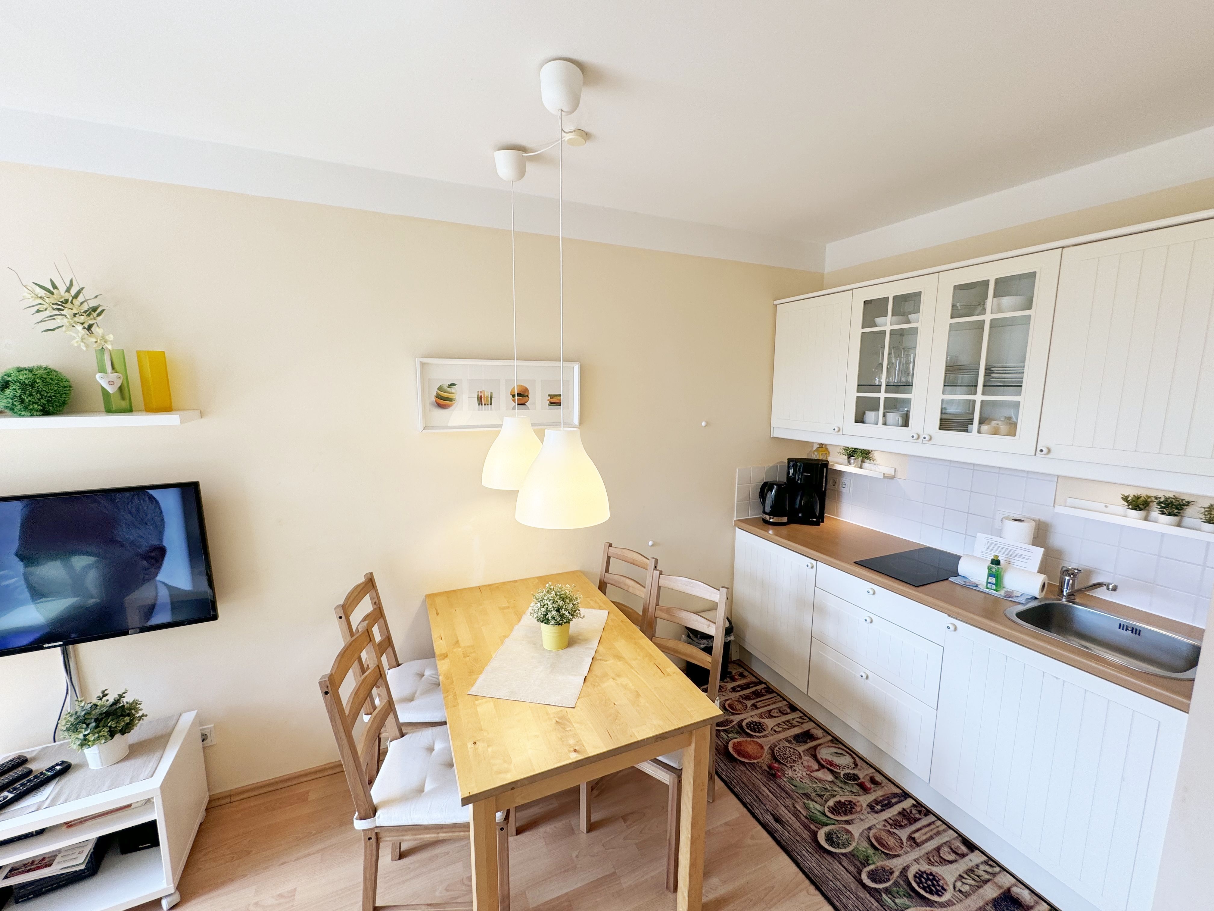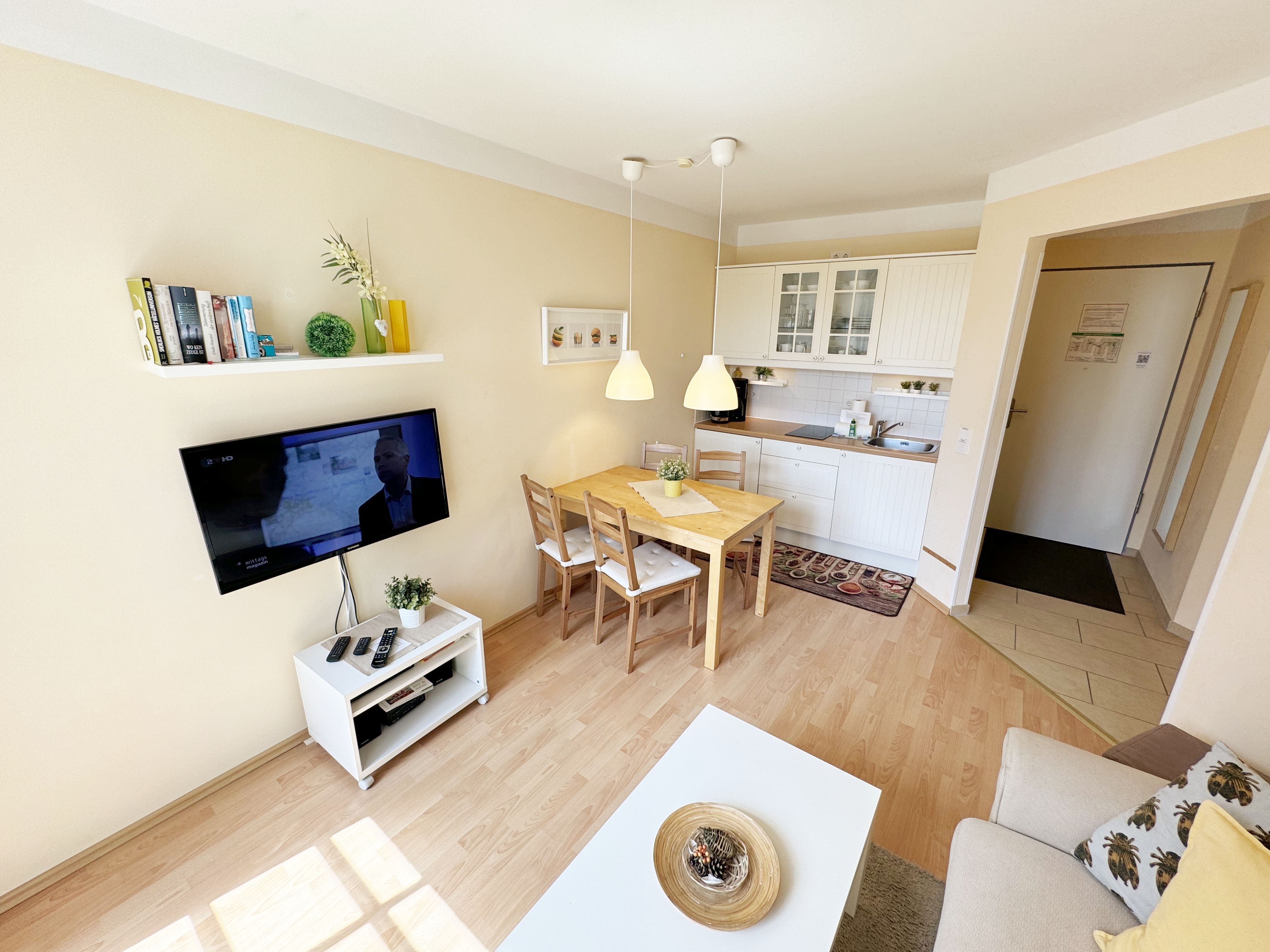 Die geschmackvoll eingerichtete, ca. 40 m² große 2-Raumferienwohnung (Nichtraucher) befindet sich im Haus Meeresblick in Bestlage des Ostseebades Baabe. Die Wohnung Inselparadies 2.09, welche bequem über einen Fahrstuhl erreichbar ist, befindet sich in der zweiten Etage und bietet Platz für 2 bis 3 Personen. Der geräumige Wohnbereich verfügt über eine Couch (Aufbettungsmöglichkeit für 3. Person 1,20m x 1,96m), einen Sessel, einen Couchtisch sowie eine Leselampe. Der technische Bereich wird durch einen Flachbild-TV, eine Mini-Stereoanlage mit CD und DVD-Player abgerundet. Auch auf einen Internetanschluss (WLAN) brauchen Sie nicht verzichten. Dieser ist für Sie inklusive. Angrenzend zum Wohnbereich befinden sich eine gemütliche Essecke mit Holztisch und 3 Stühlen sowie eine im nordischen Stil angelehnte Küchenzeile mit diversen Küchenutensilien. Hochwertige Geräte wie ein 2-Zonenceranfeld, Kühlschrank mit Gefrierfach, Geschirrspüler, Mikrowelle, Kaffeemaschine, Wasserkocher, Toaster gehören selbstverständlich dazu. Das komfortable Schlafzimmer ist mit einem Doppelbett (1,60m x 2,00m) welches hochwertige Matratzen und verstellbare Lattenroste beinhaltet sowie 2 Nachttischlampen, einen Flachbild-TV, Radiowecker und einem Kleiderschrank eingerichtet. Der nach Süden ausgerichtete Balkon verfügt über eine Bestuhlung sowie einen Sonnenschirm, welchen Sie vom Wohnbereich aus erreichen. Im Badezimmer befindet sich eine ebenerdige Dusche, ein WC, Fön und ein Handtuchheizkörper. Darüber hinaus stehen Ihnen ein Bügelbrett und ein Bügeleisen zur Verfügung. Mit einem eigenen Schlafplatz ist 1 Haustier gegen eine Gebühr ein gern gesehener Gast. Ein eigener PKW-Stellplatz Nr. 84 (Einfahrtshöhe 2,00m) befindet sich in der Tiefgarage des Hauses. Im Keller des Hauses haben Sie die Möglichkeit eine Waschmaschine/Trockner gegen Gebühr zu nutzen. Ihre mitgebrachten Fahrräder oder auch geliehenen können am Objekt abstellen. Mit dem Fahrstuhl des Hauses A gelangen sie in das Untergeschoss der Meeresblickanlage, wo Sie ein großzügiger und heller Wellnessbereich erwartet. Hier können sie in einem Pool kleine Bahnen schwimmen, in 2 Saunen Ihren Kreislauf in Schwung bringen, in einem dazugehörigen Ruheraum Ihren Körper wieder beruhigen, in einer Schneckendusche sowie weiteren Duschen das kühle Nass genießen und auf einer Außenterrasse mit Außendusche die frische Luft einatmen. Die Erstausstattung eines Wäschepaketes (komplette Bettwäsche, 1 Duschhandtuch, 2 kleine Handtücher) können Sie bis 14 Tage vor Anreise gegen einen Aufpreis dazu buchen oder durch eigene ergänzen. Ab 2 gebuchten Paketen erhalten Sie einmalig 1 Geschirrhandtuch und 1 Duschvorleger hinzu.