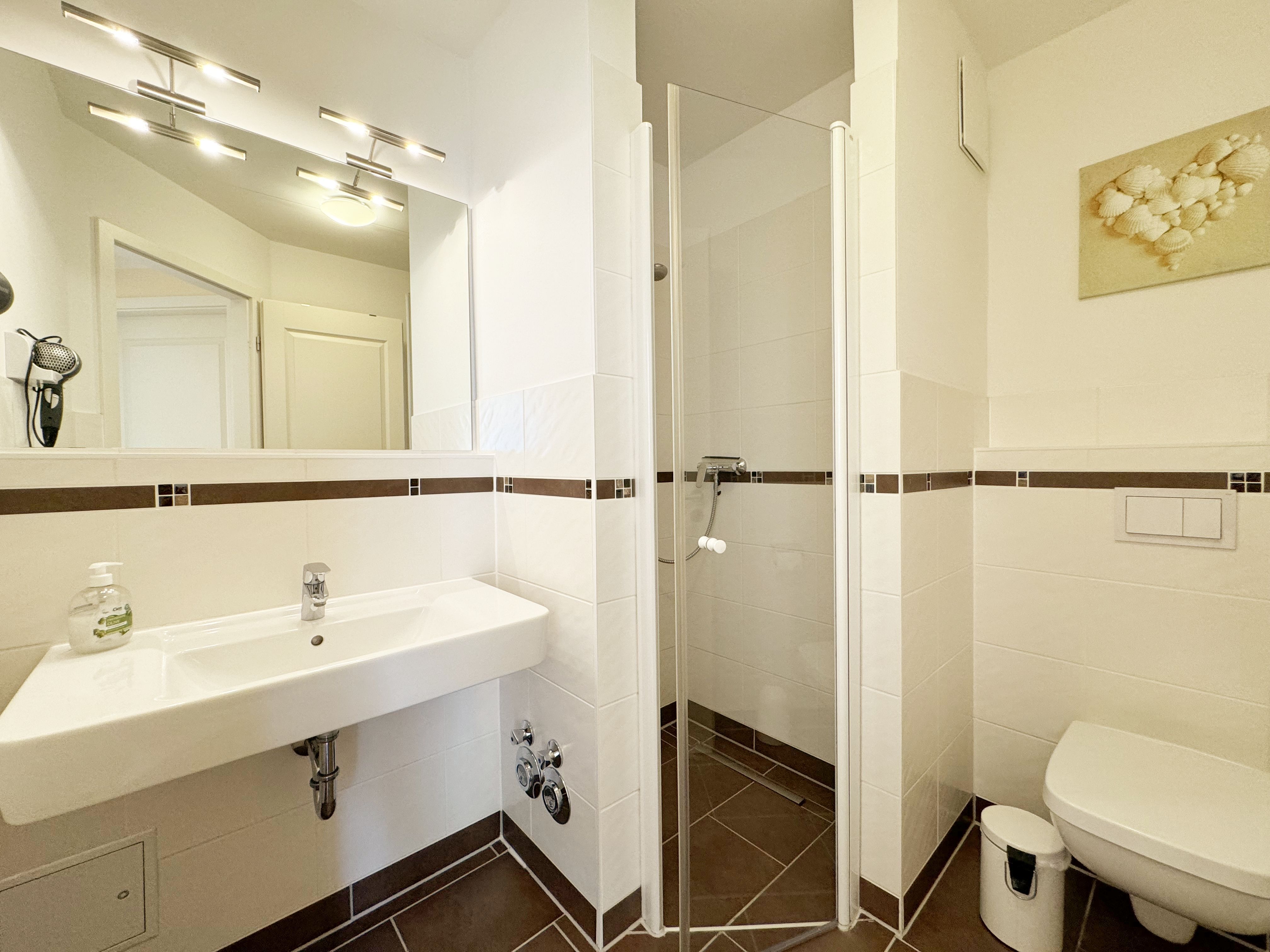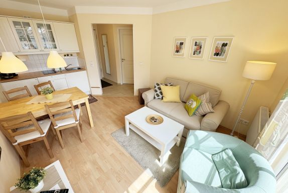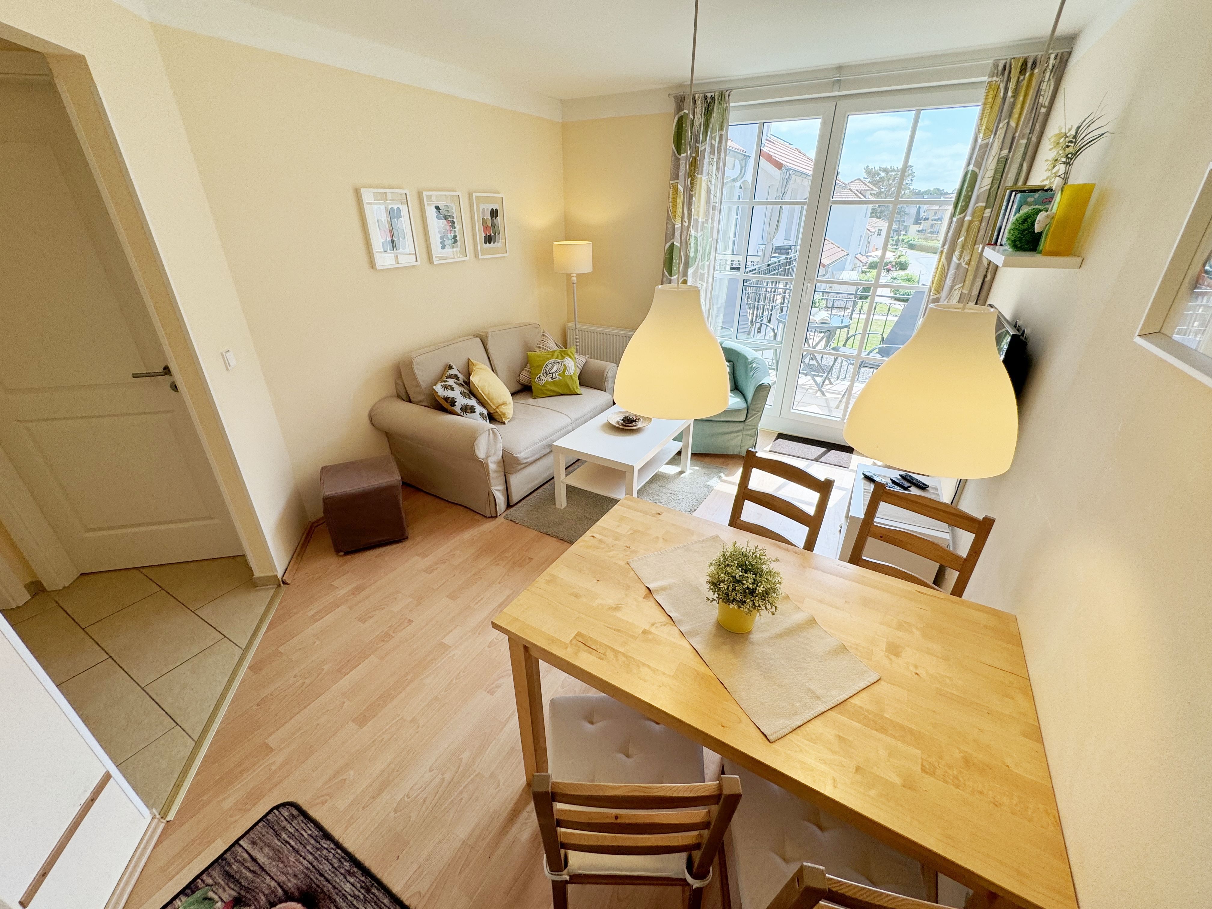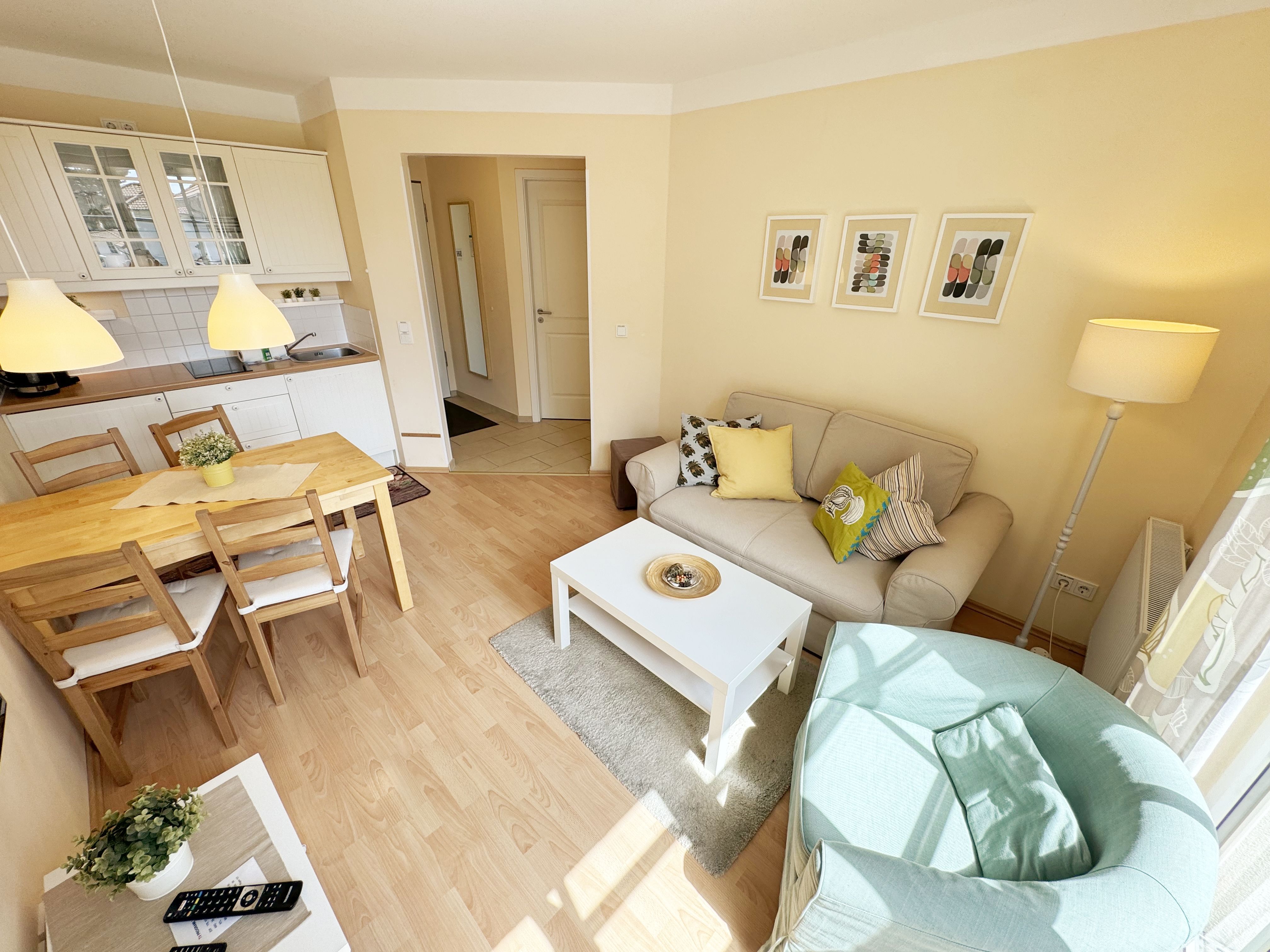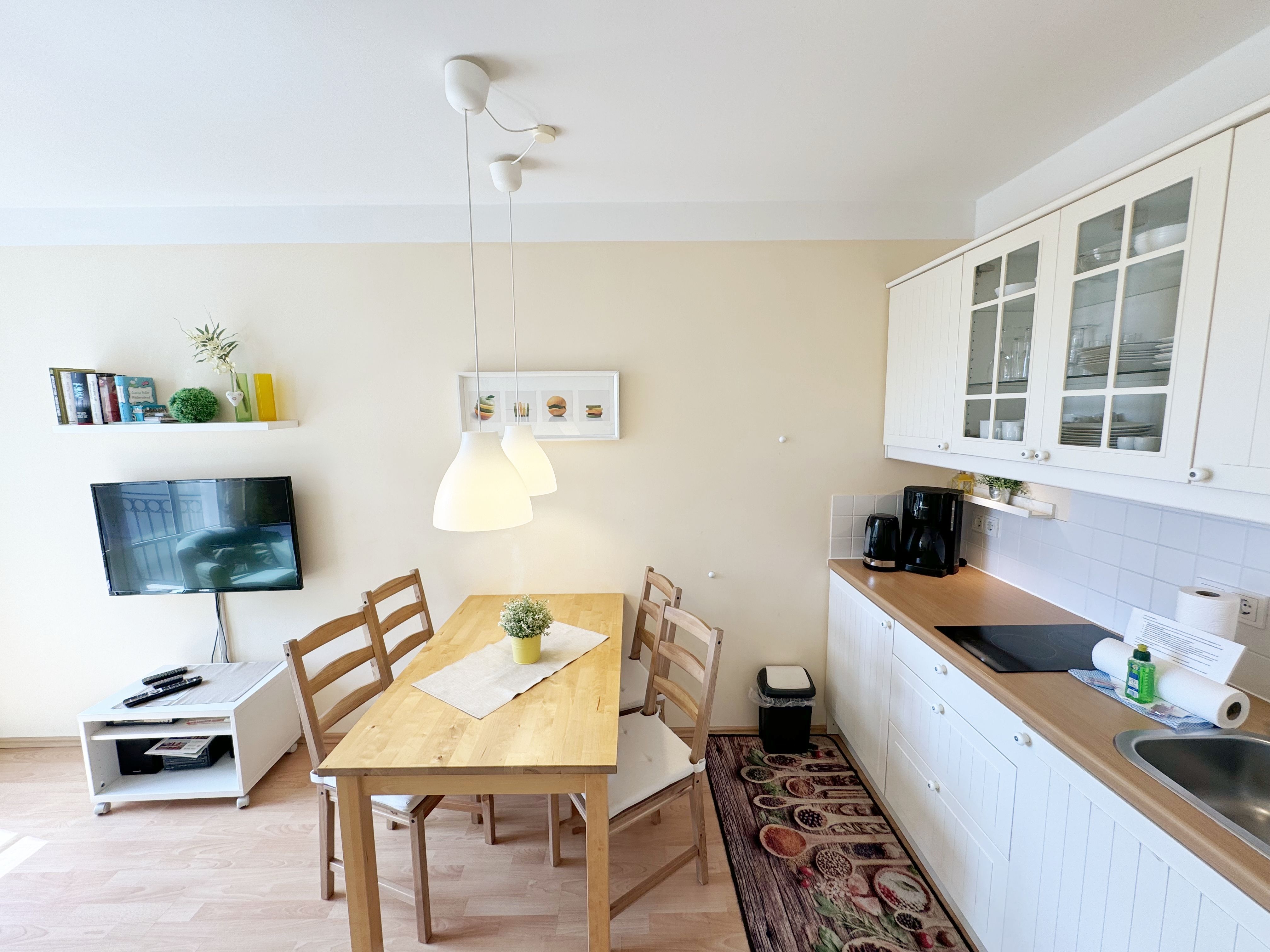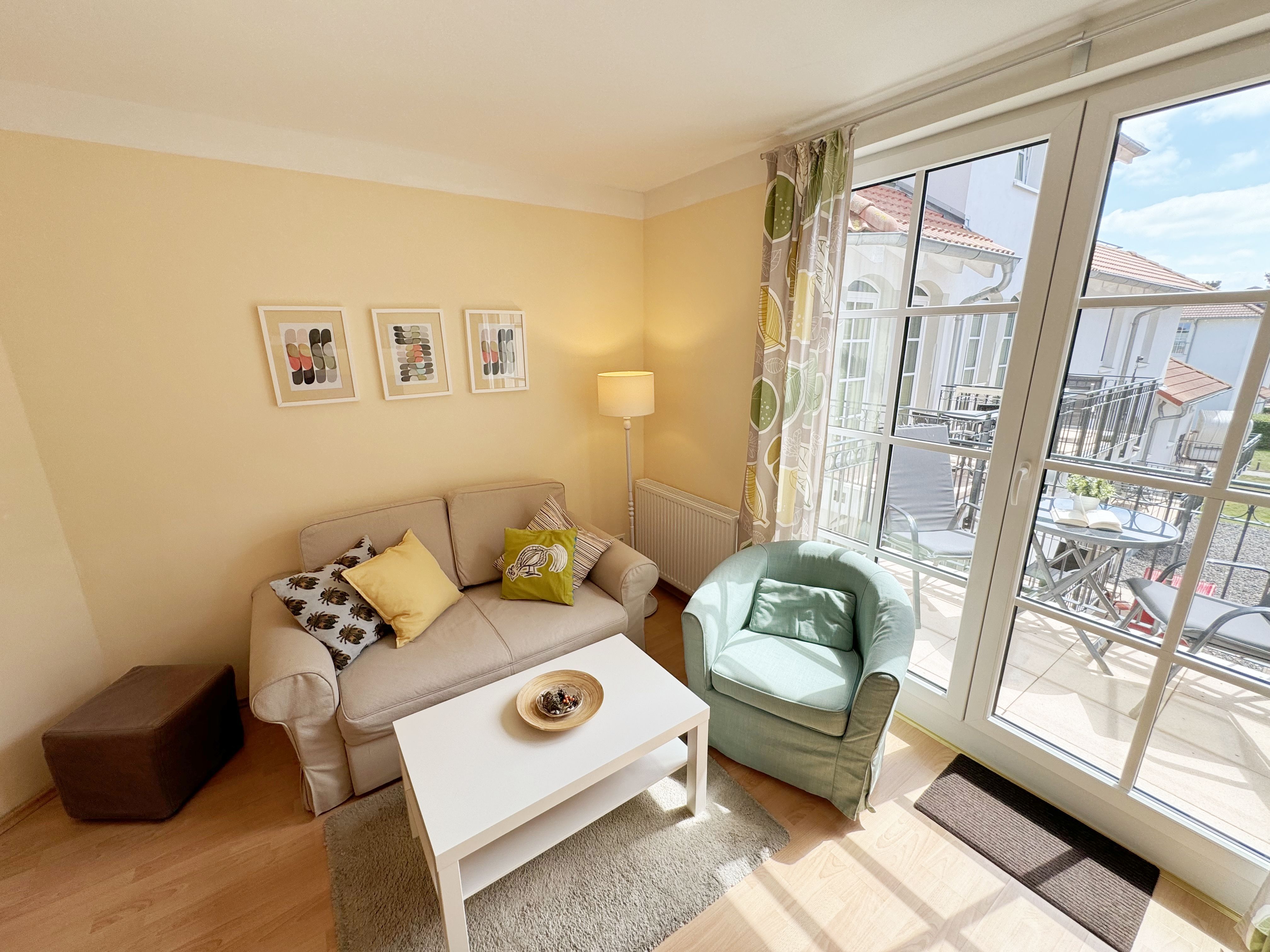 Die geschmackvoll eingerichtete, ca. 40 m² große 2-Raumferienwohnung (Nichtraucher) befindet sich im Haus Meeresblick in Bestlage des Ostseebades Baabe. Die Wohnung Inselparadies 2.09, welche bequem über einen Fahrstuhl erreichbar ist, befindet sich in der zweiten Etage und bietet Platz für 2 bis 3 Personen. Der geräumige Wohnbereich verfügt über eine Couch (Aufbettungsmöglichkeit für 3. Person 1,20m x 1,96m), einen Sessel, einen Couchtisch sowie eine Leselampe. Der technische Bereich wird durch einen Flachbild-TV, eine Mini-Stereoanlage mit CD und DVD-Player abgerundet. Auch auf einen Internetanschluss (WLAN) brauchen Sie nicht verzichten. Dieser ist für Sie inklusive. Angrenzend zum Wohnbereich befinden sich eine gemütliche Essecke mit Holztisch und 3 Stühlen sowie eine im nordischen Stil angelehnte Küchenzeile mit diversen Küchenutensilien. Hochwertige Geräte wie ein 2-Zonenceranfeld, Kühlschrank mit Gefrierfach, Geschirrspüler, Mikrowelle, Kaffeemaschine, Wasserkocher, Toaster gehören selbstverständlich dazu. Das komfortable Schlafzimmer ist mit einem Doppelbett (1,60m x 2,00m) welches hochwertige Matratzen und verstellbare Lattenroste beinhaltet sowie 2 Nachttischlampen, einen Flachbild-TV, Radiowecker und einem Kleiderschrank eingerichtet. Der nach Süden ausgerichtete Balkon verfügt über eine Bestuhlung sowie einen Sonnenschirm, welchen Sie vom Wohnbereich aus erreichen. Im Badezimmer befindet sich eine ebenerdige Dusche, ein WC, Fön und ein Handtuchheizkörper. Darüber hinaus stehen Ihnen ein Bügelbrett und ein Bügeleisen zur Verfügung. Mit einem eigenen Schlafplatz ist 1 Haustier gegen eine Gebühr ein gern gesehener Gast. Ein eigener PKW-Stellplatz Nr. 84 (Einfahrtshöhe 2,00m) befindet sich in der Tiefgarage des Hauses. Im Keller des Hauses haben Sie die Möglichkeit eine Waschmaschine/Trockner gegen Gebühr zu nutzen. Ihre mitgebrachten Fahrräder oder auch geliehenen können am Objekt abstellen. Mit dem Fahrstuhl des Hauses A gelangen sie in das Untergeschoss der Meeresblickanlage, wo Sie ein großzügiger und heller Wellnessbereich erwartet. Hier können sie in einem Pool kleine Bahnen schwimmen, in 2 Saunen Ihren Kreislauf in Schwung bringen, in einem dazugehörigen Ruheraum Ihren Körper wieder beruhigen, in einer Schneckendusche sowie weiteren Duschen das kühle Nass genießen und auf einer Außenterrasse mit Außendusche die frische Luft einatmen. Die Erstausstattung eines Wäschepaketes (komplette Bettwäsche, 1 Duschhandtuch, 2 kleine Handtücher) können Sie bis 14 Tage vor Anreise gegen einen Aufpreis dazu buchen oder durch eigene ergänzen. Ab 2 gebuchten Paketen erhalten Sie einmalig 1 Geschirrhandtuch und 1 Duschvorleger hinzu.