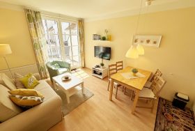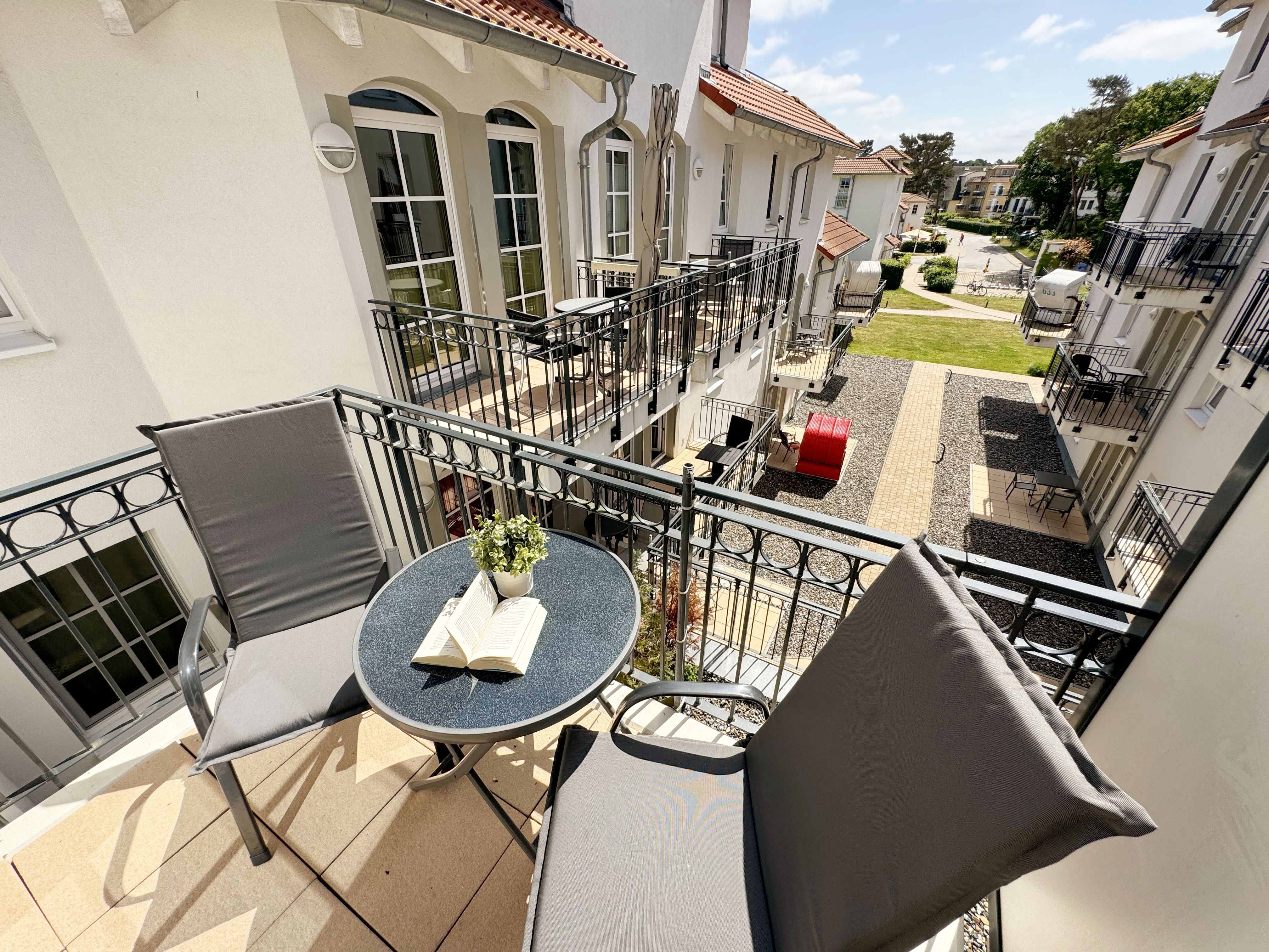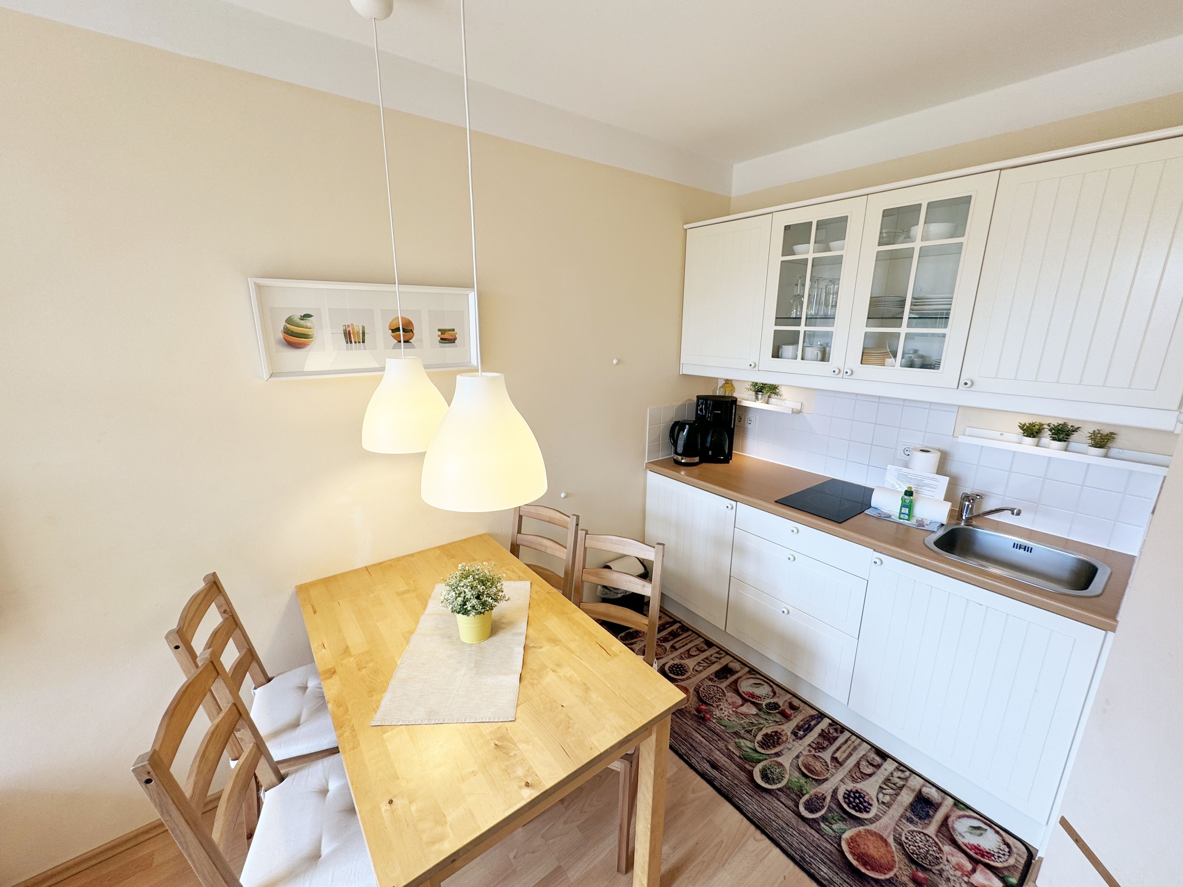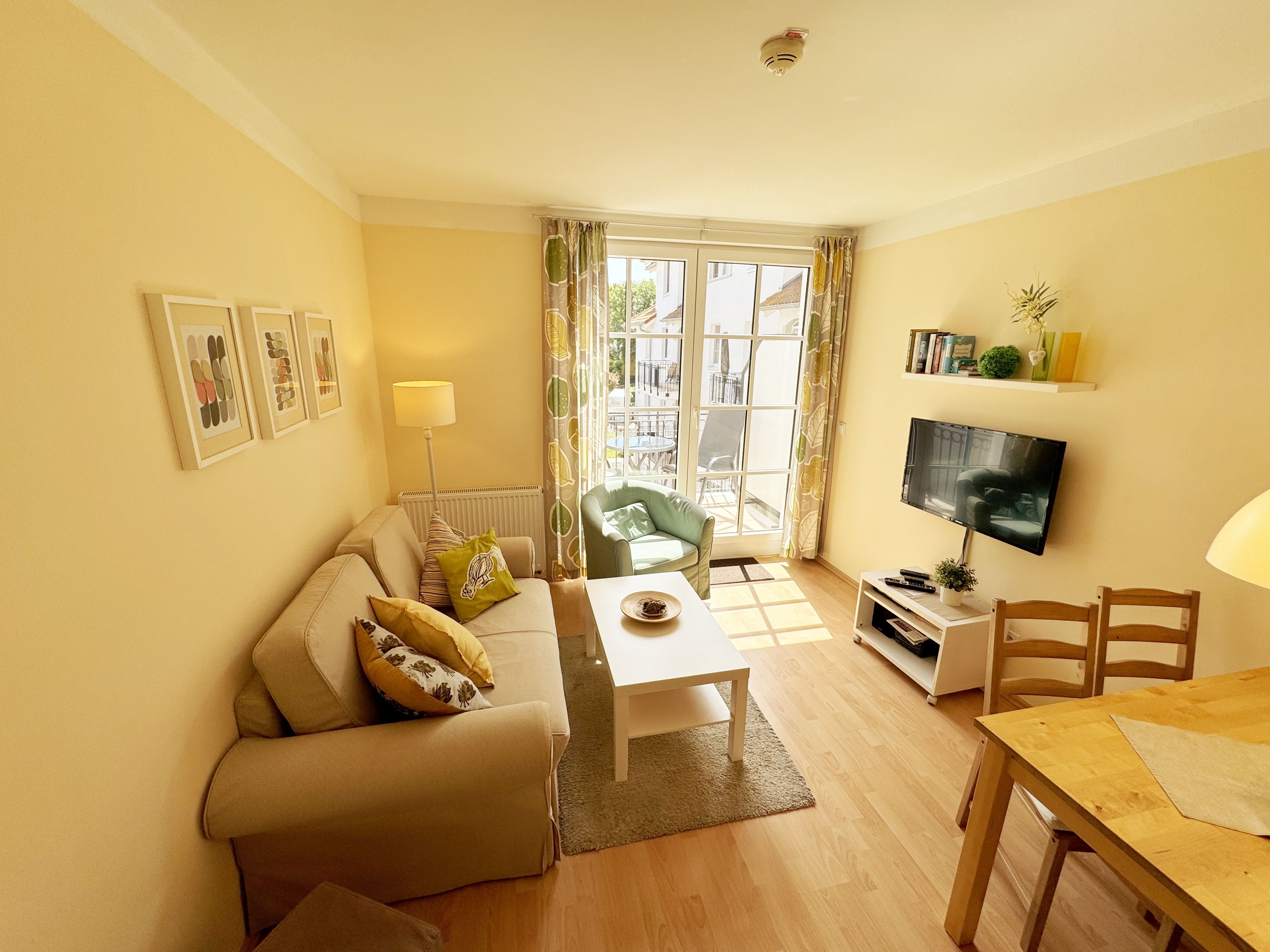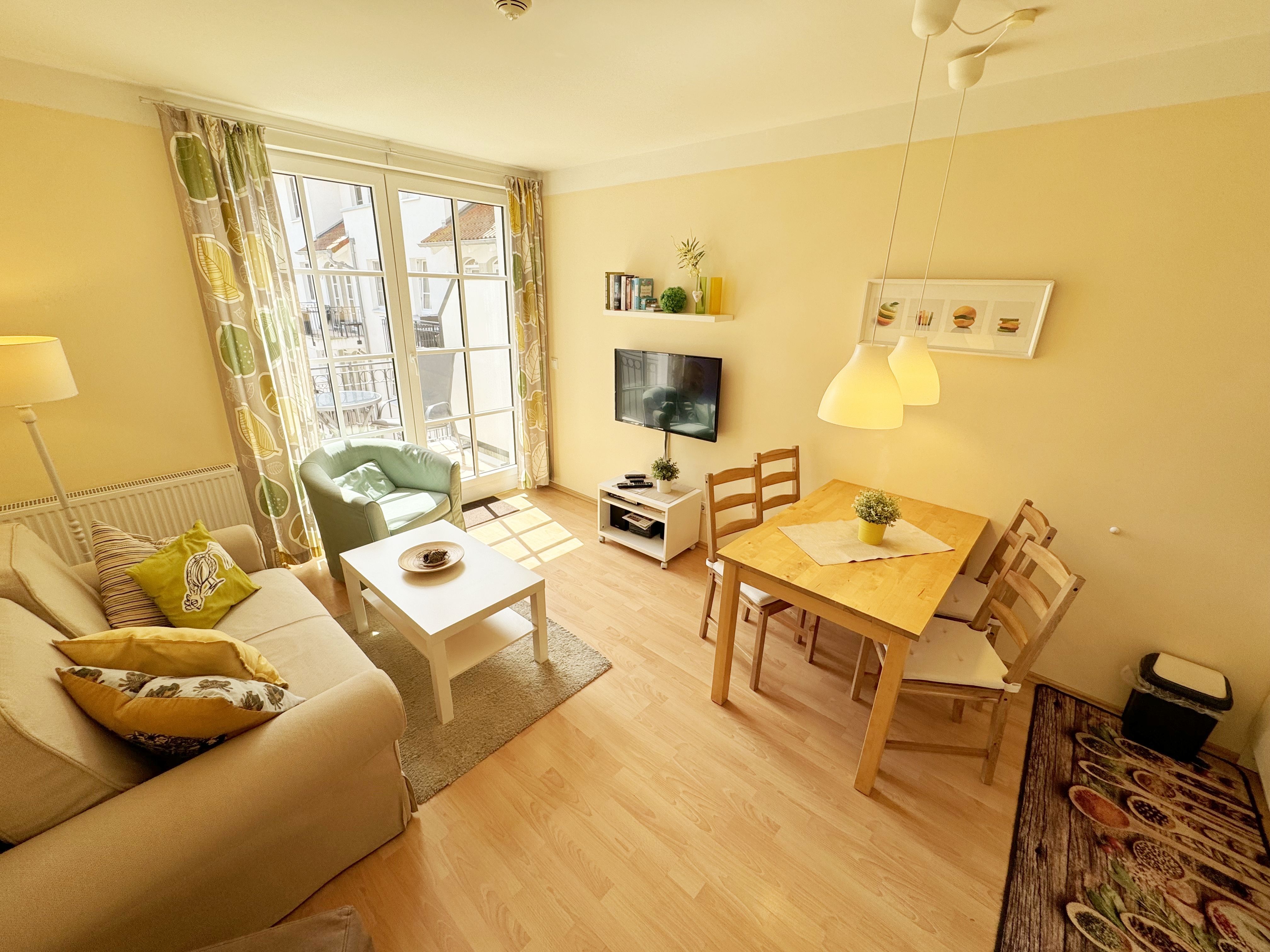 Die geschmackvoll eingerichtete, ca. 40 m² große 2-Raumferienwohnung (Nichtraucher) befindet sich im Haus Meeresblick in Bestlage des Ostseebades Baabe. Die Wohnung Inselparadies 2.09, welche bequem über einen Fahrstuhl erreichbar ist, befindet sich in der zweiten Etage und bietet Platz für 2 bis 3 Personen. Der geräumige Wohnbereich verfügt über eine Couch (Aufbettungsmöglichkeit für 3. Person 1,20m x 1,96m), einen Sessel, einen Couchtisch sowie eine Leselampe. Der technische Bereich wird durch einen Flachbild-TV, eine Mini-Stereoanlage mit CD und DVD-Player abgerundet. Auch auf einen Internetanschluss (WLAN) brauchen Sie nicht verzichten. Dieser ist für Sie inklusive. Angrenzend zum Wohnbereich befinden sich eine gemütliche Essecke mit Holztisch und 3 Stühlen sowie eine im nordischen Stil angelehnte Küchenzeile mit diversen Küchenutensilien. Hochwertige Geräte wie ein 2-Zonenceranfeld, Kühlschrank mit Gefrierfach, Geschirrspüler, Mikrowelle, Kaffeemaschine, Wasserkocher, Toaster gehören selbstverständlich dazu. Das komfortable Schlafzimmer ist mit einem Doppelbett (1,60m x 2,00m) welches hochwertige Matratzen und verstellbare Lattenroste beinhaltet sowie 2 Nachttischlampen, einen Flachbild-TV, Radiowecker und einem Kleiderschrank eingerichtet. Der nach Süden ausgerichtete Balkon verfügt über eine Bestuhlung sowie einen Sonnenschirm, welchen Sie vom Wohnbereich aus erreichen. Im Badezimmer befindet sich eine ebenerdige Dusche, ein WC, Fön und ein Handtuchheizkörper. Darüber hinaus stehen Ihnen ein Bügelbrett und ein Bügeleisen zur Verfügung. Mit einem eigenen Schlafplatz ist 1 Haustier gegen eine Gebühr ein gern gesehener Gast. Ein eigener PKW-Stellplatz Nr. 84 (Einfahrtshöhe 2,00m) befindet sich in der Tiefgarage des Hauses. Im Keller des Hauses haben Sie die Möglichkeit eine Waschmaschine/Trockner gegen Gebühr zu nutzen. Ihre mitgebrachten Fahrräder oder auch geliehenen können am Objekt abstellen. Mit dem Fahrstuhl des Hauses A gelangen sie in das Untergeschoss der Meeresblickanlage, wo Sie ein großzügiger und heller Wellnessbereich erwartet. Hier können sie in einem Pool kleine Bahnen schwimmen, in 2 Saunen Ihren Kreislauf in Schwung bringen, in einem dazugehörigen Ruheraum Ihren Körper wieder beruhigen, in einer Schneckendusche sowie weiteren Duschen das kühle Nass genießen und auf einer Außenterrasse mit Außendusche die frische Luft einatmen. Die Erstausstattung eines Wäschepaketes (komplette Bettwäsche, 1 Duschhandtuch, 2 kleine Handtücher) können Sie bis 14 Tage vor Anreise gegen einen Aufpreis dazu buchen oder durch eigene ergänzen. Ab 2 gebuchten Paketen erhalten Sie einmalig 1 Geschirrhandtuch und 1 Duschvorleger hinzu.