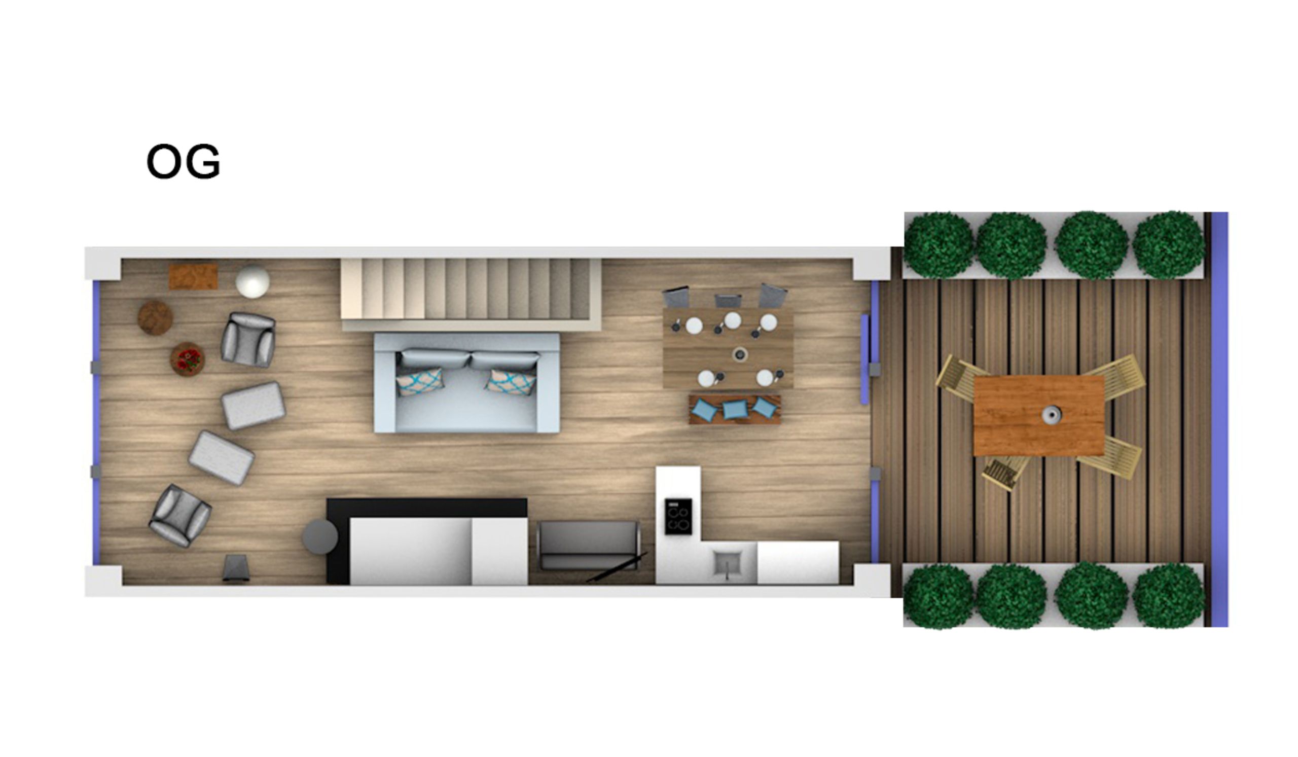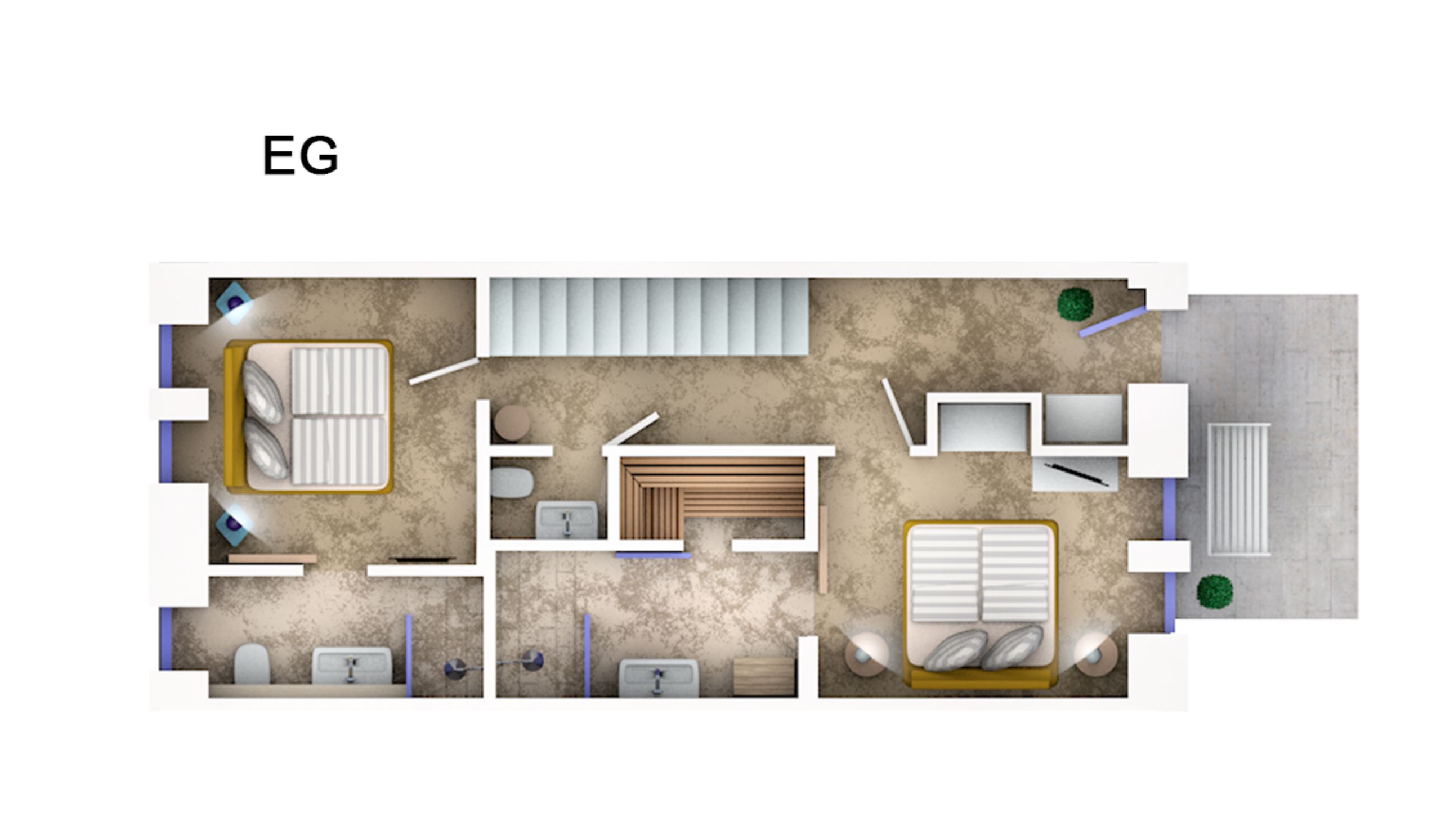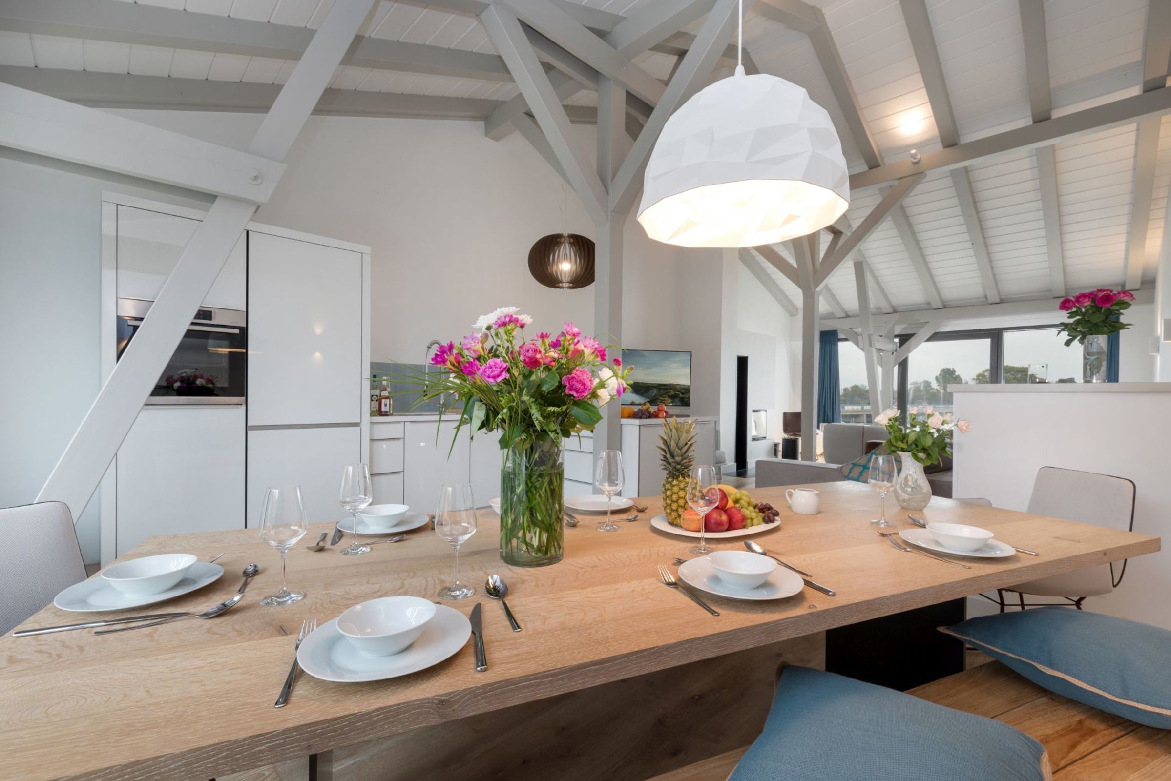 Während sich der großzügige Schlafbereich im Erdgeschoss befindet, beeindruckt der Wohnbereich im Obergeschoss mit bis zu vier Meter hohen Decken. Das luxuriöse Interieur wird durch die komplett ausgestattete Küche, drei HDTV-Fernseher, eine HiFi-Anlage, Designermöbel und natürlich einen Internetzugang per WLAN abgerundet.