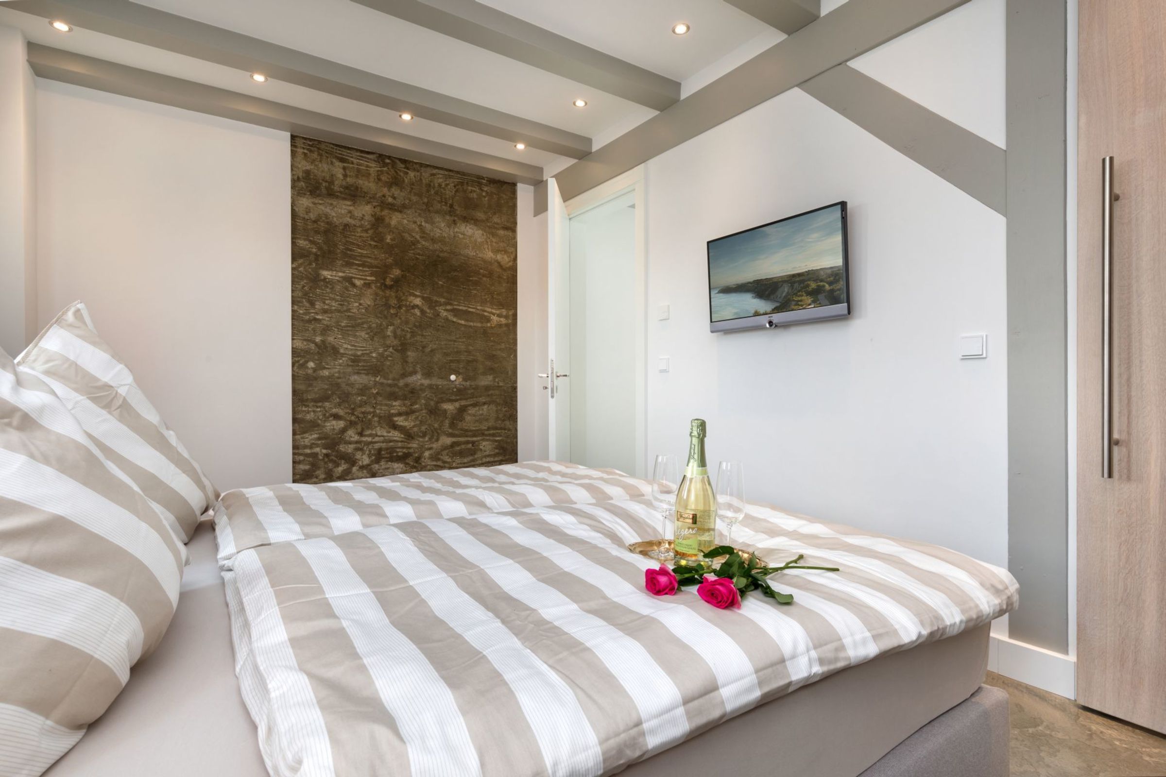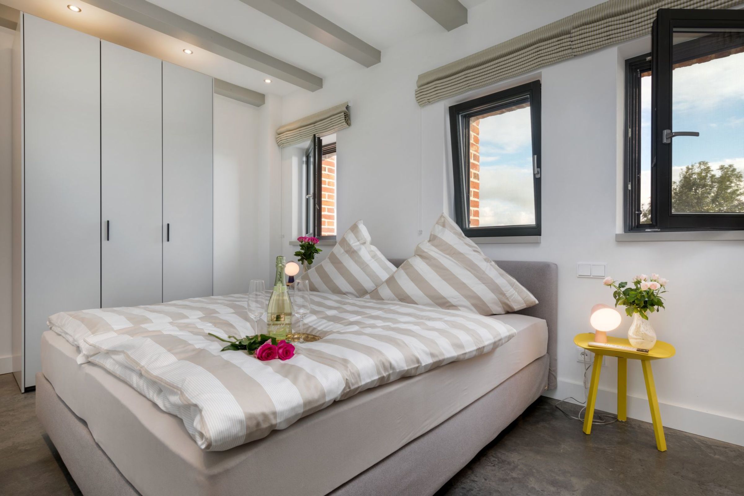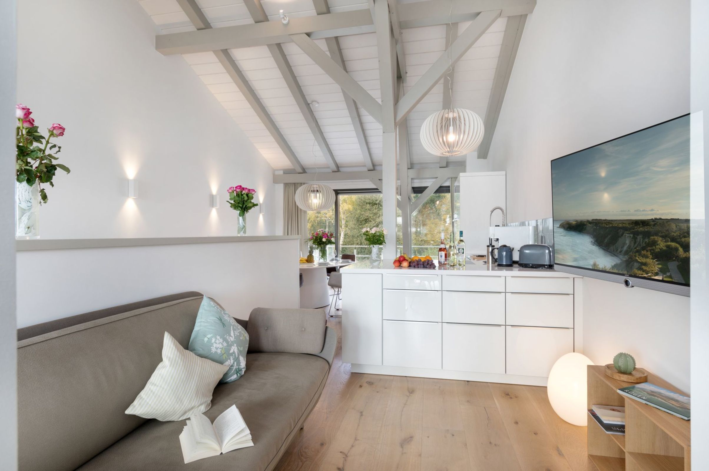 Vor allem aber hat die Aussicht vom Wohnzimmer aus ihren Reiz, denn dort kann man seinen Blick über den Ausläufer der Ostsee schweifen lassen. Der Balkon auf der Westseite lädt darüber hinaus dazu ein, die Sonnenstrahlen ganz entspannt zu genießen.