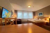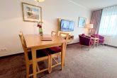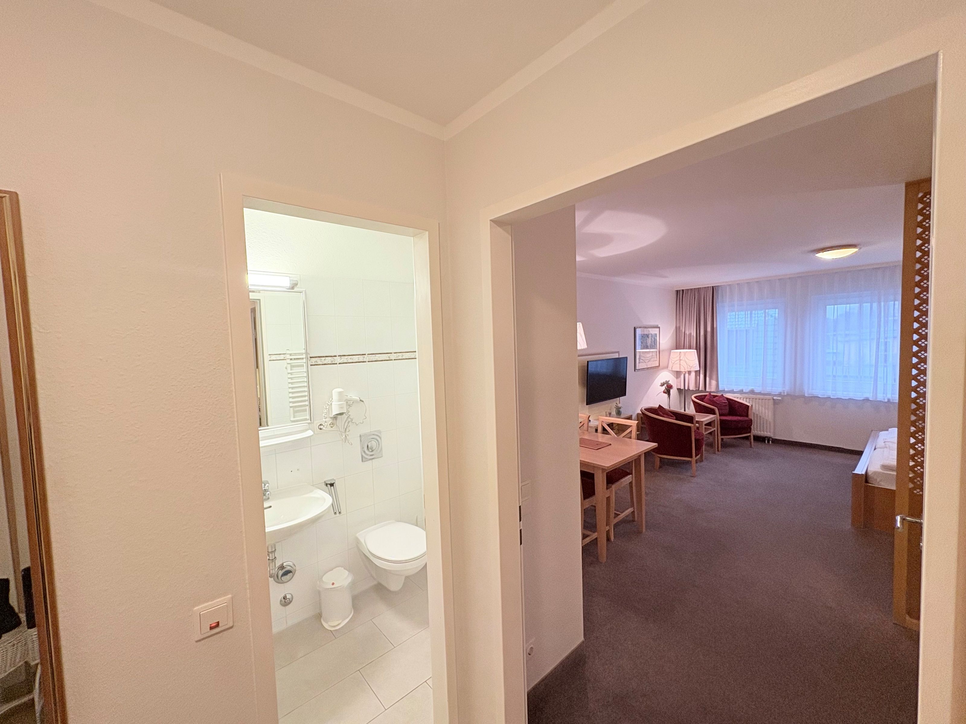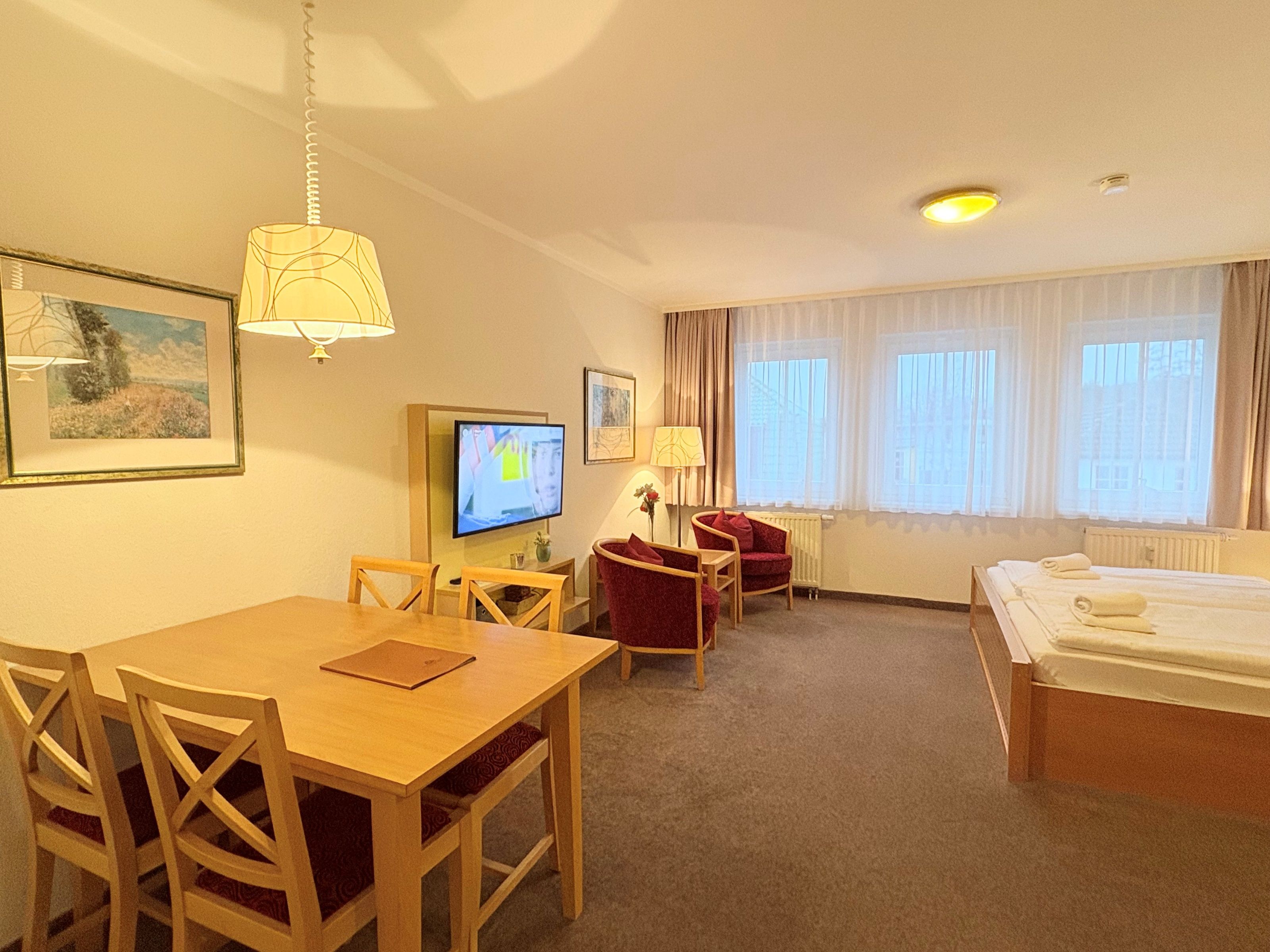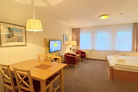 Die 33 qm große Ferienwohnung in der zweiten Etage besteht aus einem kombinierten Wohn- und Schlafraum. Die Wohnung verfügt über ein Doppelbett und einen Esstisch mit 4 Stühlen. Eine kleine Sitzecke mit zwei Sesseln, Flachbild-TV und HiFi-Anlage sorgen für gemütliche Stunden. Die Wohnung ist mit einer Küchenzeile mit 4-Platten-Herd mit Backofen, Mikrowelle, Wasserkocher, Toaster und Kaffeemaschine ausgestattet. Das Bad mit DU/WC und Fön rundet den Komfort der Wohnung ab. Ein Kinderbett mit Wäsche sowie ein Hochstuhl können auf Anfrage gegen eine Gebühr von einmalig 50 € vom Verwalter zur Verfügung gestellt werden.
