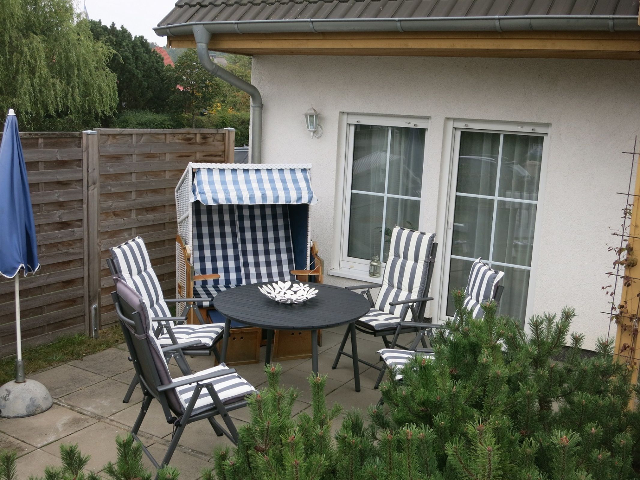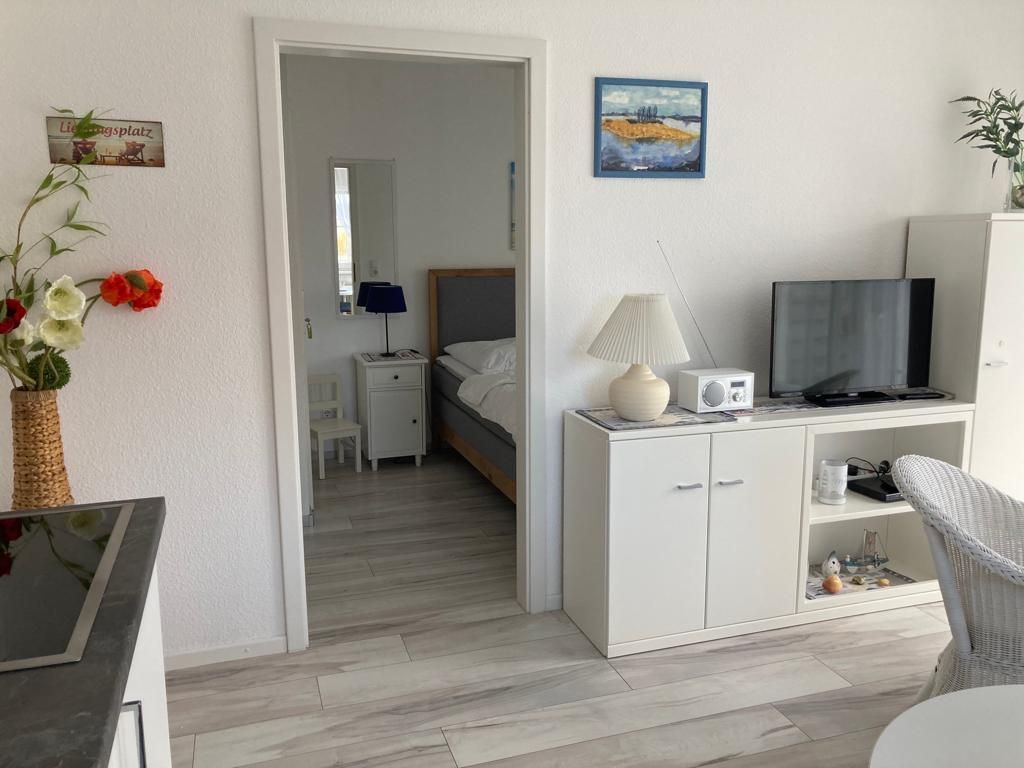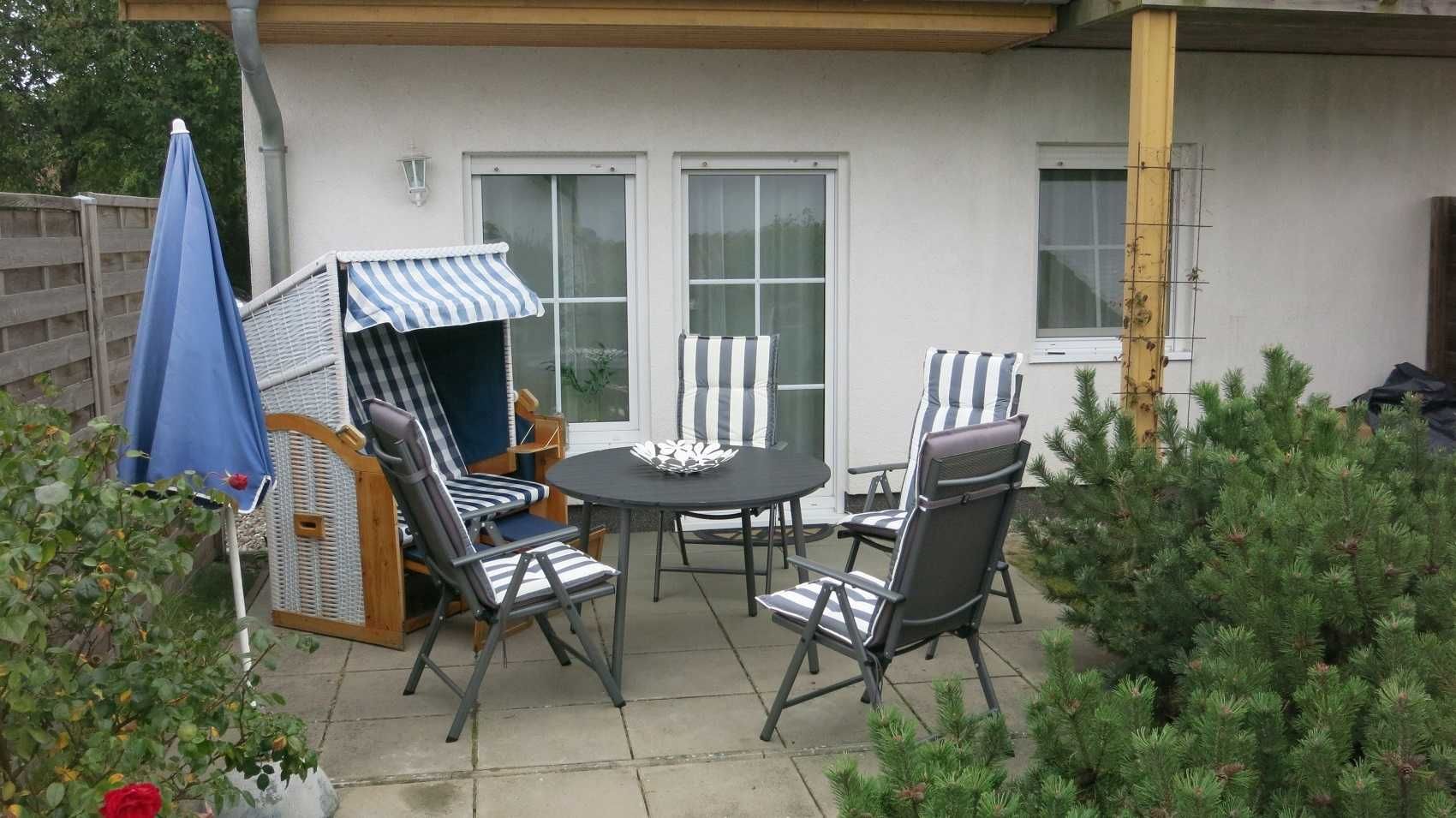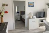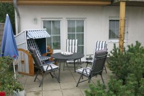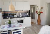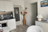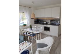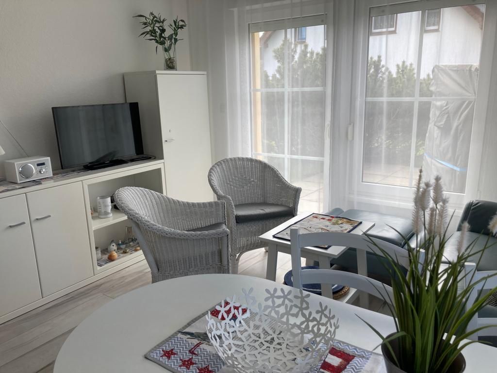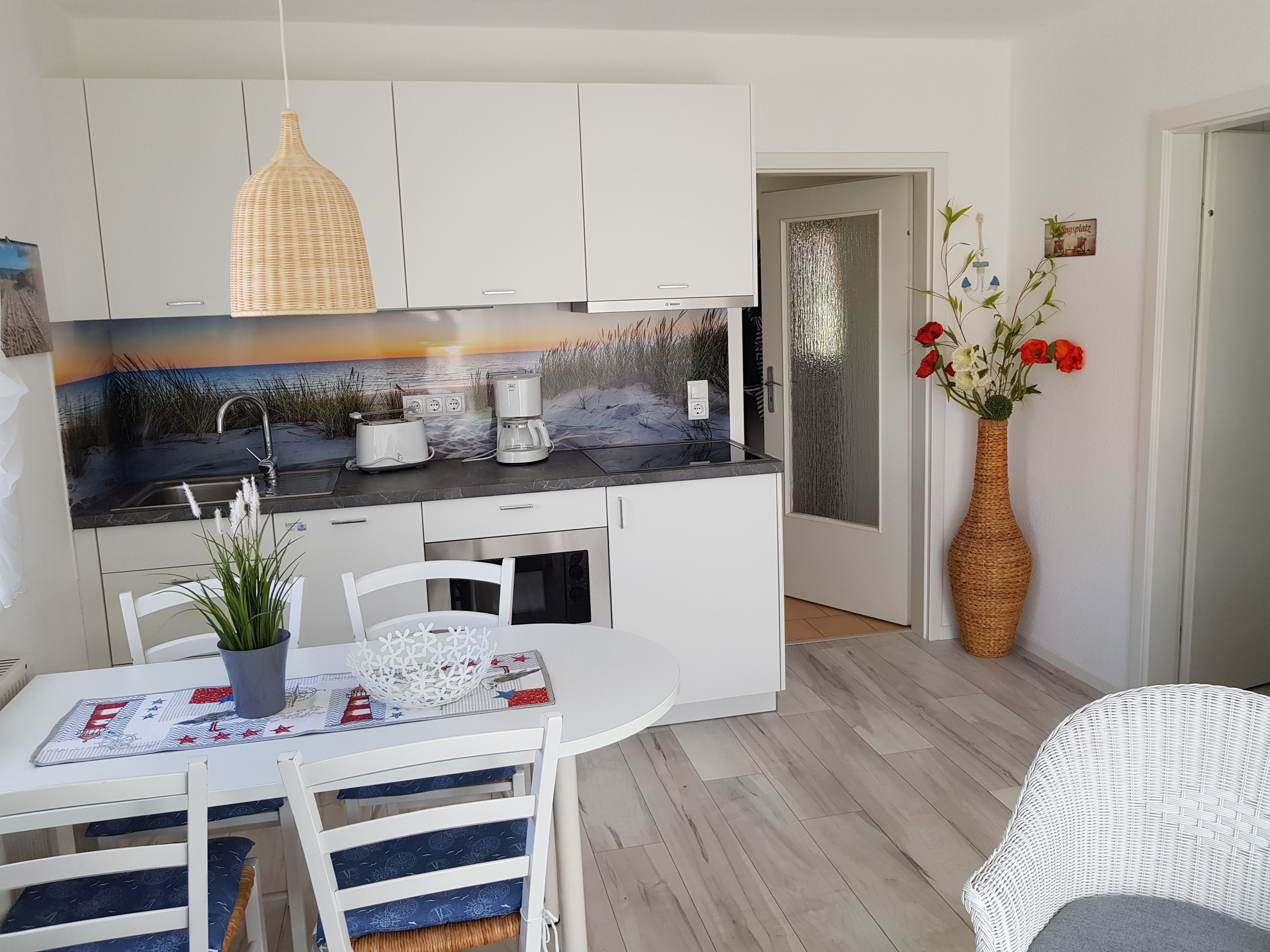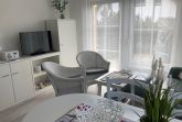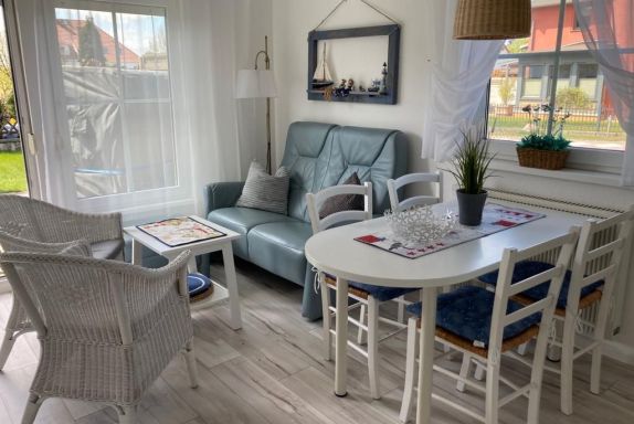3-Zimmer Ferienwohnung im Erdgeschoss einer liebevoll angelegten Ferienanlage. Die Ferienwohnung ist im Wohnbereich ausgestattet mit einer gemütlichen Couch und einer offenen Küche mit Essbereich.