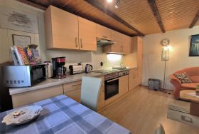 Die Ferienwohnug Mohnkopf ist praktisch ausgestattet und als kleine Unterkunft mit zwei oder - bei Aufbettung des Schlafsofas im Wohnbereich - mit bis zu vier Personen bewohnbar (das Bett im Schlafzimmer ist 1,40 x 2,00 m). Die Küchenzeile im Wohnzimmer ist mit Herd, Mikrowelle, Spülmaschine und Geschirr etc. gut ausgestattet,  es gibt auch einen kleinen Esstisch. Vom Wohn-/Esszimmer aus gehen das kleine Schlafzimmer und das Bad mit Dusche, Toilette und Waschtisch ab. Vor der Eingangstür im Innenhof des Gebäudekomplexes gibt es einen Terrassenbereich mit Blick auf den Garten. Die Wohnung liegt im Hinterhof eines Einfamilienhauses: durch das Carport führt der Weg in den Innenhof mit einem Anbau, in dem neben der Ferienwohnung auch die Wohnung der Gastgeber liegt.