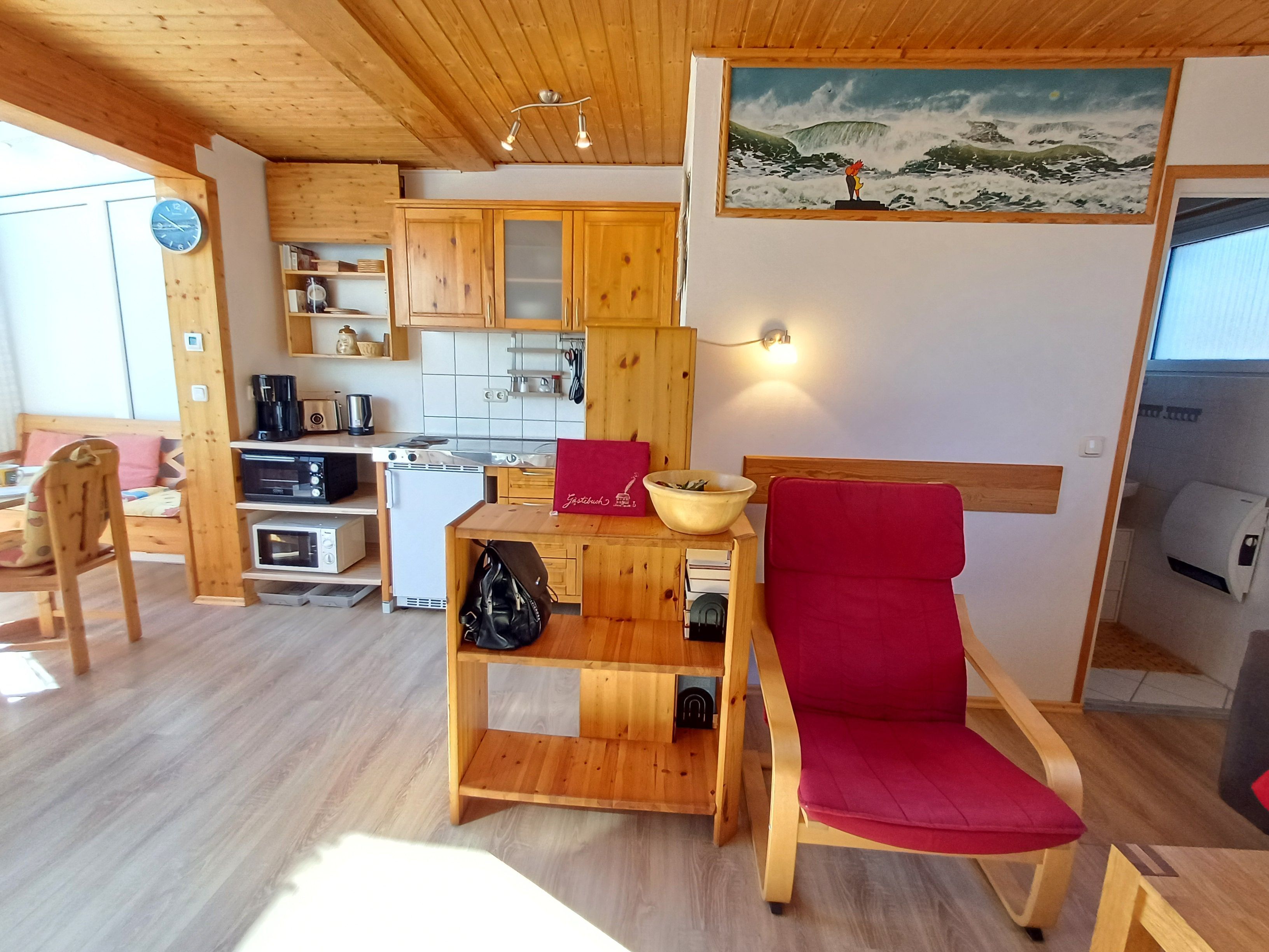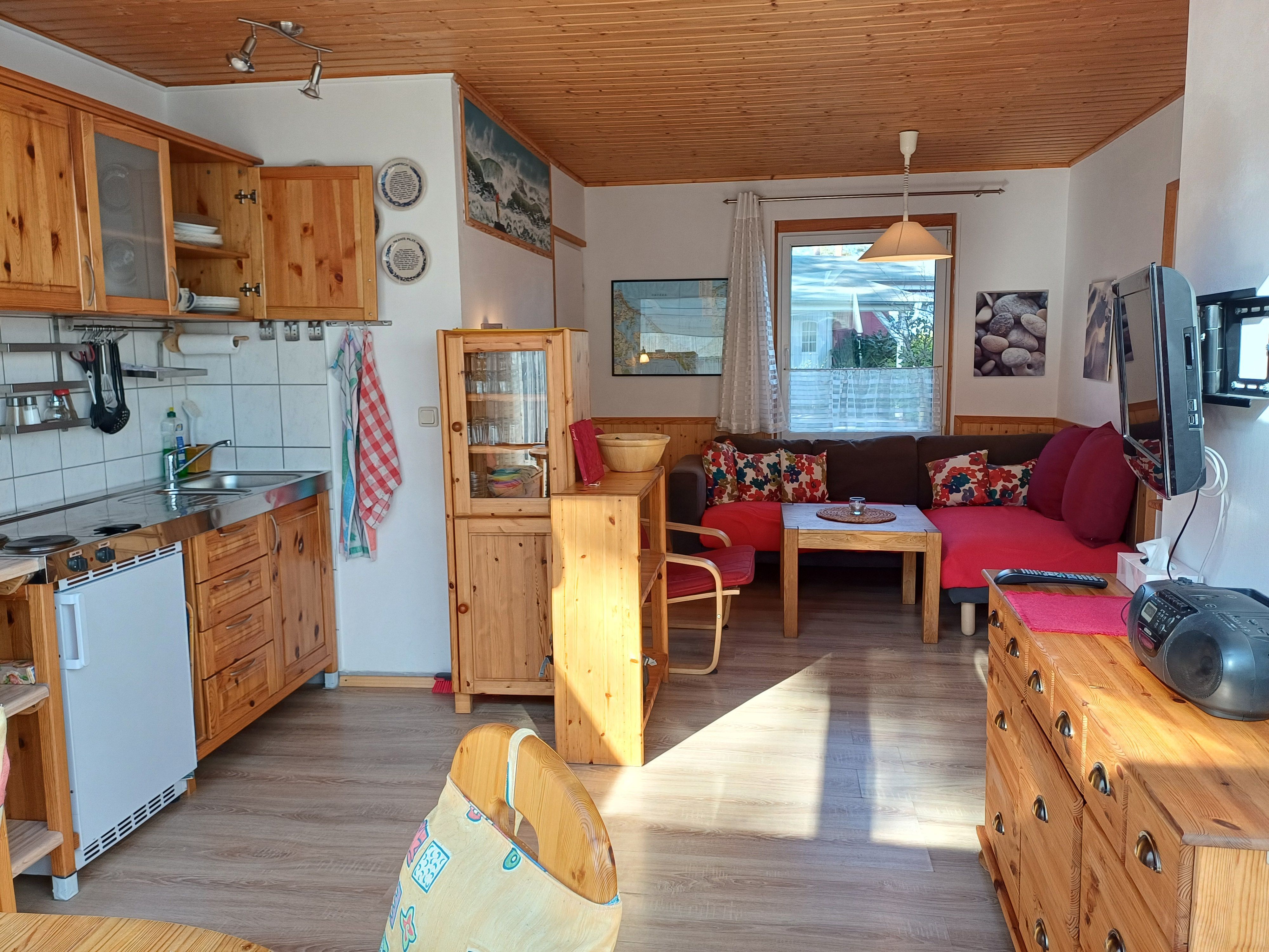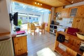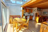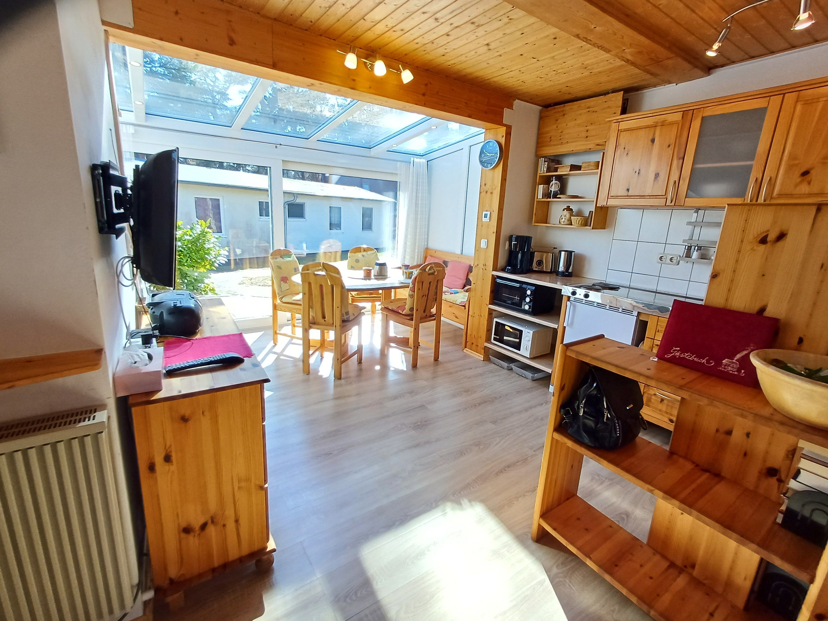 1 Wohnraum mit Ecksitzgruppe und Sessel, Küchenzeile und Essplatz im Wintergarten
