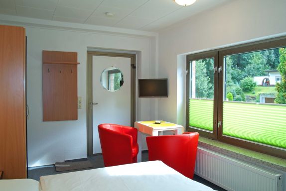 Das kleine Schlafzimmer „Seestern“ (ca.18 qm) befindet sich im Parterre im Wohnhaus und verfügt über ein Badezimmer mit Dusche/WC, einer kleinen Miniküche ohne Kochfeld und Sitzecke. Die Miniküche ist mit Kühlschrank (ohne Gefrierfach) ausgestattet. Kochutensilien, Kaffeemaschine, Eierkochen, Wasserkocher und Toaster sind ebenso, wie ausreichend Geschirr und Besteck vorhanden.