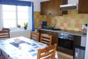 Die Hofwohnung (50 qm) befindet sich ebenfalls im Obergeschoss des Bauernhauses mit Blick auf den Hof und ist einfach und funktional ausgestattet. Sie besteht aus einem Wohnzimmer mit Sitzecke, offener Küche mit Esstisch (ohne Geschirrspüler), einem Schlafzimmer mit Doppelbett und einem Schlafzimmer mit Etagen- und Einzelbett sowie einem Duschbad.