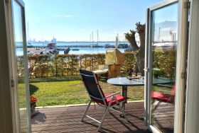 Die hochwertige Nichtraucher-Ferienwohnung ist mit hellen Bodenfliesen ausgestattet und bietet durch die großzügige Fensterfront einen einzigartigen Panorama-Blick auf die Silhouette von Stralsund. Die Terrasse und kleiner Garten schließen sich an und sind nach Südwesten ausgerichtet.