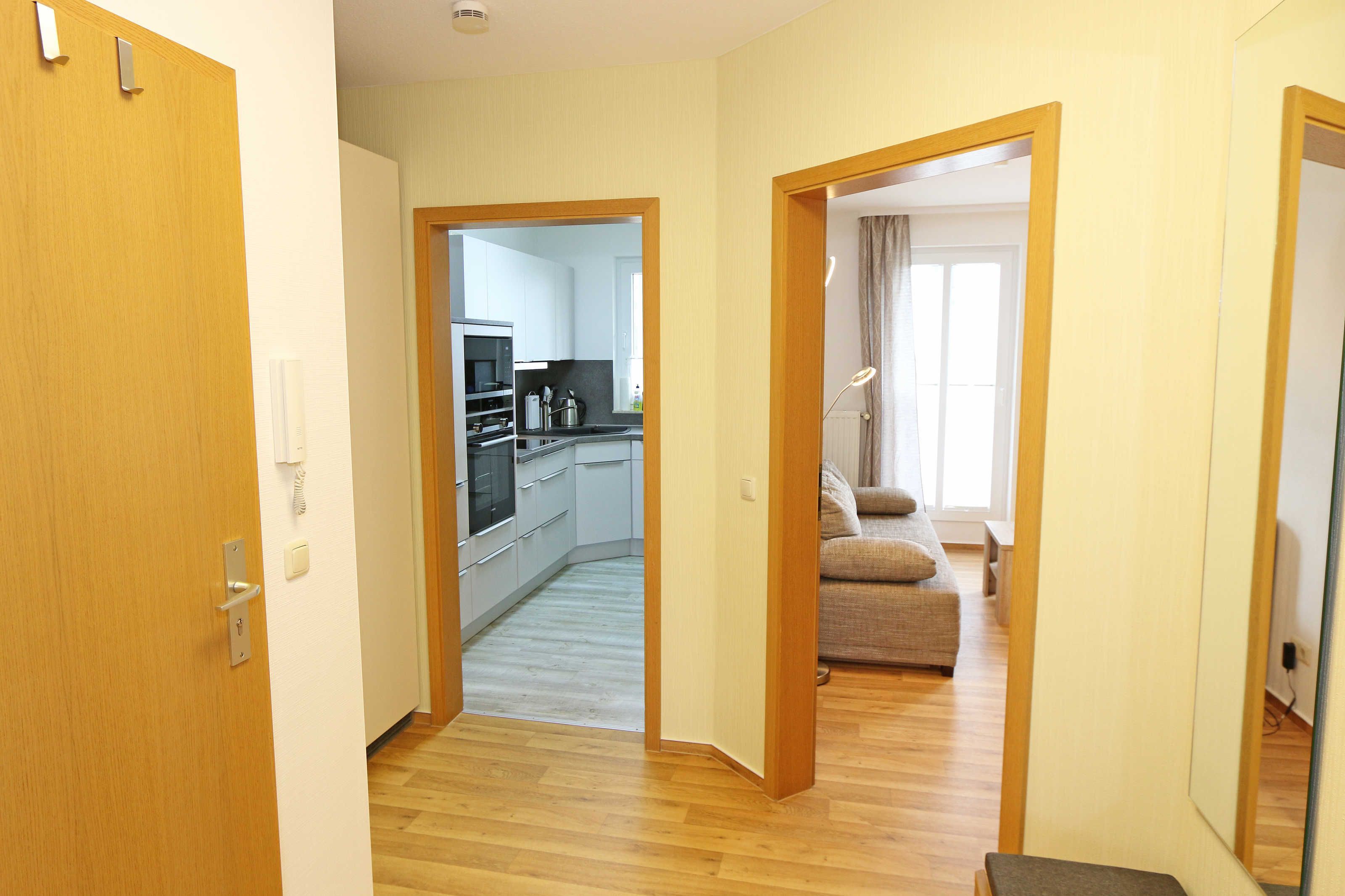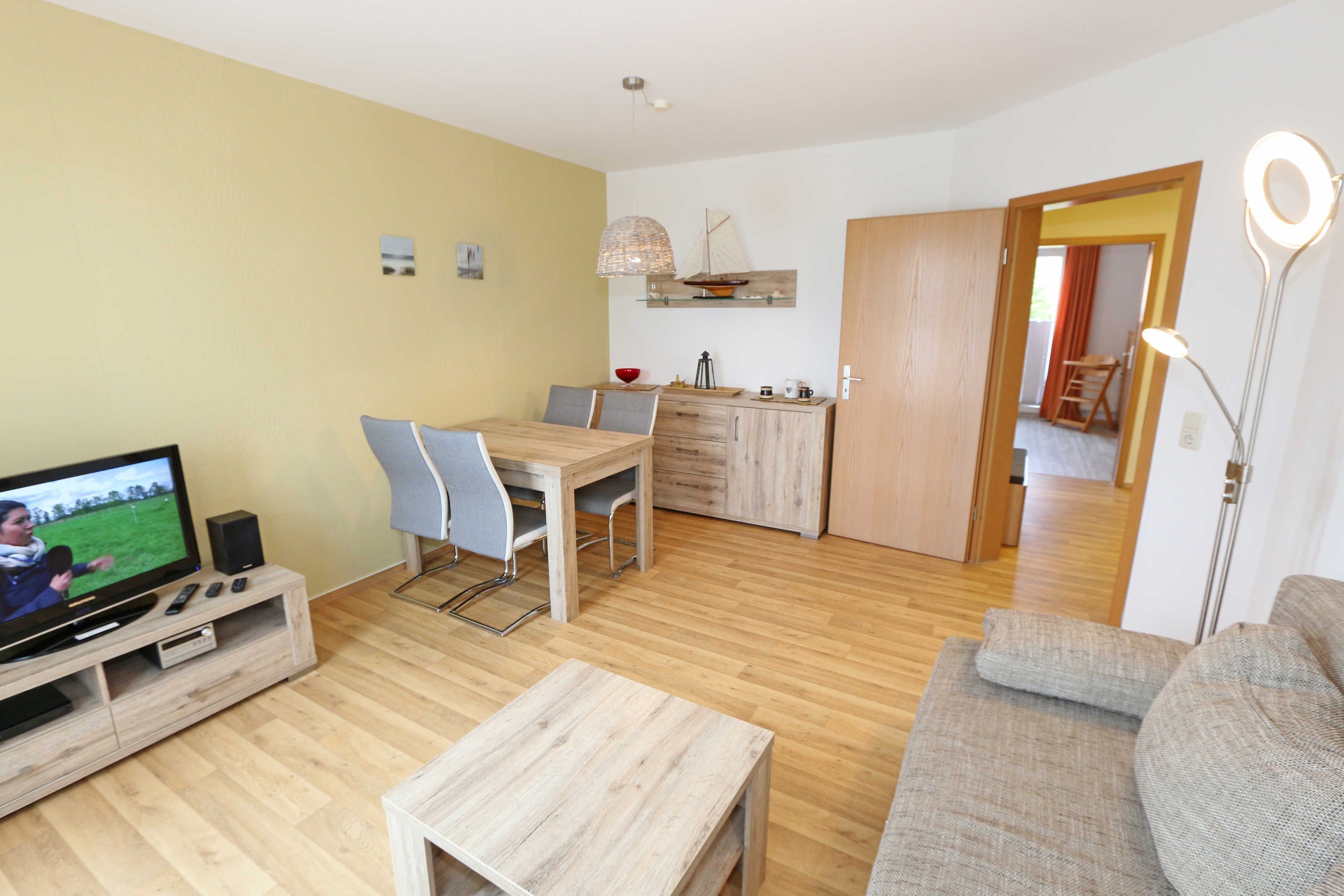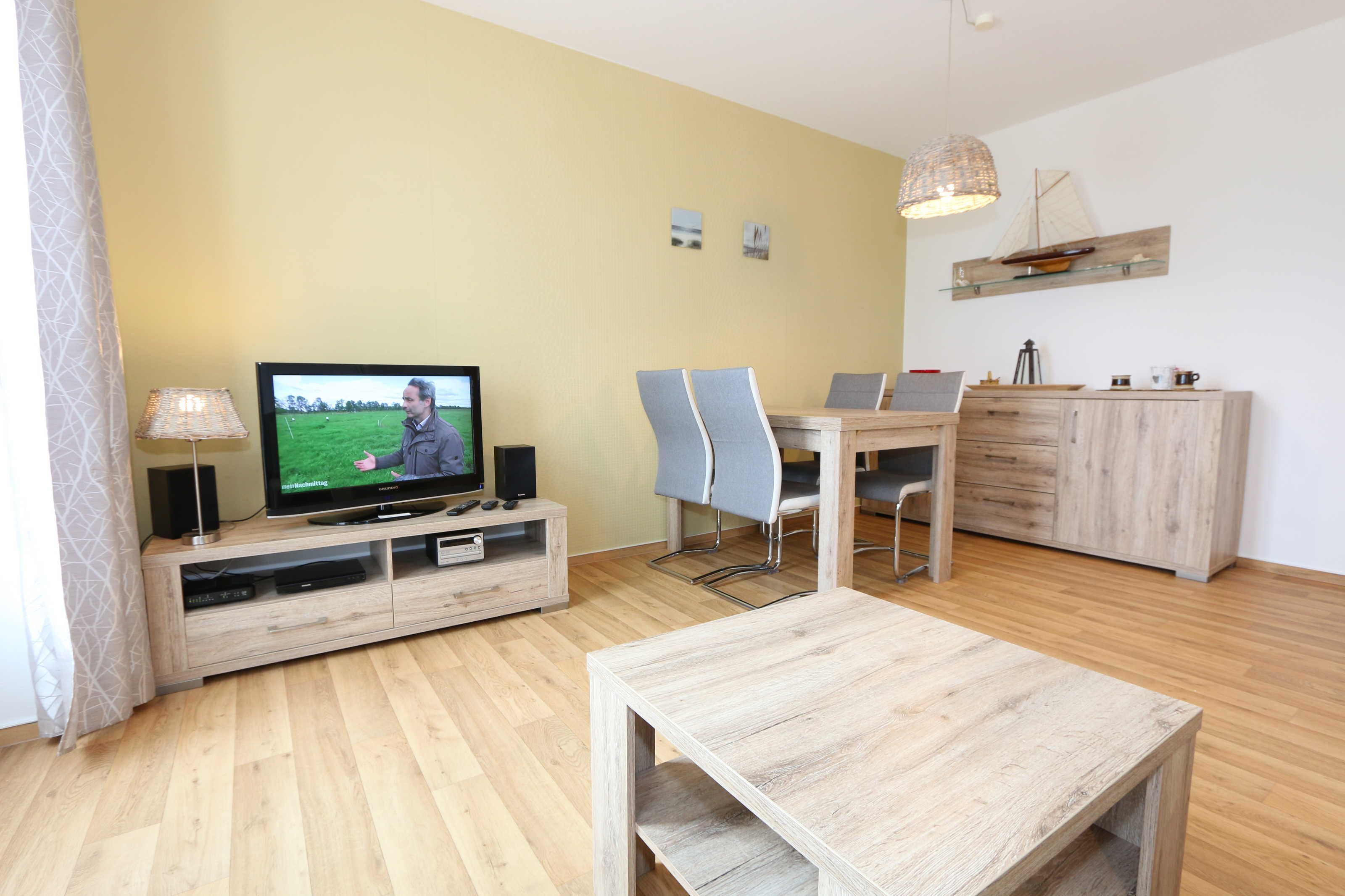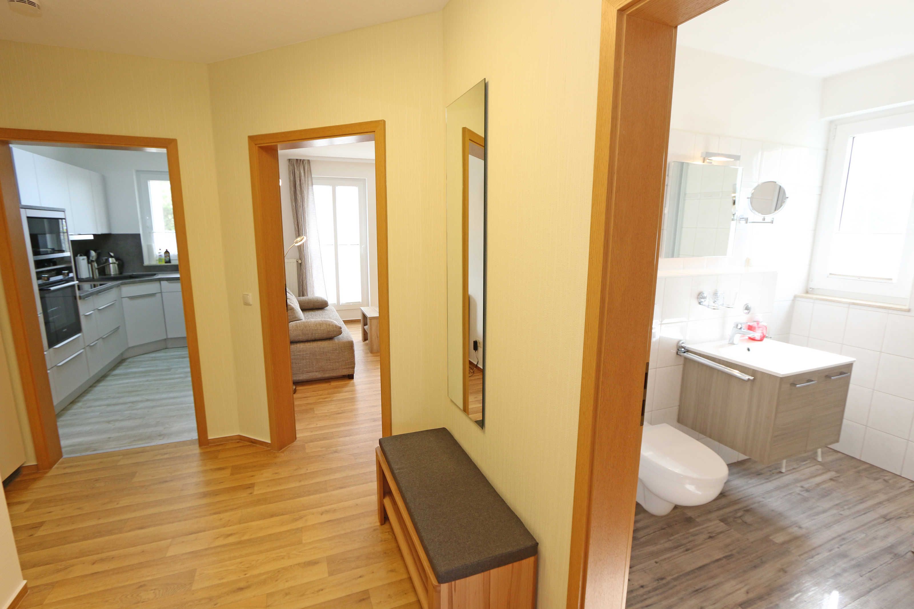 Die gemütliche 2-Zimmerwohnung (Nichtraucher) befindet sich im modernen Anbau der Villa Vineta im 1. Obergeschoss. Die Wohnung ist mit einem Bodenbelag in Holzoptik sowie hellen Wohnzimmermöbeln ausgestattet. Mit ihren ca. 56 qm bietet Ihnen die Wohnung ausreichend Platz für 2 bis 4 Personen. Der Wohnbereich wird durch eine hochwertige Schlafcouch (1,60 m x 2,00 m, Aufbettungsmöglichkeit für 3./4. Person) mit Couchtisch, Leselampe, kleinem Sideboard mit Smart-TV mit Sky (Auswahl von Sport, Film, Dokumentation), Blu-Ray-Player und einer Mini-Stereo-Anlage mit CD-Player und DAB-Radio abgerundet. Auf einen Internetzugang (WLAN) brauchen Sie nicht zu verzichten. Dieser ist inklusive für Sie. Der gemütliche Essplatz mit 4 Stühlen passt sich dem Wohnbereich an. Von hier aus erreichen Sie den teilüberdachten und bestuhlten Südbalkon, von dem Sie einen Meerblick in Richtung Südstrand und der Halbinsel Mönchgut haben. Die separate neu renovierte Küche ist komplett mit Backofen, Induktionsfeld, Mikrowelle, Geschirrspüler, Kühlschrank mit Gefrierschrank, Kaffeemaschine, Toaster, Wasserkocher und diversen Küchenutensilien ausgestattet. Das ruhig nach Norden gelegene Schlafzimmer verfügt über ein Doppelbett (1,80 m x 2,00 m) mit verstellbaren Lattenrosten, Nachttischkonsolen sowie einem Kleiderschrank und ein Smart-TV (nur Internet TV möglich). Ein Kinderreisebett kann hier aufgestellt werden. Das Schlafzimmer und der Wohnbereich sind mit Verdunklungsplissees versehen. Das geflieste Tageslichtbad ist mit einem Waschtisch, Kosmetikspiegel, Fön, WC und Dusche ausgestattet. Ein PKW-Stellplatz (Nr. 12) gehört zur Wohnung und befindet sich hinter dem Haus. 1x Hochstuhl und 1x Kinderreisebett (ohne Zusatzmatratze, ohne Bettinlett) sind für unsere kleinen Gäste inklusive. Für Ihre geliehenen oder auch mitgebrachten Fahrräder stehen Ihnen ein Fahrradständer sowie ein Fahrradkeller zur Verfügung. 1 Haustier ist gegen eine Gebühr ein gern gesehener Gast. Die Erstausstattung eines Wäschepaketes (komplette Bettwäsche, 1 Duschhandtuch, 2 kleine Handtücher) können Sie bis 14 Tage vor Anreise gegen einen Aufpreis dazu buchen oder durch eigene ergänzen. Ab 2 gebuchten Paketen erhalten Sie einmalig 1 Geschirrhandtuch und 1 Duschvorleger hinzu.