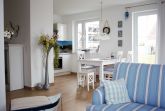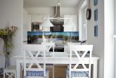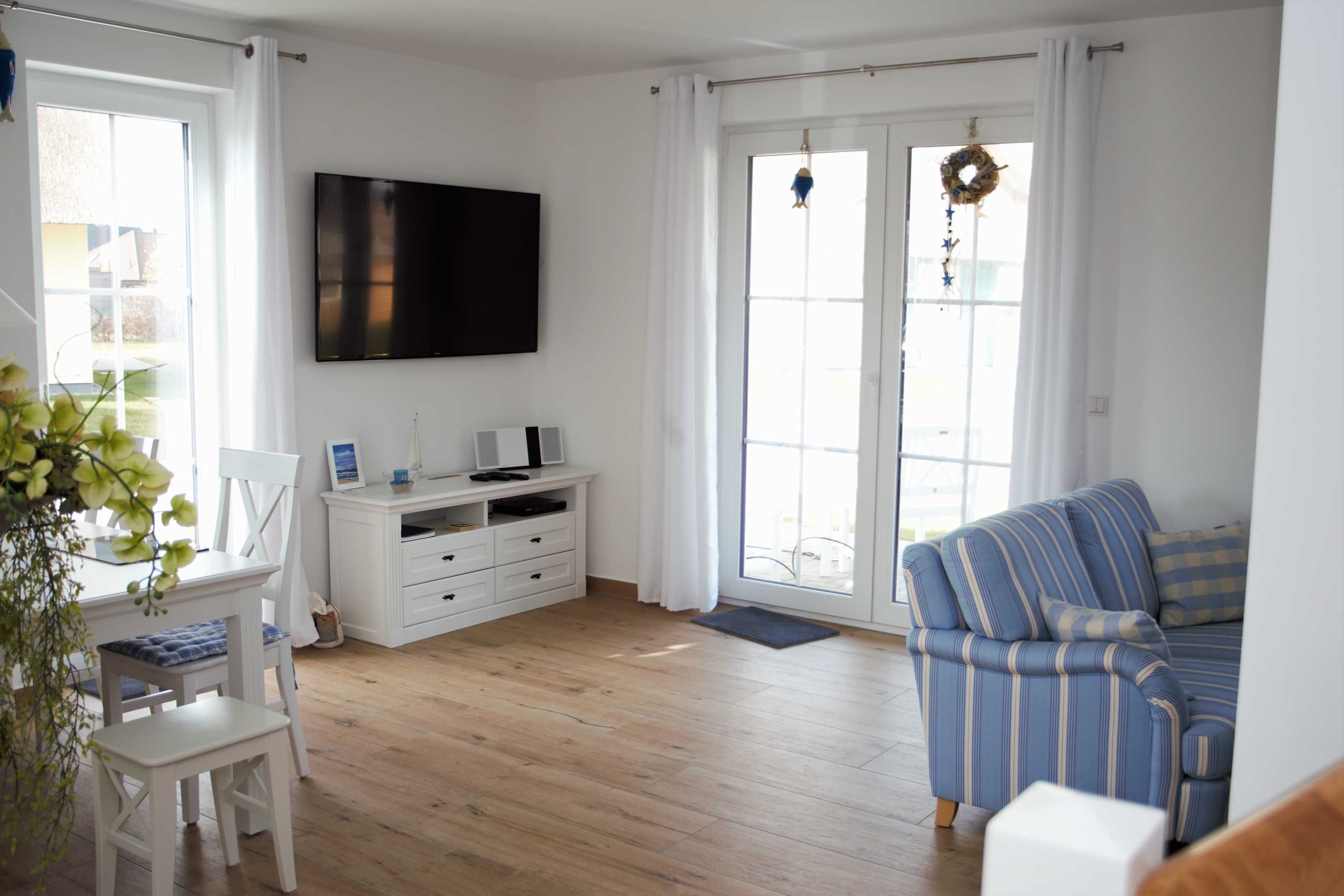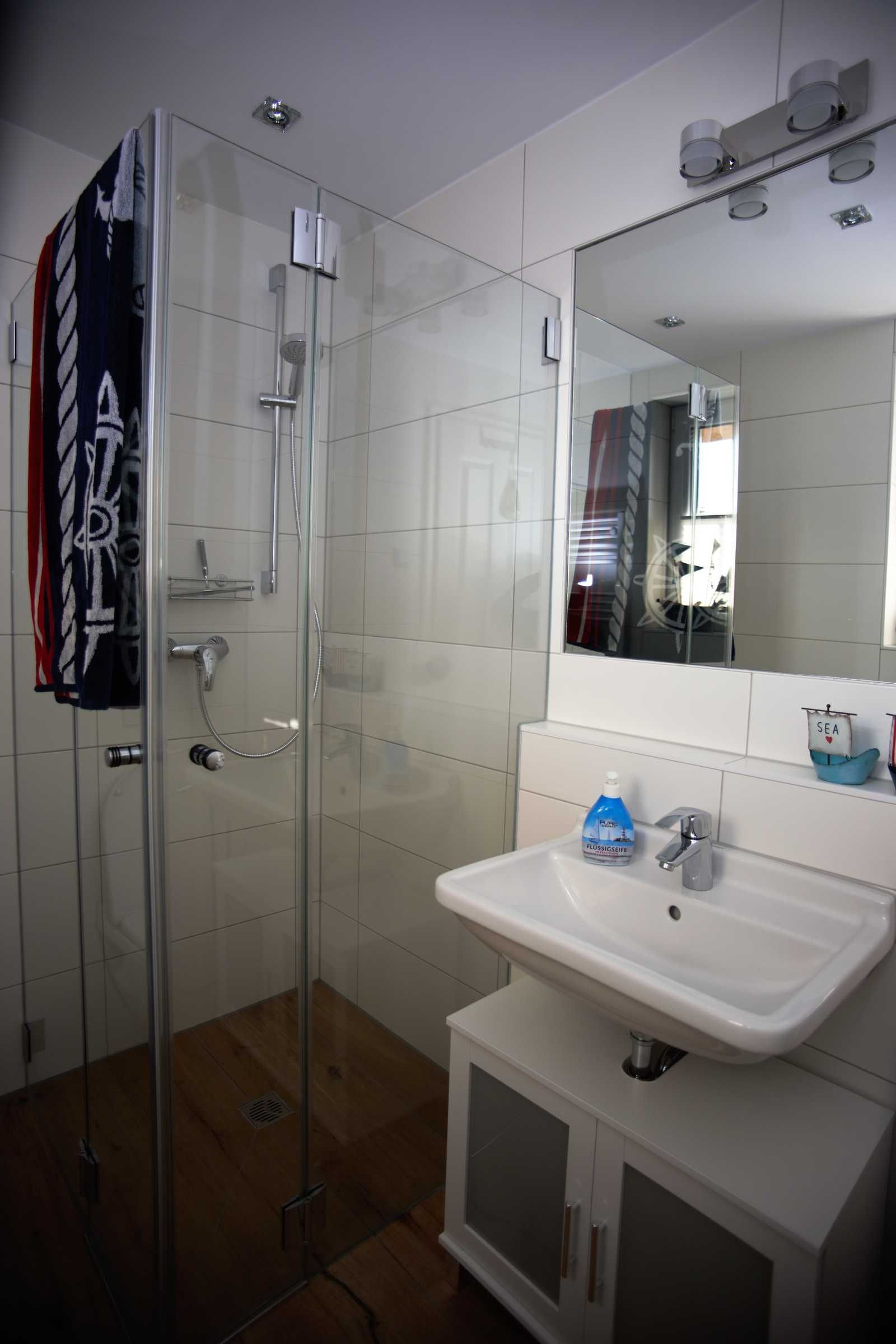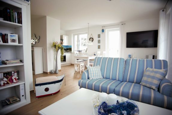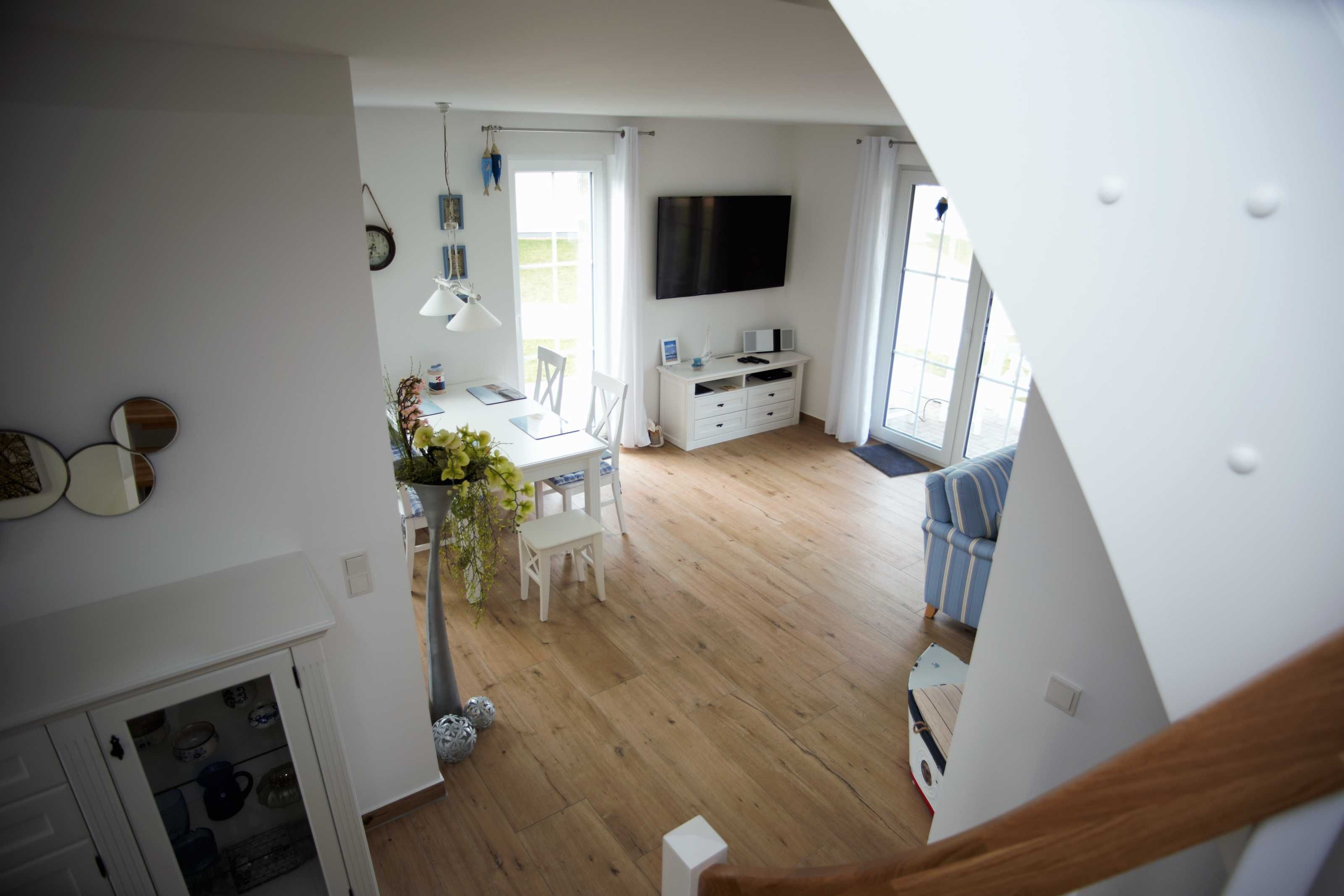 Im Erdgeschoss befindet sich der großzügig gestaltete Wohnbereich mit integrierter Küche und ein Duschbad. Der maritim eingerichtete Wohnbereich eignet sich ideal zum Entspannen nach einem ausgedehnten Strandspaziergang. Die modernen Elektronikgeräte wie wandhängender ein 60-Zoll-Flat-TV, ein Blu-ray-Player, ein DAB-Radio oder ein Spieleabend mit der Familie lassen die Zeit spaßig verfliegen. Die moderne Einbauküche sowie diverse Küchengeräte wie Geschirrspüler, Toaster, Kaffeemaschine, Wasserkocher, Mikrowelle, Herd mit Cerankochfeld, Backofen und Kühl-Gefrierkombination bieten ambitionierten Hobbyköchen auch im Urlaub die Möglichkeit Essen nach eigenen Wünschen zu kochen. Die Küche ist großzügig mit Ess- und Kochgeschirr, Besteck und Gläsern ausgestattet. Im hell gefliesten Duschbad mit Echtglasdusche, großem Waschtisch mit Unterschrank, darüber eingefliestem Wandspiegel, WC, Föhn und Handtuchtrockner wird Hygiene zum Spaß.
