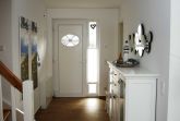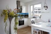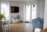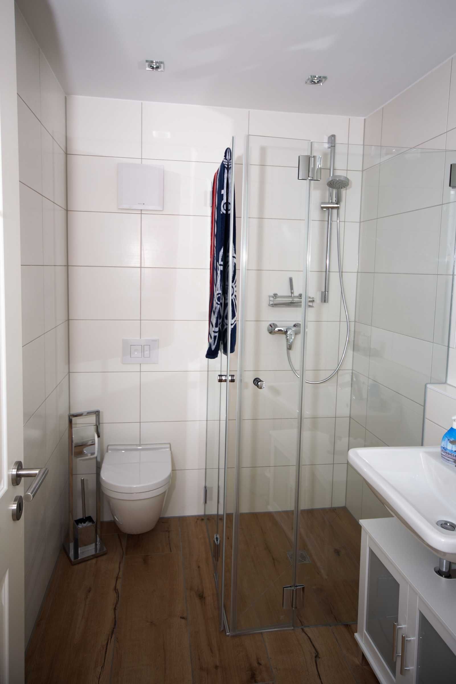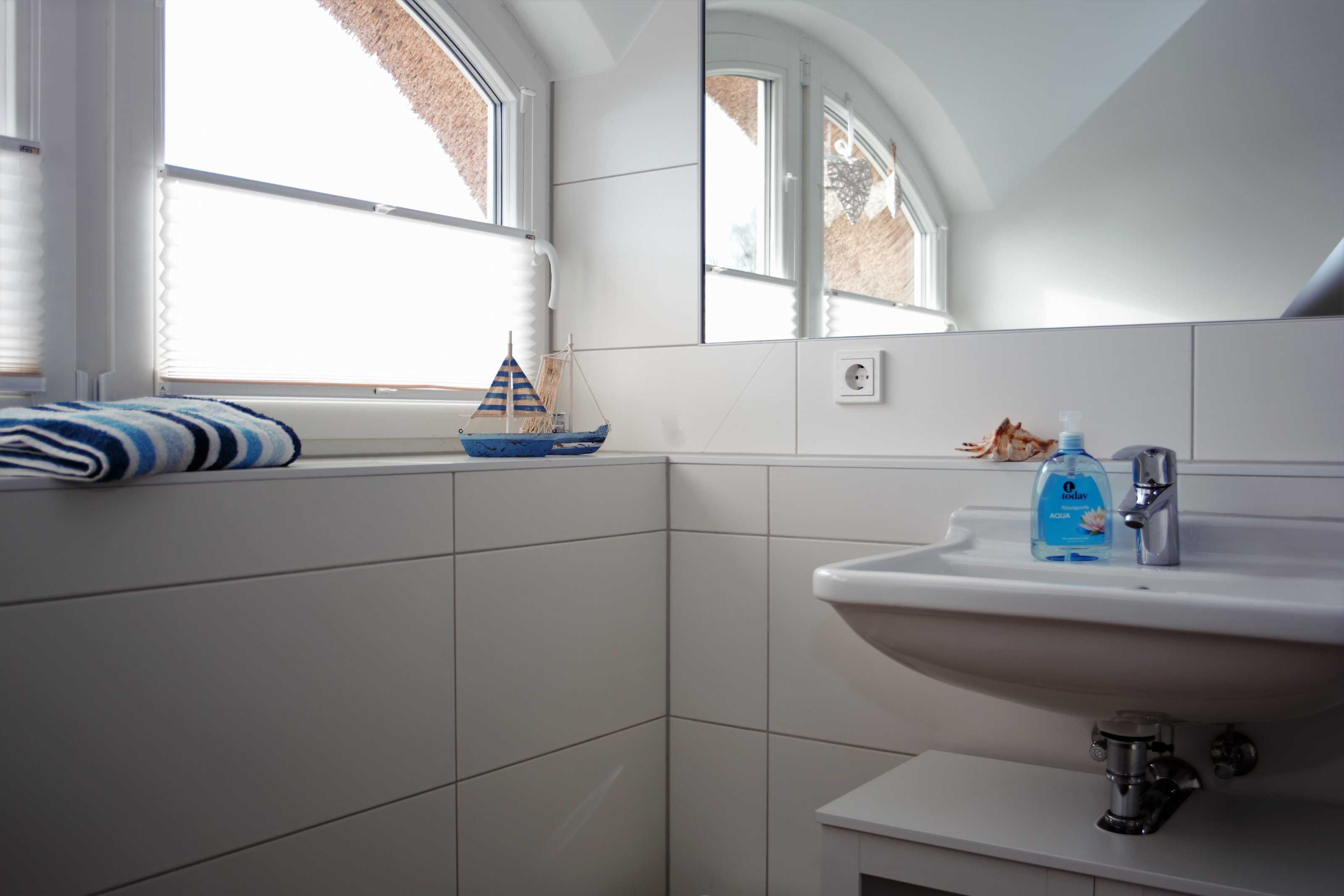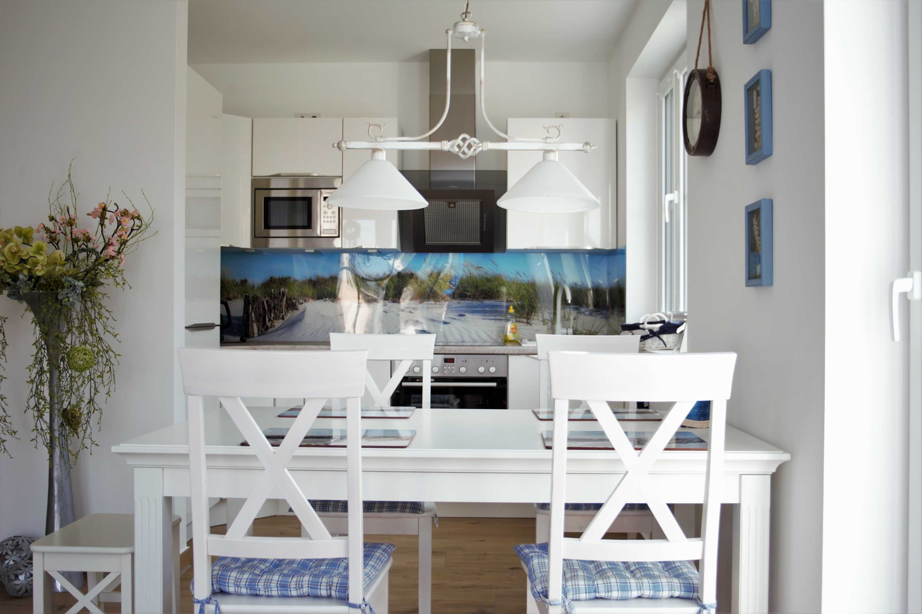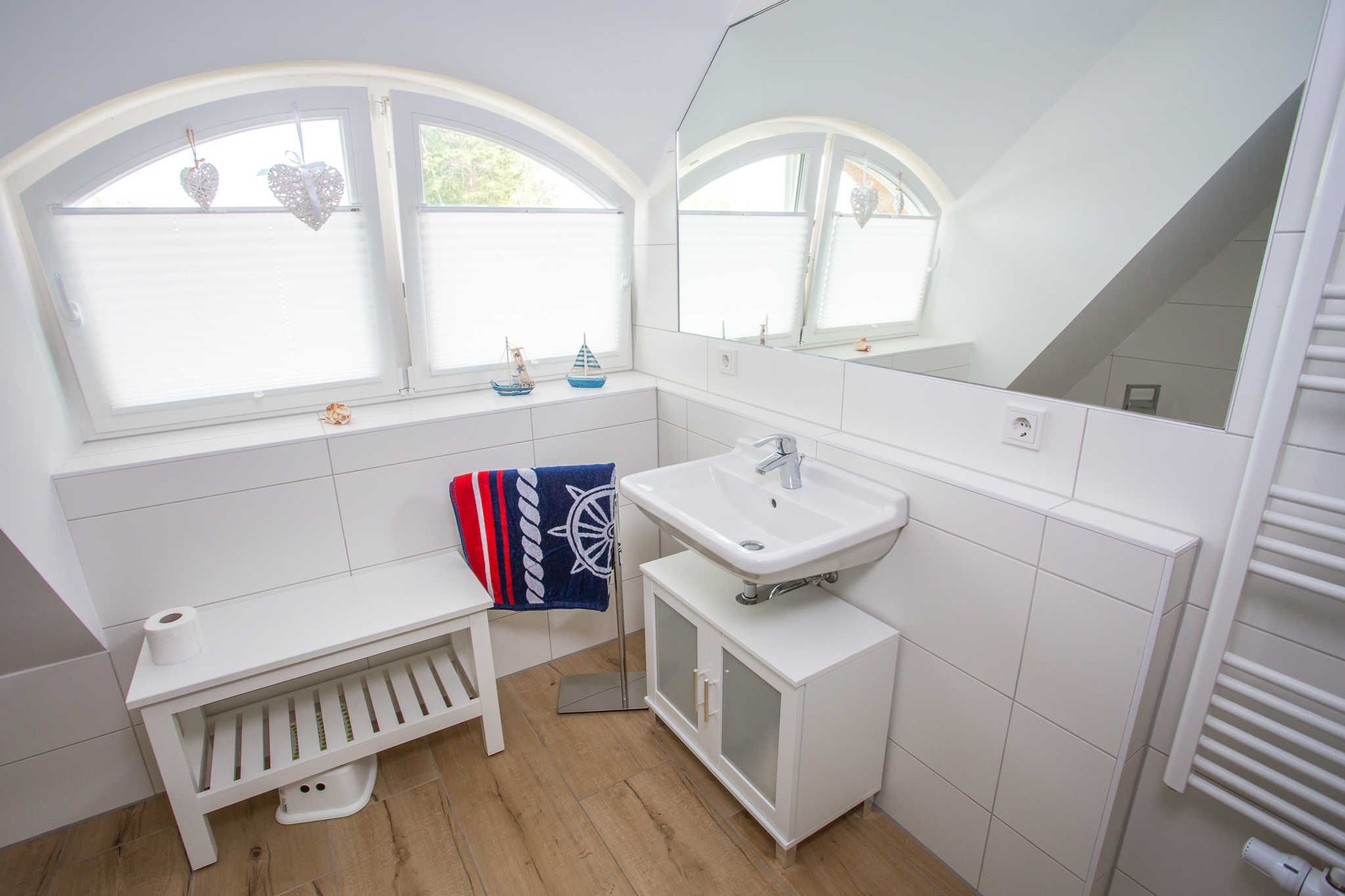 Im Erdgeschoss befindet sich der großzügig gestaltete Wohnbereich mit integrierter Küche und ein Duschbad. Der maritim eingerichtete Wohnbereich eignet sich ideal zum Entspannen nach einem ausgedehnten Strandspaziergang. Die modernen Elektronikgeräte wie wandhängender ein 60-Zoll-Flat-TV, ein Blu-ray-Player, ein DAB-Radio oder ein Spieleabend mit der Familie lassen die Zeit spaßig verfliegen. Die moderne Einbauküche sowie diverse Küchengeräte wie Geschirrspüler, Toaster, Kaffeemaschine, Wasserkocher, Mikrowelle, Herd mit Cerankochfeld, Backofen und Kühl-Gefrierkombination bieten ambitionierten Hobbyköchen auch im Urlaub die Möglichkeit Essen nach eigenen Wünschen zu kochen. Die Küche ist großzügig mit Ess- und Kochgeschirr, Besteck und Gläsern ausgestattet. Im hell gefliesten Duschbad mit Echtglasdusche, großem Waschtisch mit Unterschrank, darüber eingefliestem Wandspiegel, WC, Föhn und Handtuchtrockner wird Hygiene zum Spaß.