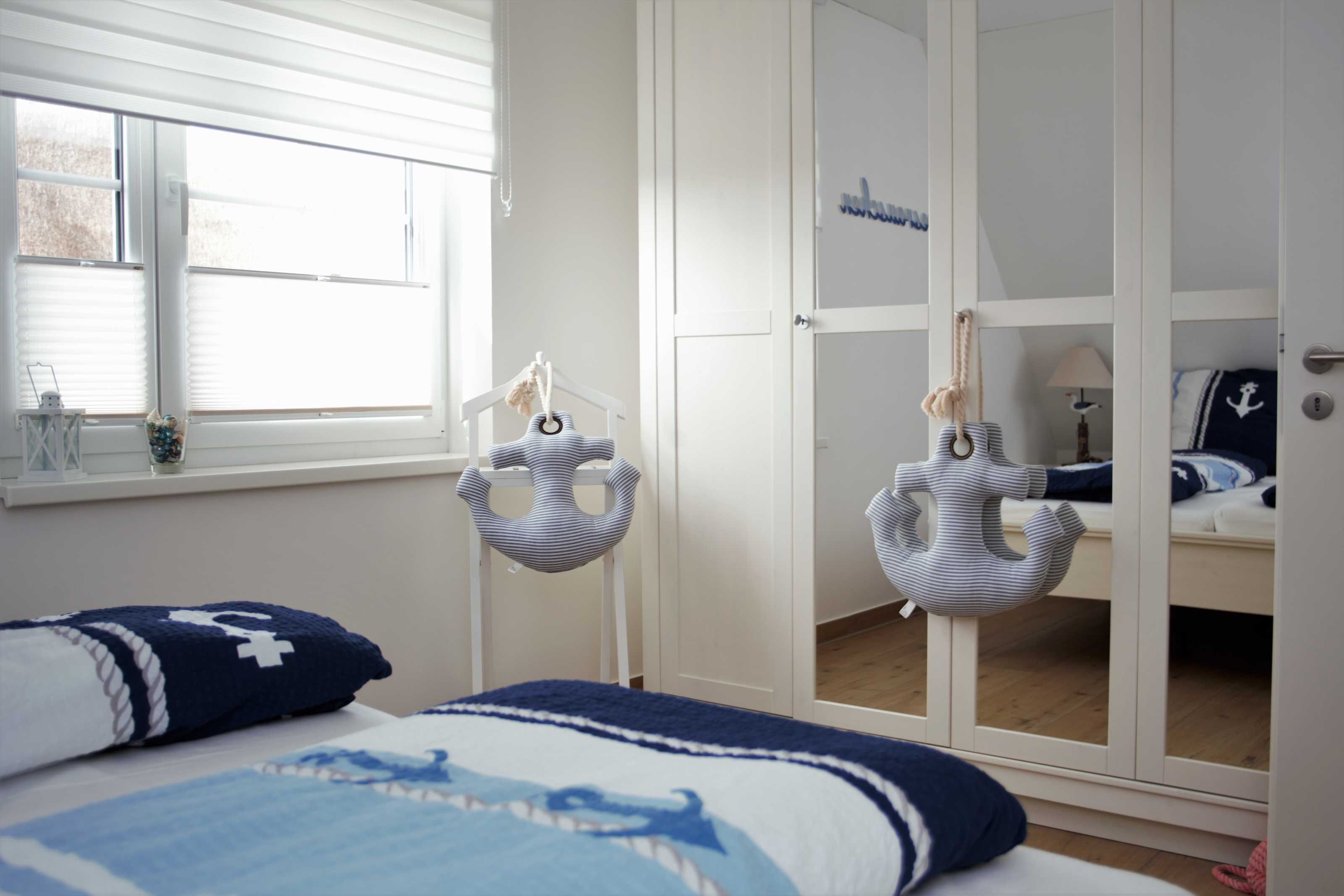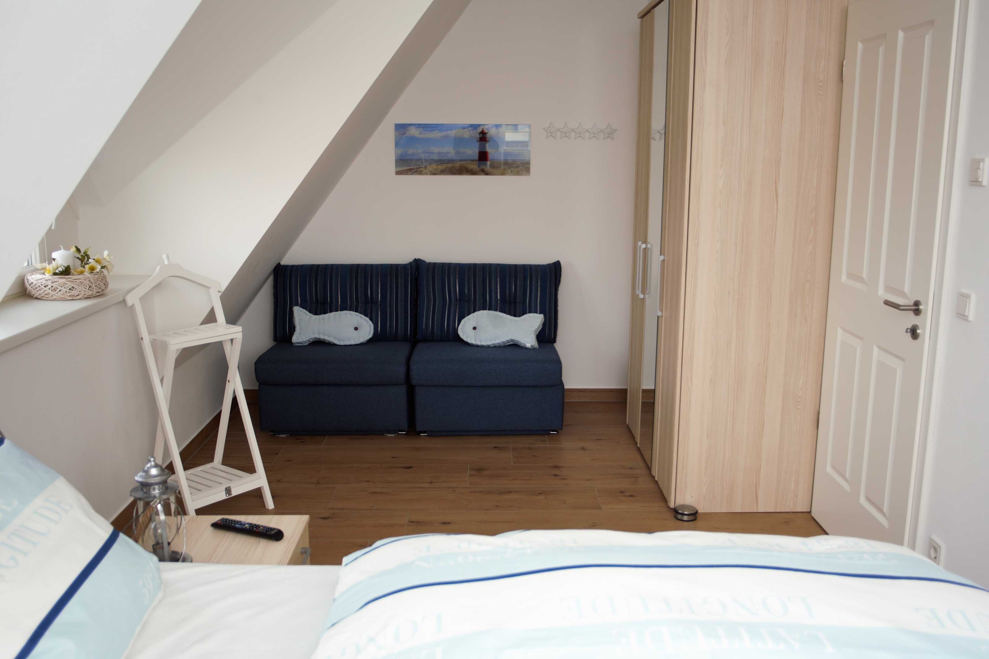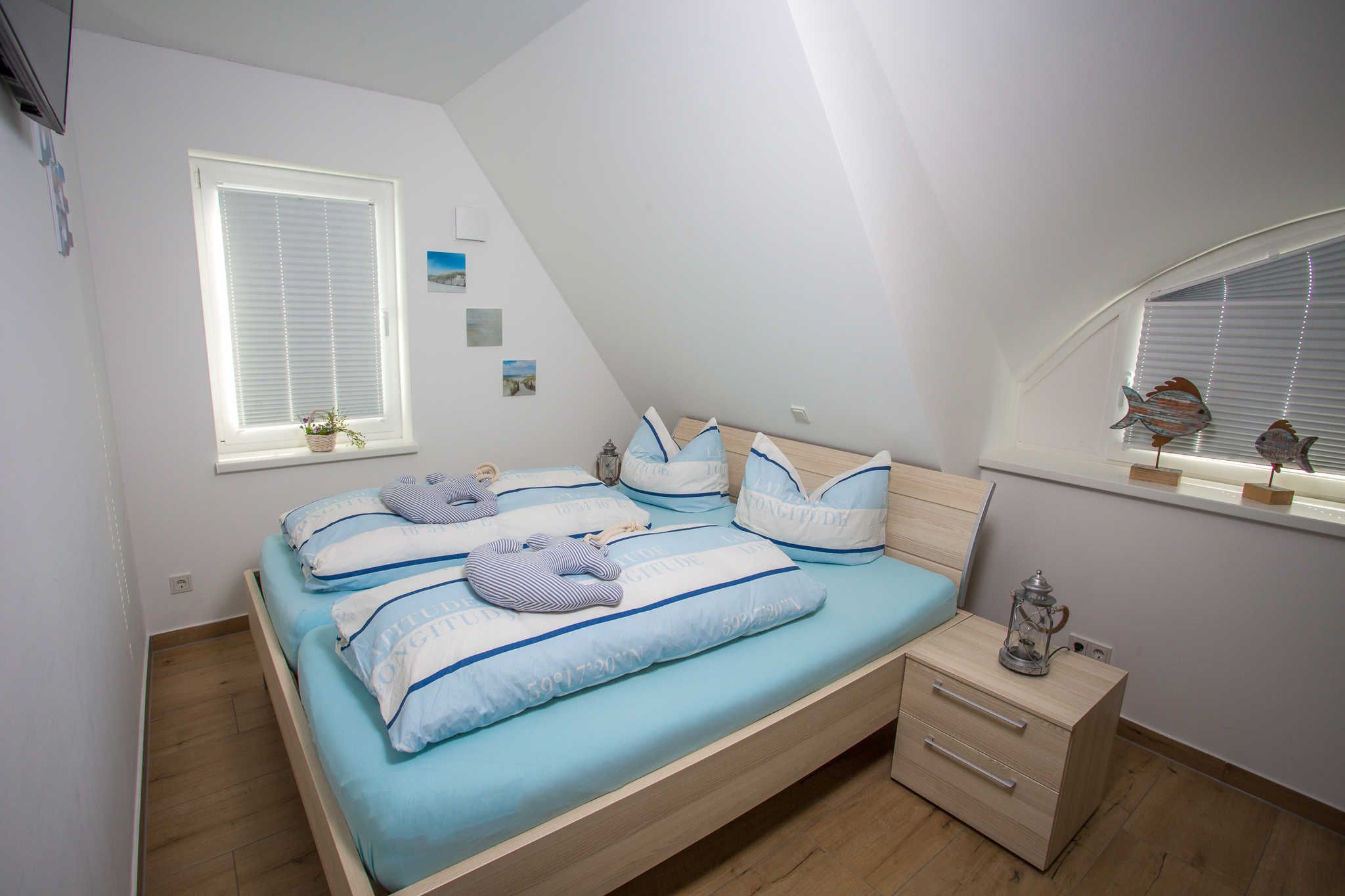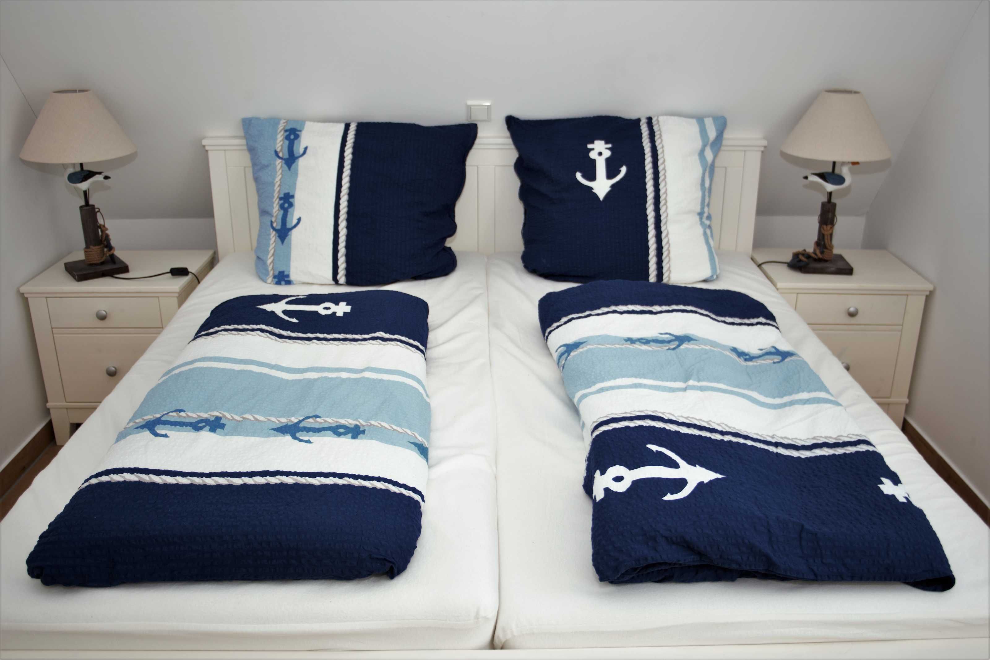 Beide Schlafzimmer sind mit geräumigen Kleiderschränken sowie Doppelbetten (1,80 x 2,00 m) mit 7 Zonen Qualitätsmatratzen im Härtegrad ausgestattet. Hierbei erwarten Sie je ein Bett mit Härtegrad 2 (bis 80 kg) und ein Bett mit Härtegrad 3 (über 80 kg). Zum besseren Einschlafen kann im größeren Schlafzimmer auf dem wandhängenden 40-Zoll-Flat-TV fern gesehen werden.