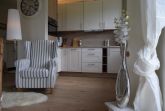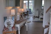 Schon im Eingangsbereich spüren Sie die Gemütlichkeit und die geschmackvolle Dekoration und Einrichtung. Lassen Sie sich inspirieren von der geschmackvollen Einrichtung und fühlen Sie sich schon gleich nach der Ankunft Zuhause. Dafür sorgt ein großzügiger Wohnbereich mit einer modernen Wohnküche, eine Essecke im Shabby Chic-Stil, zwei schön eingerichtete Schlafzimmer sowie zwei schöne Bäder und für unsere kleinen Seeräuber eine kuschelige Piratenhöhle im Spitzboden. Sie erwartet ein großzügiger Wohnbereich mit einer modernen Einbauküche aus Eiche und Fronten im Landhausstil in creme weiß. Die modernen Einbaugeräte wie Glaskeramik-Kochfeld, Flachschirmhaube, Kühlschrank mit Gefrierfach, Einbauspüle aus Ceramik in Magnolia, Geschirrspüler und der Mikrowellen-Kompaktbackofen lassen keine Wünsche offen. Eingerichtet mit Geschirr welches den gedeckten Tisch einfach schön aussehen lässt. Die Weinregale für einen leckeren Rot-oder Weißwein runden das Küchenkonzept ab. Der Essbereich lässt Sie es spüren an der Ostsee zu sein. Stühle im maritimen Strandlook und ein antiker Tisch laden zu einem schönen Abendessen oder einem gemütlichen Spieleabend im Kreise Ihrer Liebsten ein. Der Stubenbereich mit Kuscheldecken und -kissen bietet Platz für die ganze Familie. Die Fußbodenheizung gibt die behagliche Wärme. Ein paar Kerzen und der Abend kann kommen. Für einen gemütlichen Fernseh- oder Musikabend sorgt der LED Fernseher mit Blue-Ray Player oder das Radio mit CD. Vom Wohnbereich hat man einen schönen Blick in den Garten und die daran angrenzende unverbaute Grünfläche. Die Terrasse mit Strandkorb, gemütlicher Sitzecke, Elektrogrill und Sonnenschutz lässt auch im Sommer keine Wünsche offen.