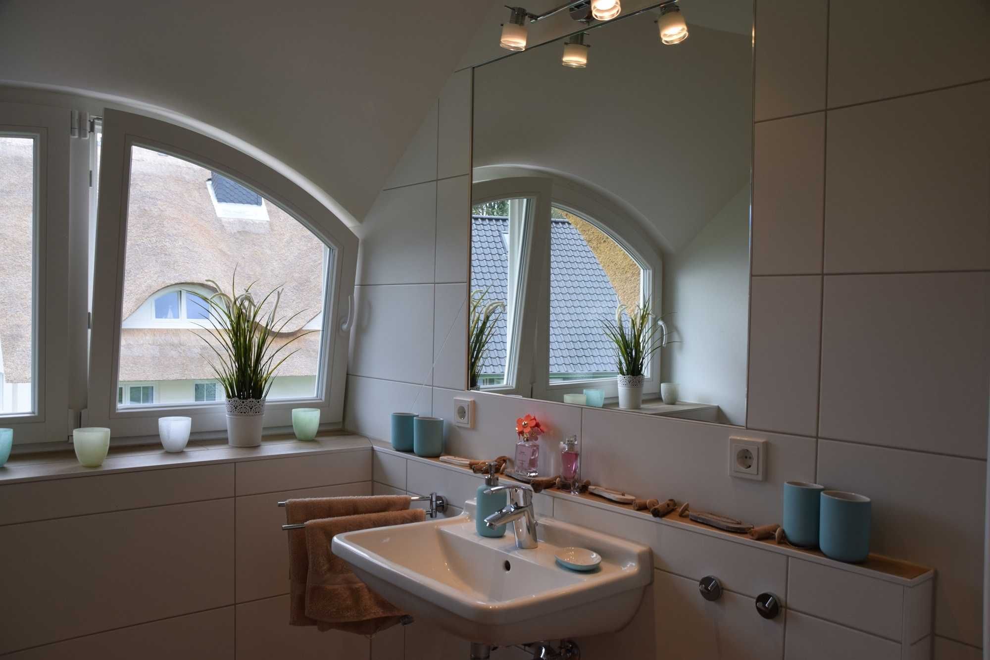 Über das Treppenhaus im Landhausstil gelangen Sie ins erste Geschoss. In den zwei Schlafzimmern finden Sie eine Kombination aus modernen Schränken mit ausreichend Stauraum sowie antiken Möbeln im Shabby Chic Design. Ein Sichtschutz ist in beiden Schlafzimmern vorhanden. Die Betten mit einer Größe von 1,80 m x 2,00 m lassen keine Wünsche offen. Das Badezimmer mit der gemütlichen Gaube und ebenerdiger Dusche und Handtuchheizkörper ist ebenso im maritimen Stil, wie das Badezimmer im Erdgeschoss eingerichtet. Hier verlässt garantiert kein Morgenmuffel das Bad. Unsere „kleinen“ großen Seeräuber finden ihr Zuhause im Spitzboden mit Piratenkoje (Einzelbett ausziehbar für einen zweiten Schlafplatz) und Muschelvorhängen. Zwei Kinderreisebetten und ein Hochstuhl steht natürlich bereit. Verdunklungsmöglichkeit vorhanden. Weitere Kinderreisebetten und Hochstühle sind kostenpflichtig zu buchbar.