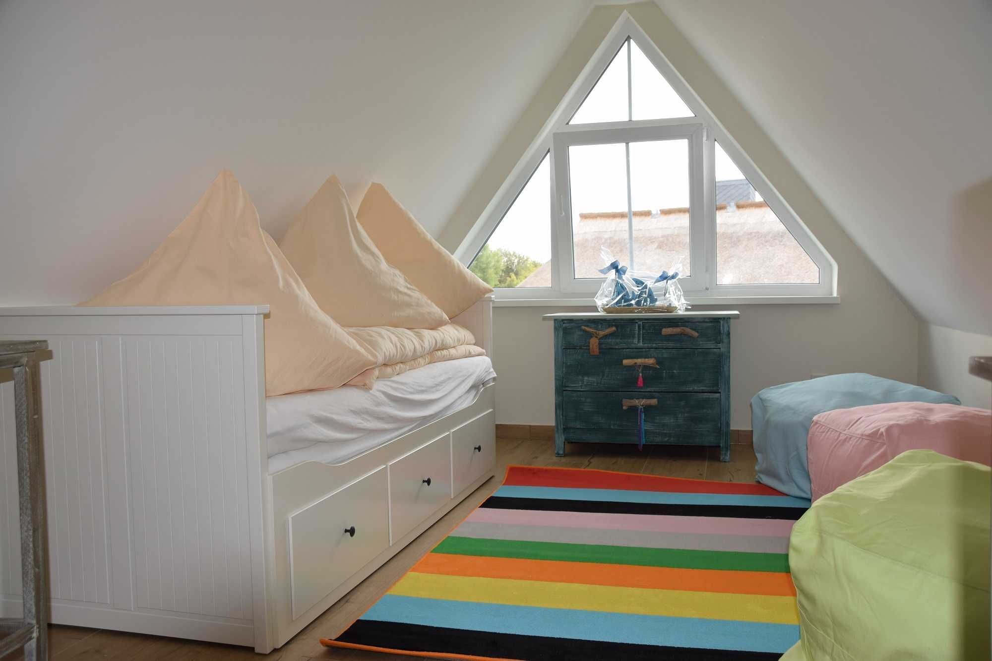 Über das Treppenhaus im Landhausstil gelangen Sie ins erste Geschoss. In den zwei Schlafzimmern finden Sie eine Kombination aus modernen Schränken mit ausreichend Stauraum sowie antiken Möbeln im Shabby Chic Design. Ein Sichtschutz ist in beiden Schlafzimmern vorhanden. Die Betten mit einer Größe von 1,80 m x 2,00 m lassen keine Wünsche offen. Das Badezimmer mit der gemütlichen Gaube und ebenerdiger Dusche und Handtuchheizkörper ist ebenso im maritimen Stil, wie das Badezimmer im Erdgeschoss eingerichtet. Hier verlässt garantiert kein Morgenmuffel das Bad. Unsere kleinen großen Seeräuber finden ihr Zuhause im Spitzboden mit Piratenkoje (Einzelbett ausziehbar für einen zweiten Schlafplatz) und Muschelvorhängen. Zwei Kinderreisebetten und ein Hochstuhl steht natürlich bereit. Verdunklungsmöglichkeit vorhanden. Weitere Kinderreisebetten und Hochstühle sind kostenpflichtig zu buchbar.