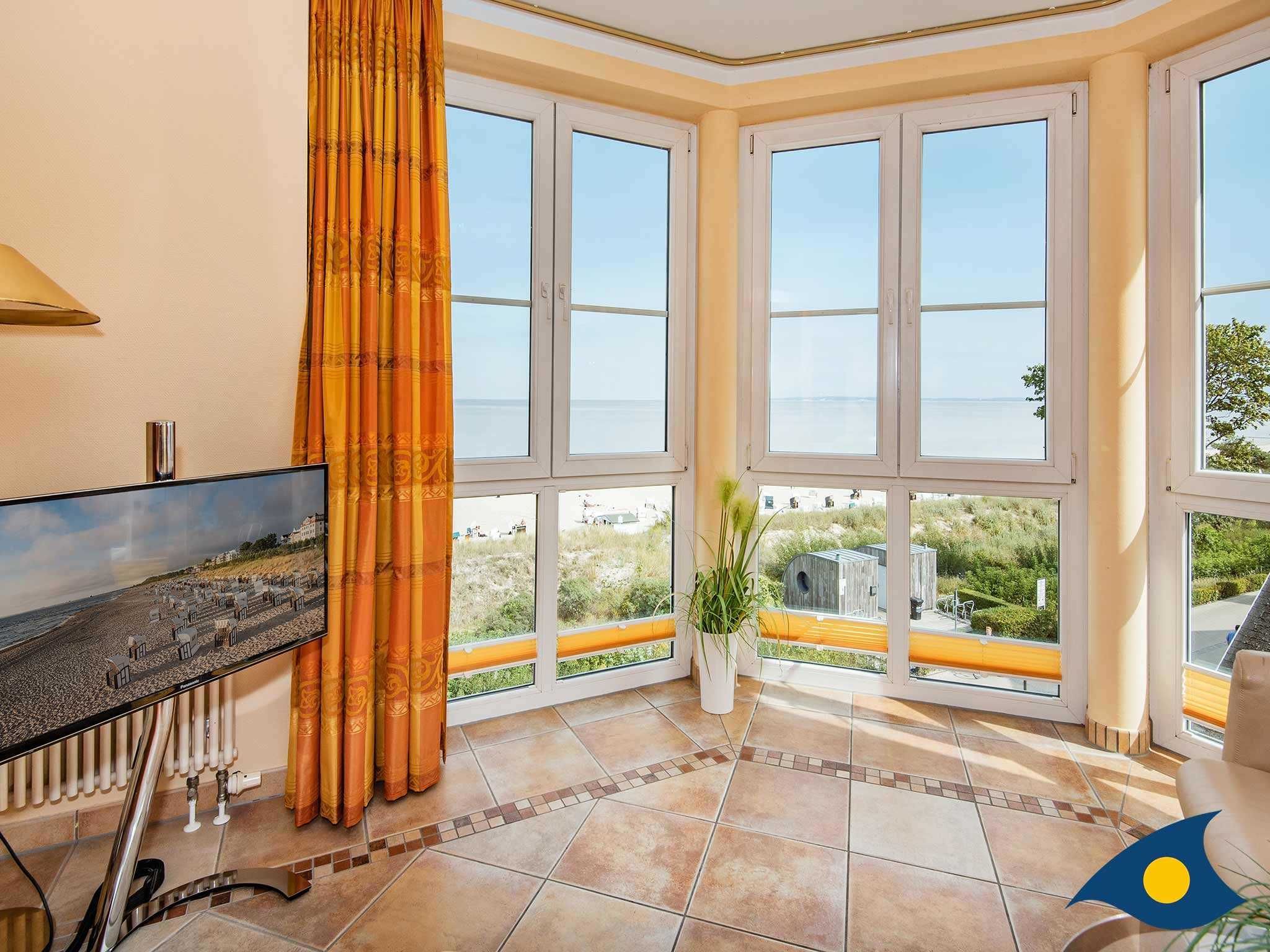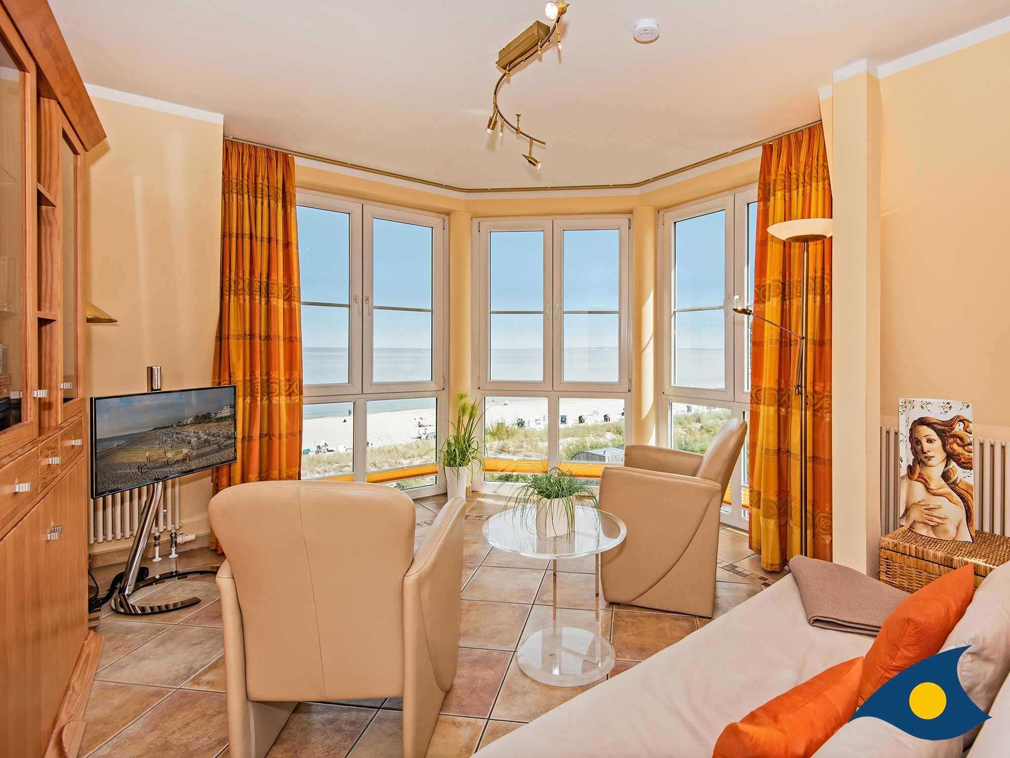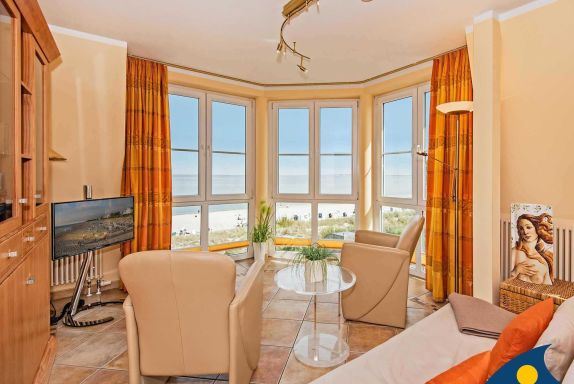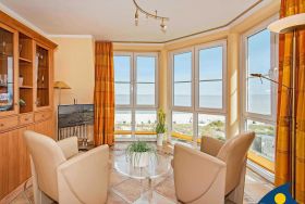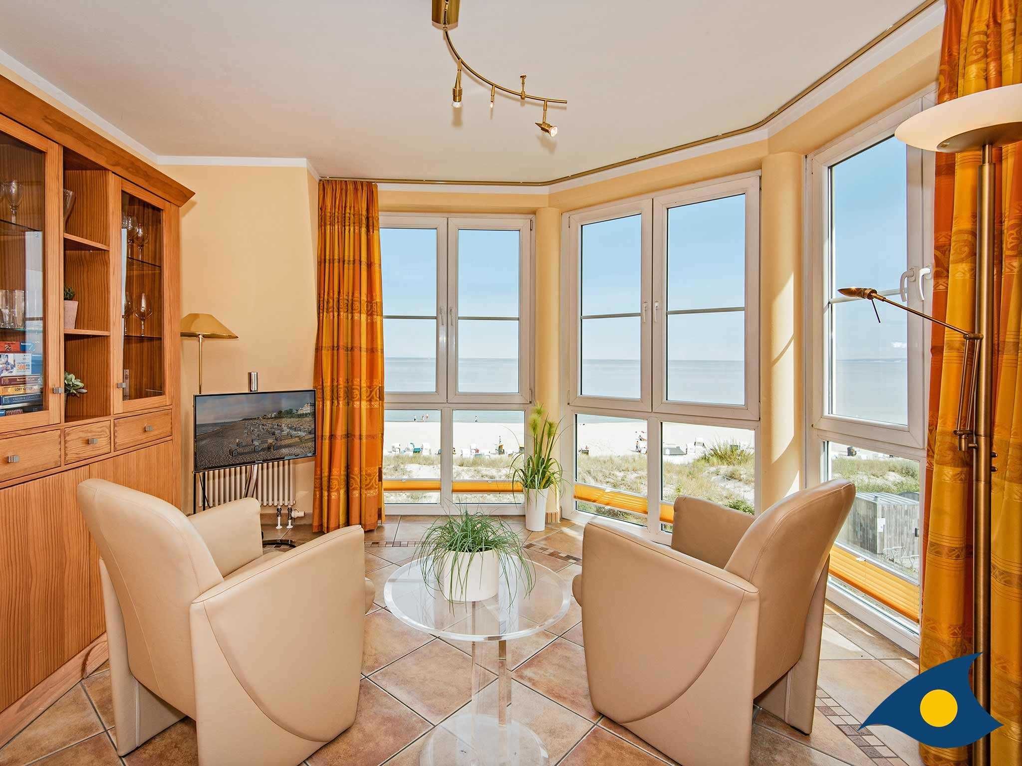 Einen großartigen Blick über Meer und Strand aus beiden Räumen bietet diese in warmen Farben gestaltete, komfortable Wohnung für zwei Personen.