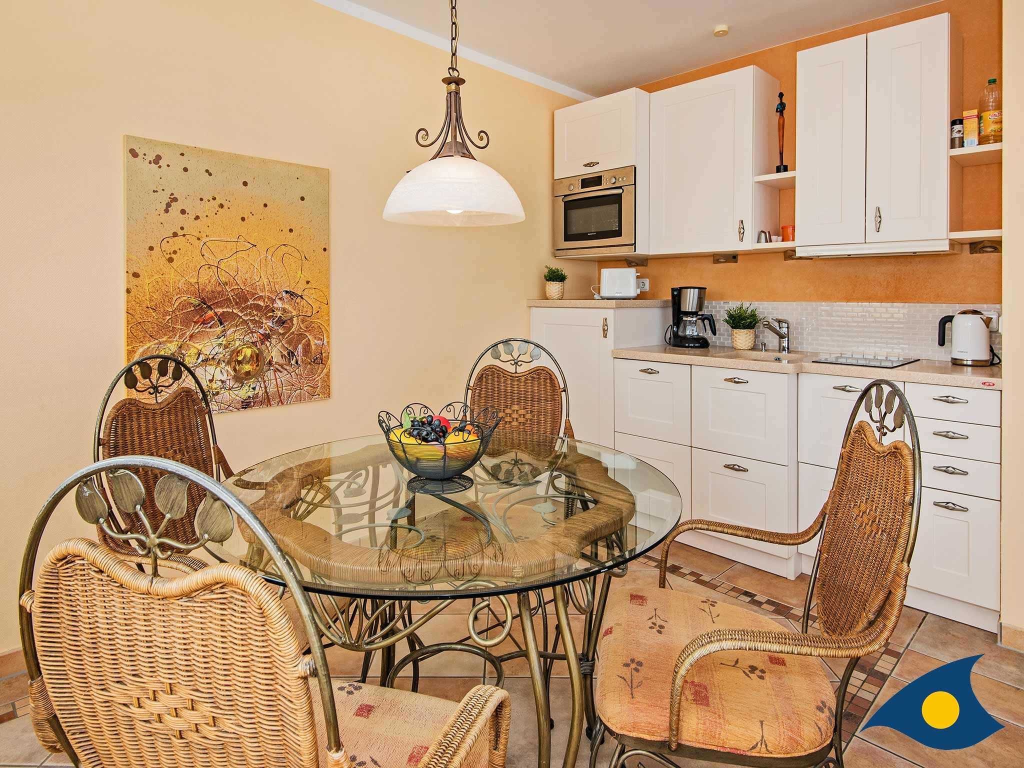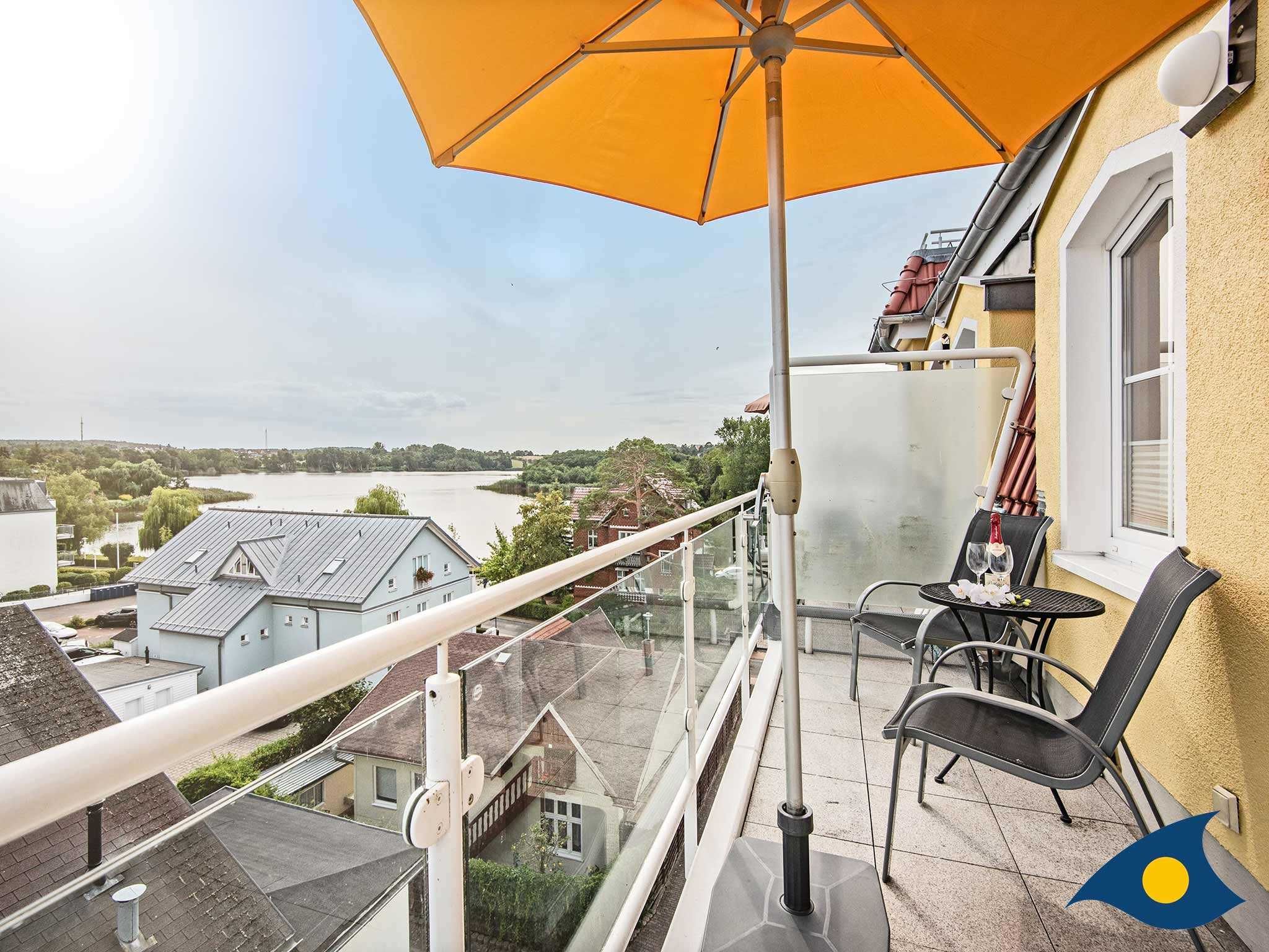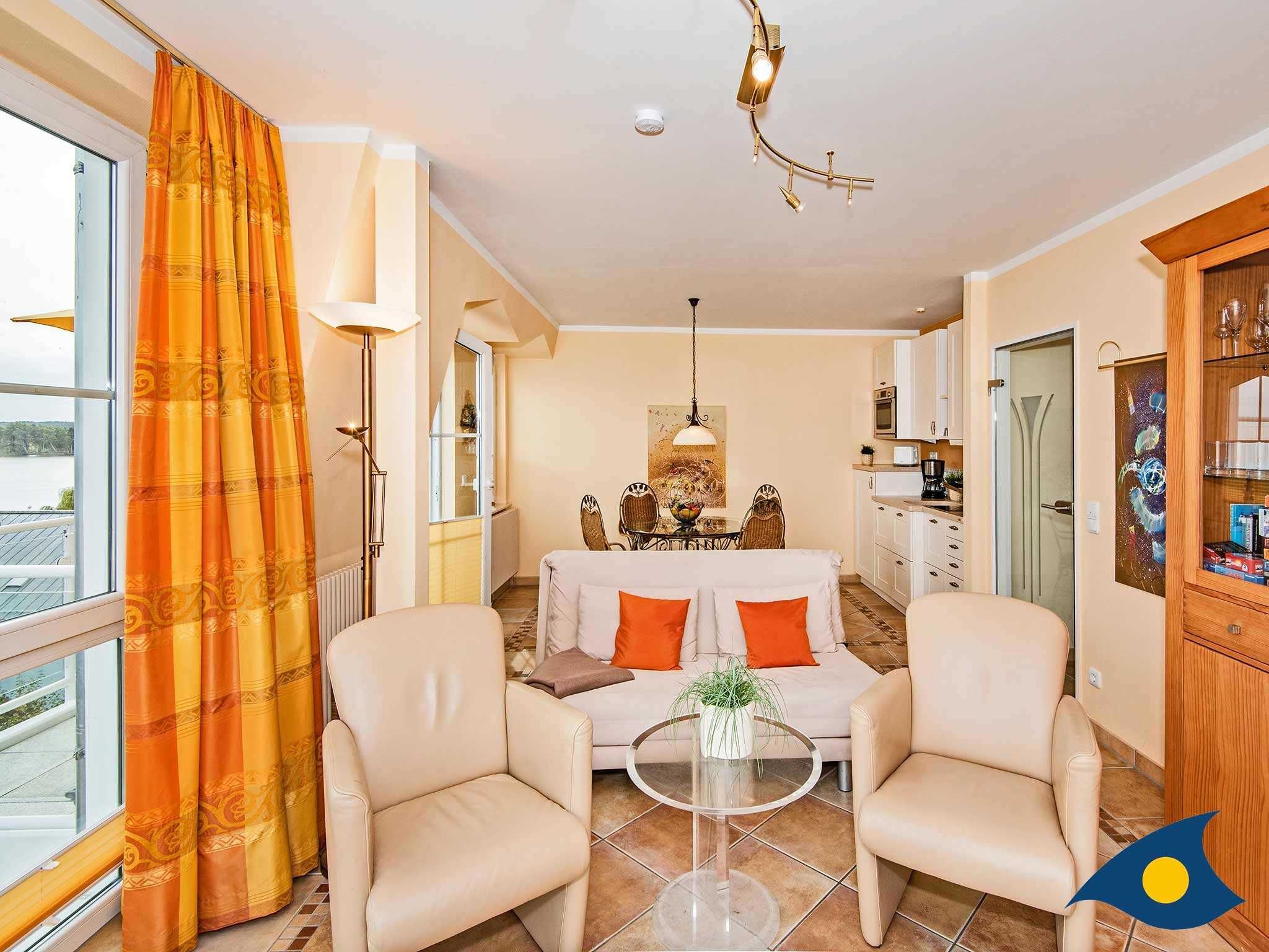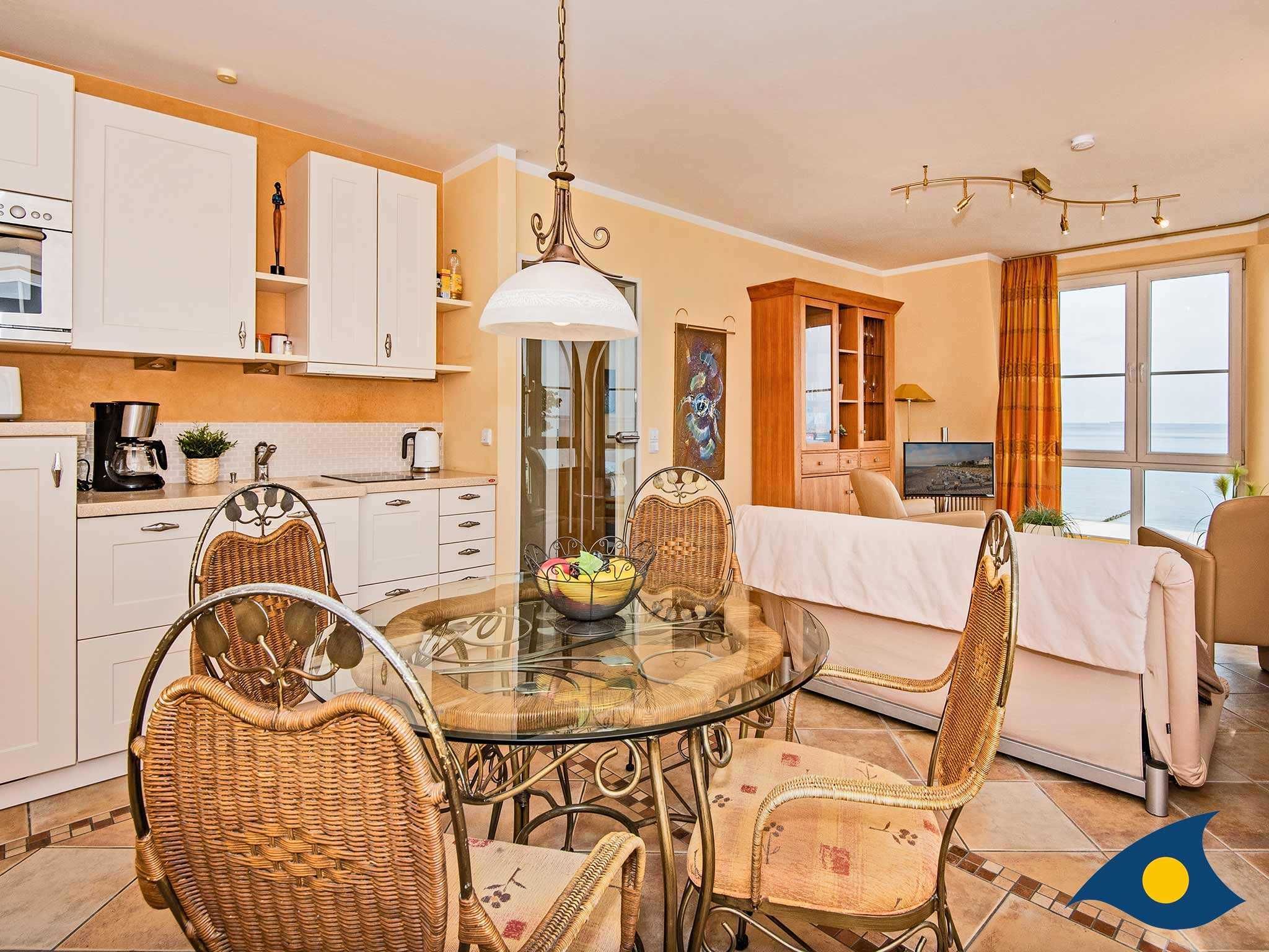 Die stilvolle Einrichtung vermittelt mit viel Atmosphäre mediteranes Flair und sorgt so für entspannte Urlaubsstimmung. Der 7 Quadratmeter große Balkon öffnet den Blick zum Meer und zum südlich gelegenen Schloonsee.