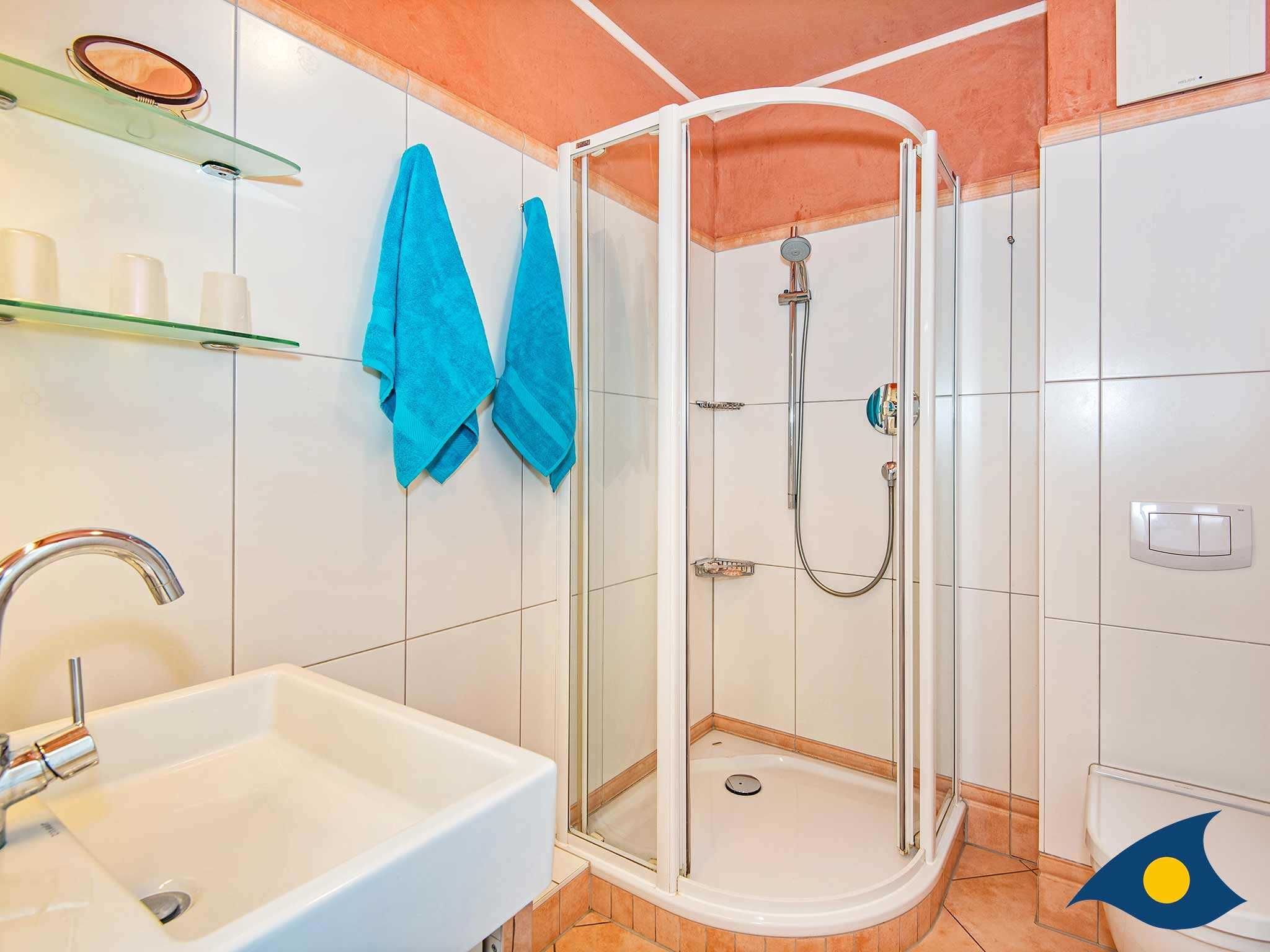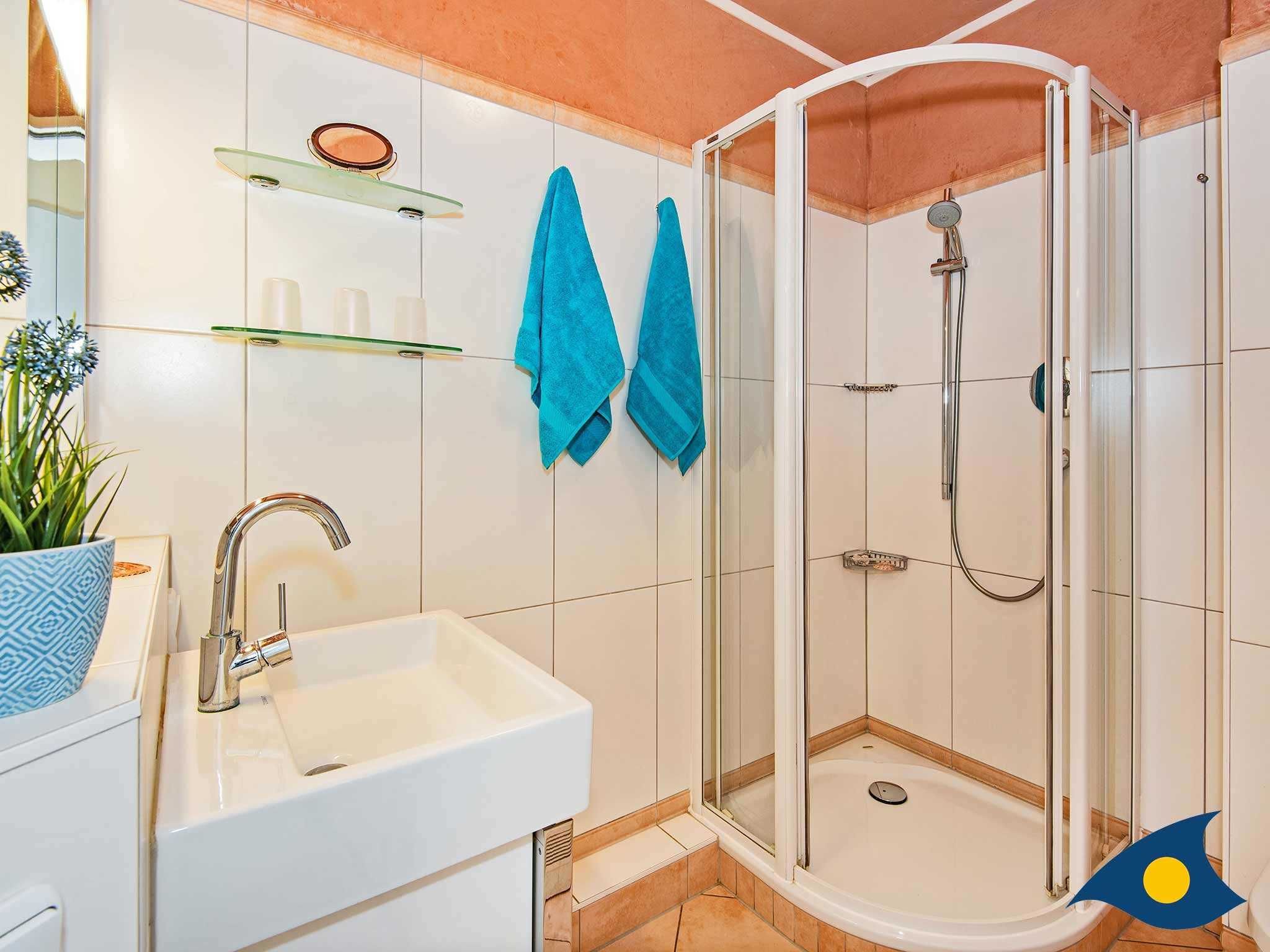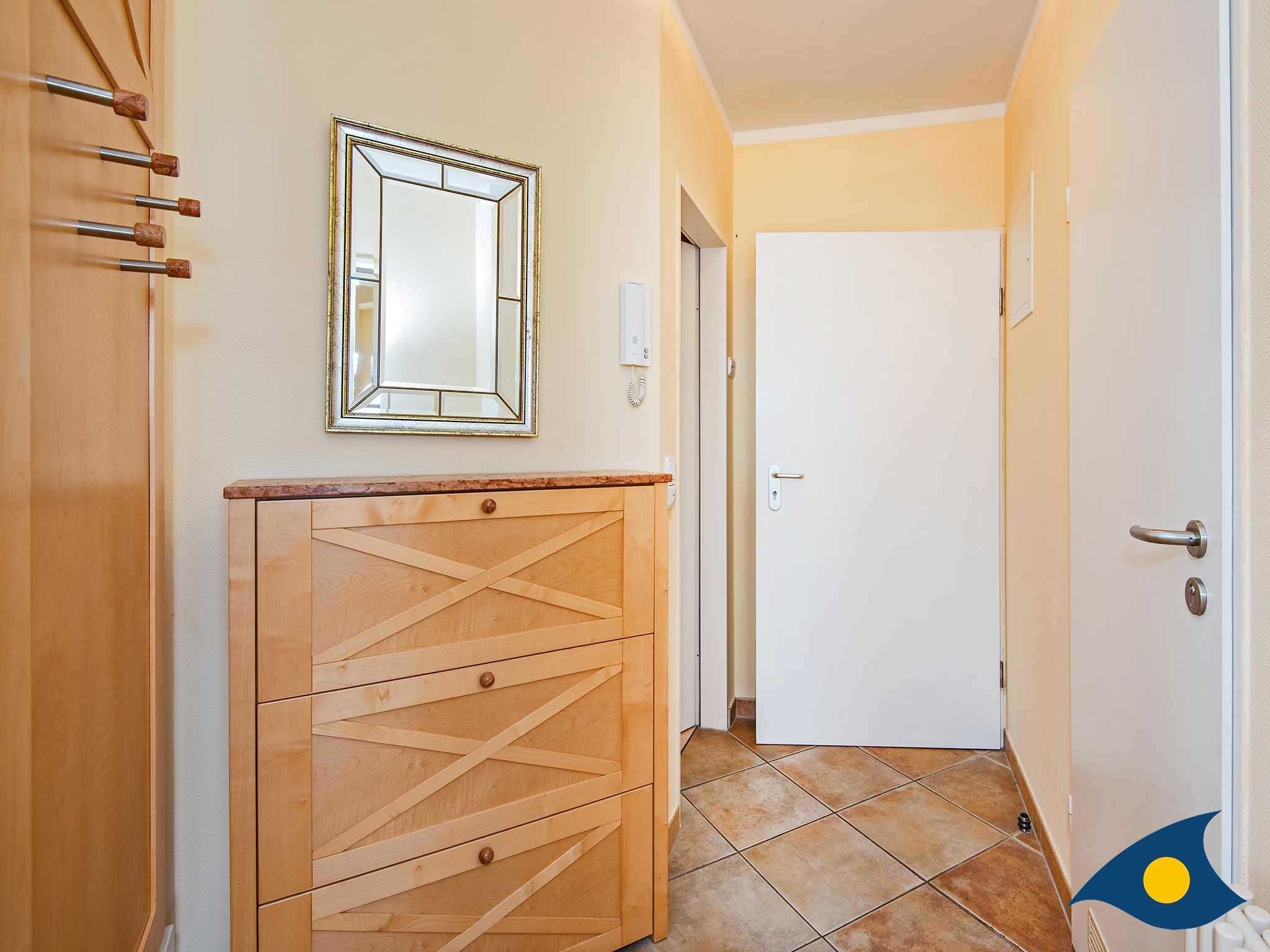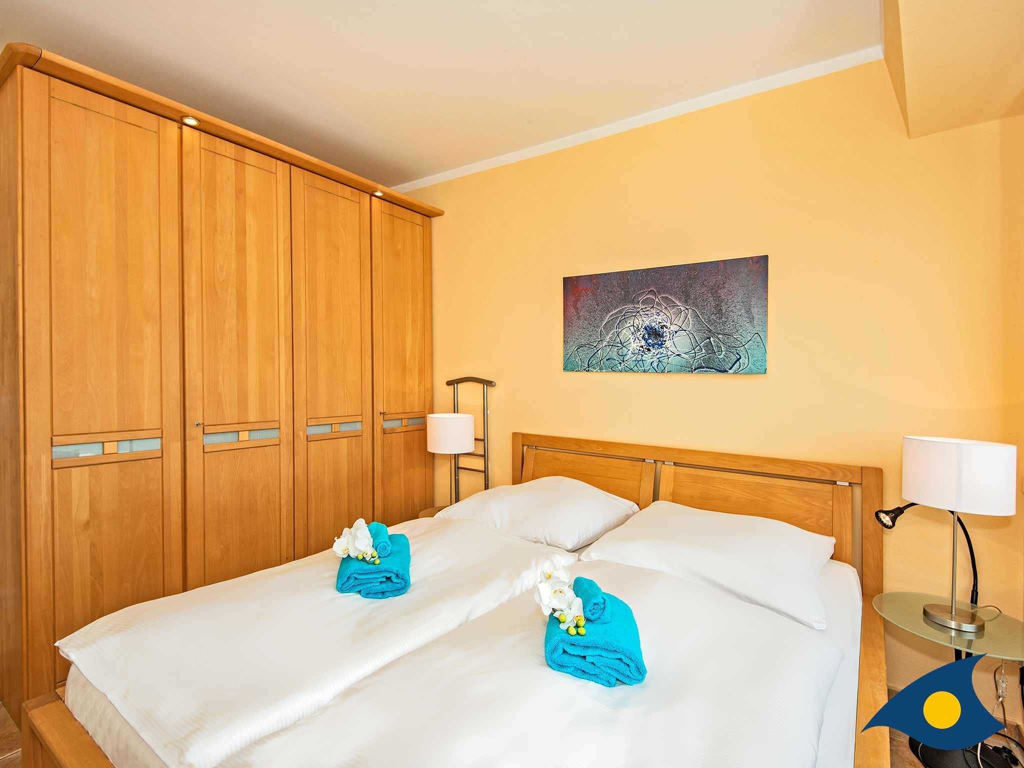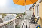 Die stilvolle Einrichtung vermittelt mit viel Atmosphäre mediteranes Flair und sorgt so für entspannte Urlaubsstimmung. Der 7 Quadratmeter große Balkon öffnet den Blick zum Meer und zum südlich gelegenen Schloonsee.
