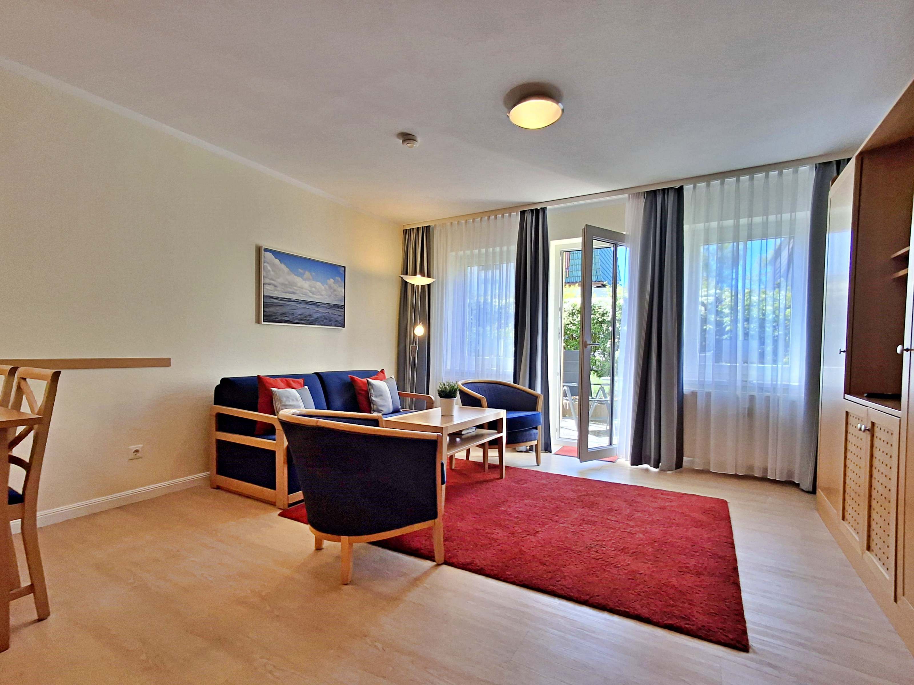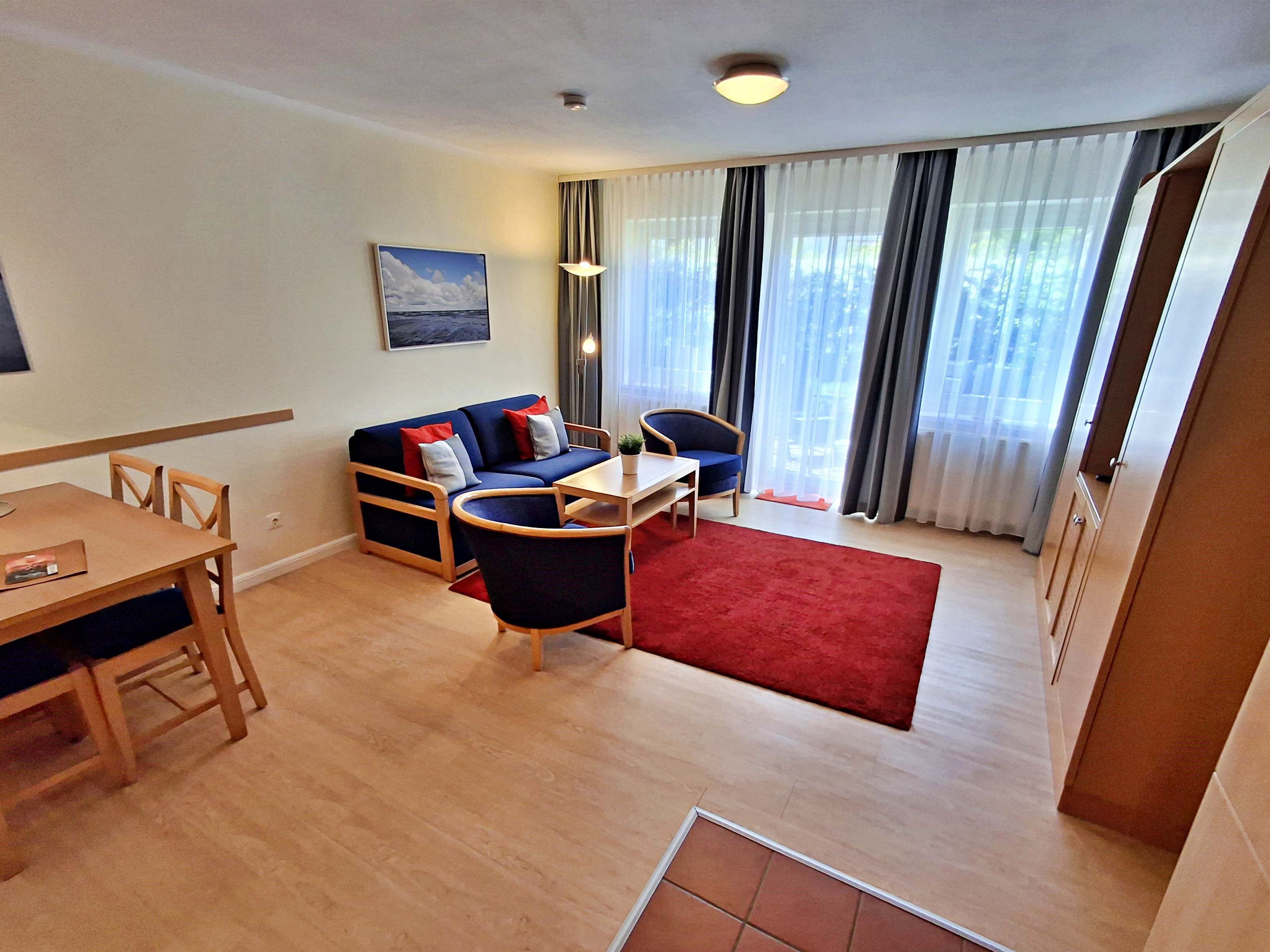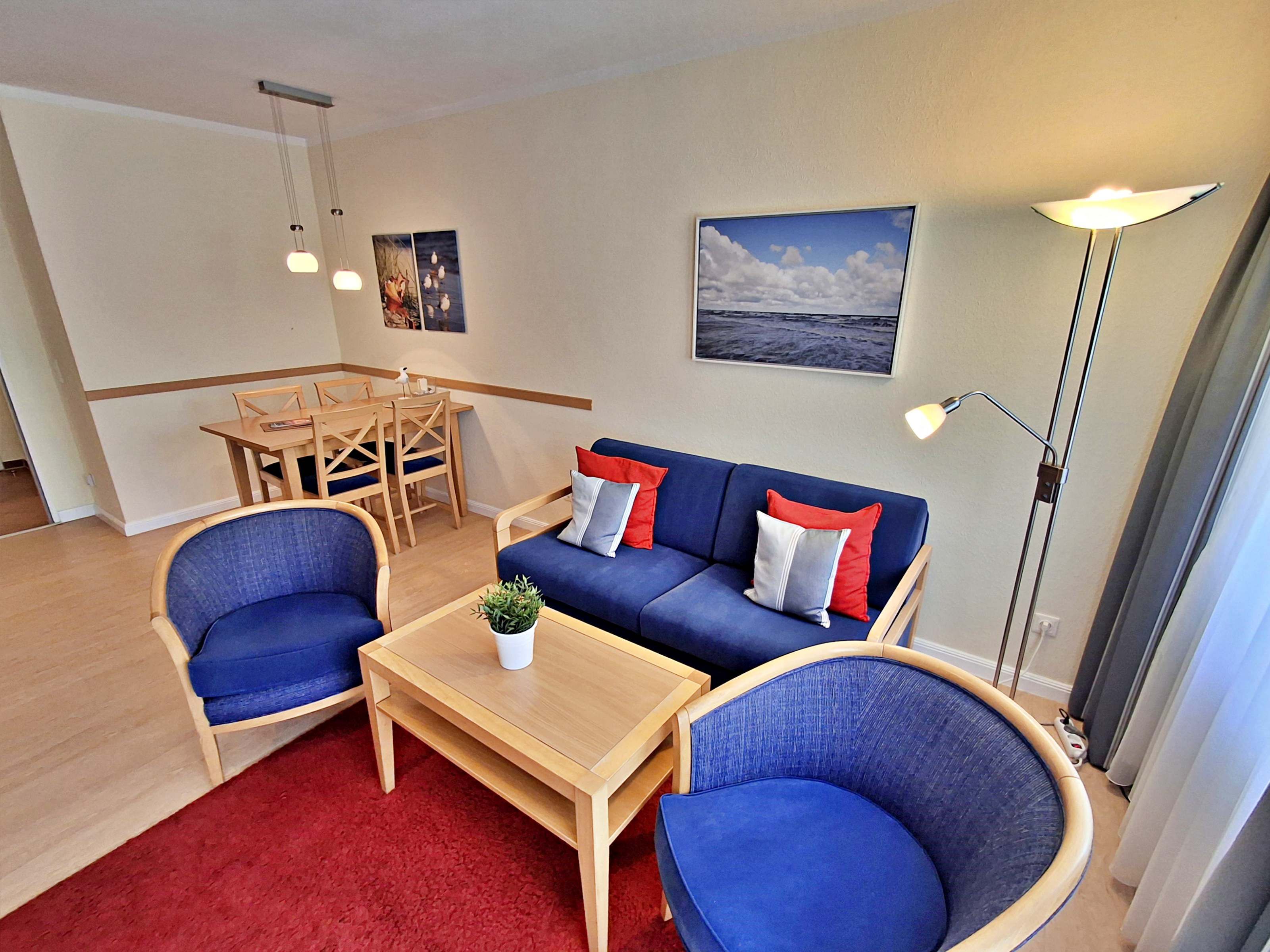 Die komfortable Wohnung für bis zu 4 Personen (68 qm) erstreckt sich über zwei Etagen (EG und 1.OG). Dies trennt in angenehmer Weise Wohn- und Schlafbereich. Die Wohnung hat sowohl im EG als auch im OG einen Zugang vom Treppenhaus. Im Erdgeschoss befinden sich das Wohnzimmer mit gemütlicher Couch, welche auch zum Schlafen geeignet ist, Sessel sowie ein Esstisch mit 4 Stühlen. Für die Unterhaltung sorgen ein internetfähiger Flachbild-TV und eine HiFi-Anlage. Die vollständige Küche mit Ceranherd, Backofen, Geschirrspülmaschine, Mikrowelle und Kühlschrank mit Gefrierfach lässt keine Wünsche offen. Vom Wohnzimmer besteht Zugang zur möblierten Terrasse. Das Bad ist mit begehbarer Dusche (niedriger Einstieg), WC, Haarfön und Kosmetikspiegel ausgestattet. Über eine Wendeltreppe gelangen Sie in das OG, wo sich auch das Schlafzimmer mit Doppelbett, eine Wohn- und Schlafcouch, ein zusätzlicher Flachbild-TV sowie ein Gäste-WC befindet. Sämtliche Räume sind mit einem modernen Design-Bodenbelag oder mit Fliesen ausgestattet. W-LAN steht kostenfrei zur Verfügung. Ein Kinderbett mit Wäsche sowie ein Hochstuhl können auf Anfrage gegen eine Gebühr von einmalig 50 € vom Verwalter zur Verfügung gestellt werden.