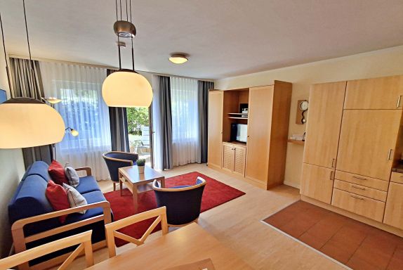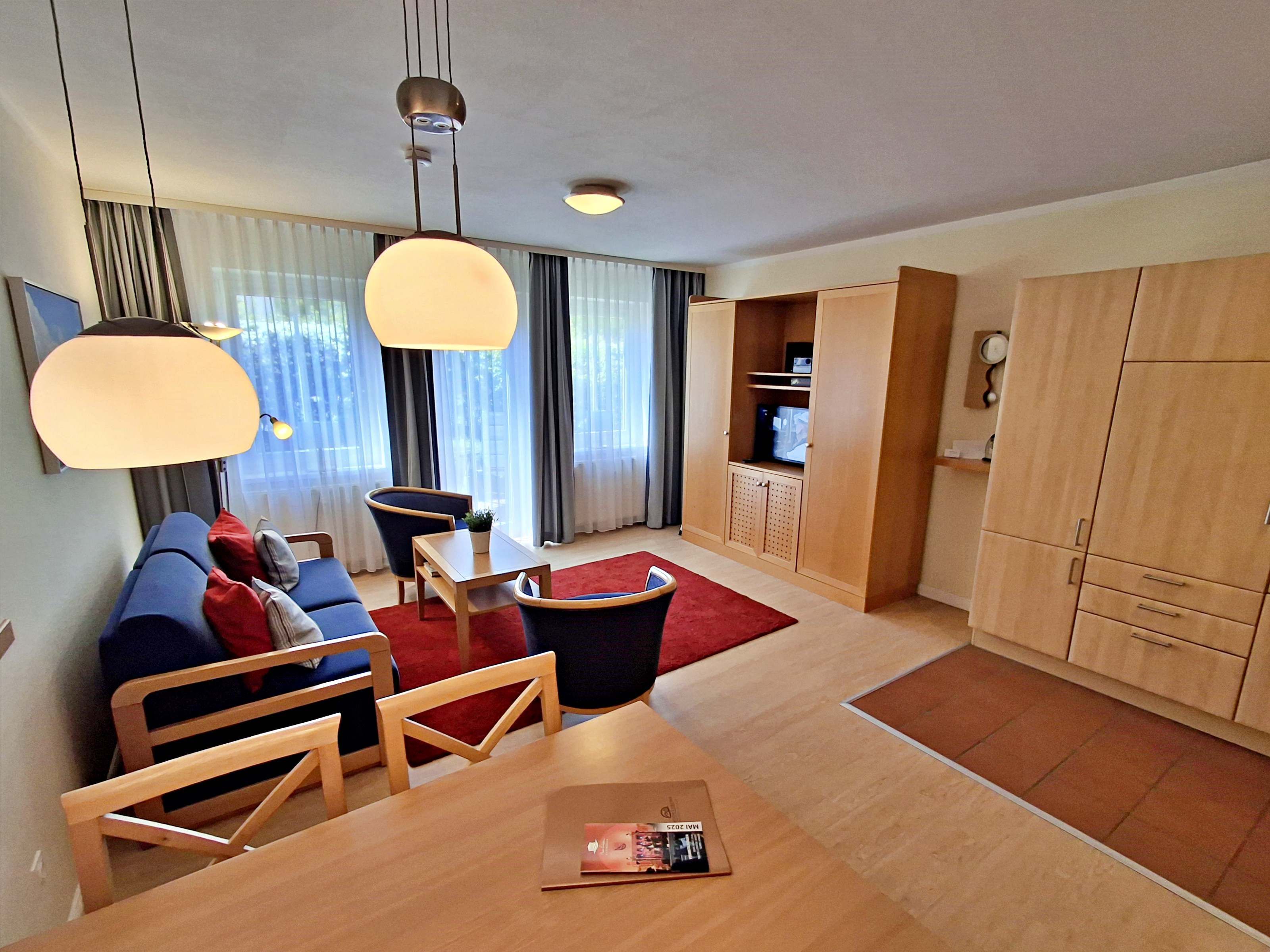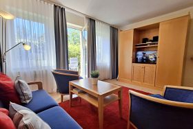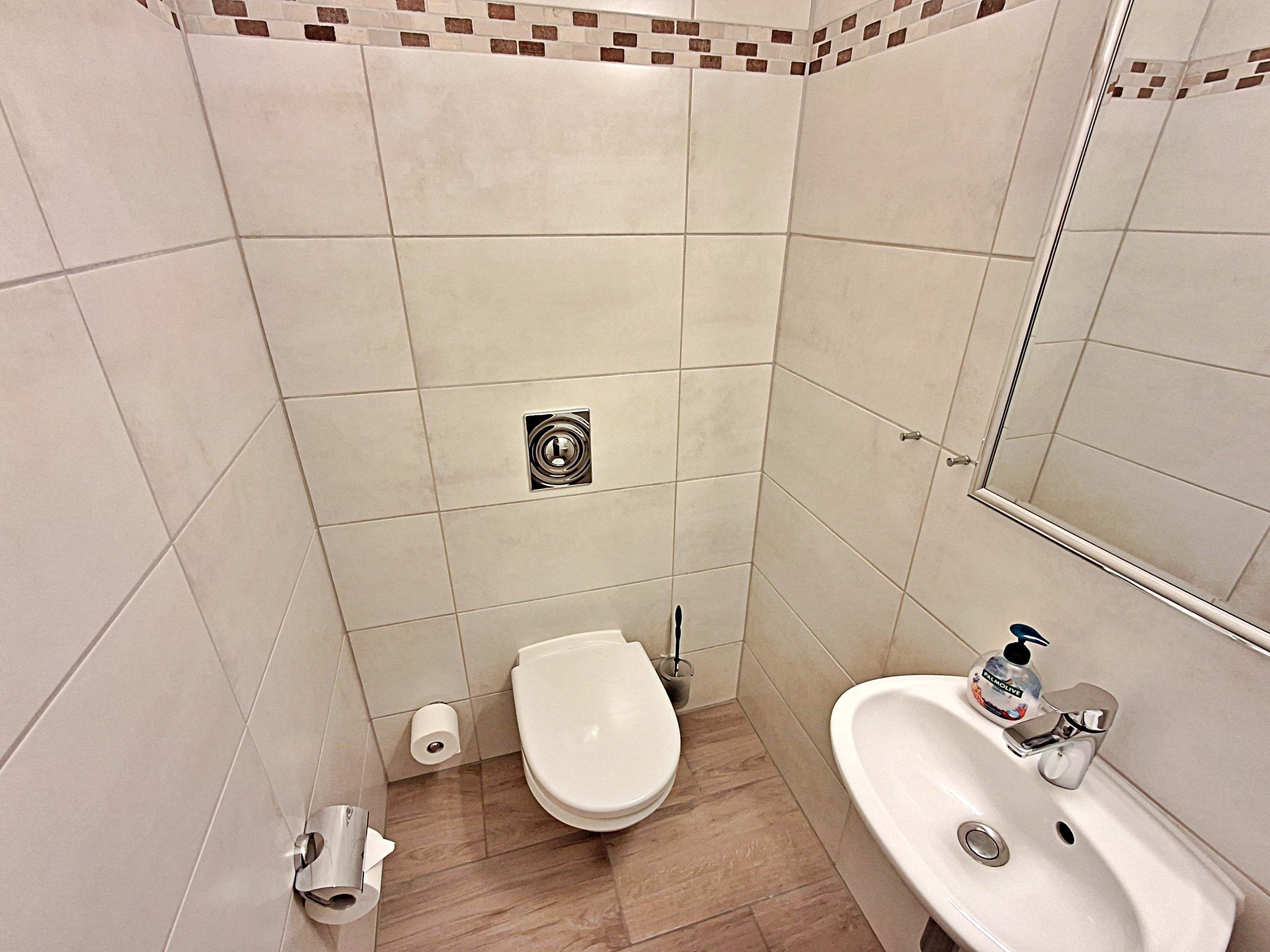 Die komfortable Wohnung für bis zu 4 Personen (68 qm) erstreckt sich über zwei Etagen (EG und 1.OG). Dies trennt in angenehmer Weise Wohn- und Schlafbereich. Die Wohnung hat sowohl im EG als auch im OG einen Zugang vom Treppenhaus. Im Erdgeschoss befinden sich das Wohnzimmer mit gemütlicher Couch, welche auch zum Schlafen geeignet ist, Sessel sowie ein Esstisch mit 4 Stühlen. Für die Unterhaltung sorgen ein internetfähiger Flachbild-TV und eine HiFi-Anlage. Die vollständige Küche mit Ceranherd, Backofen, Geschirrspülmaschine, Mikrowelle und Kühlschrank mit Gefrierfach lässt keine Wünsche offen. Vom Wohnzimmer besteht Zugang zur möblierten Terrasse. Das Bad ist mit begehbarer Dusche (niedriger Einstieg), WC, Haarfön und Kosmetikspiegel ausgestattet. Über eine Wendeltreppe gelangen Sie in das OG, wo sich auch das Schlafzimmer mit Doppelbett, eine Wohn- und Schlafcouch, ein zusätzlicher Flachbild-TV sowie ein Gäste-WC befindet. Sämtliche Räume sind mit einem modernen Design-Bodenbelag oder mit Fliesen ausgestattet. W-LAN steht kostenfrei zur Verfügung. Ein Kinderbett mit Wäsche sowie ein Hochstuhl können auf Anfrage gegen eine Gebühr von einmalig 50 € vom Verwalter zur Verfügung gestellt werden.