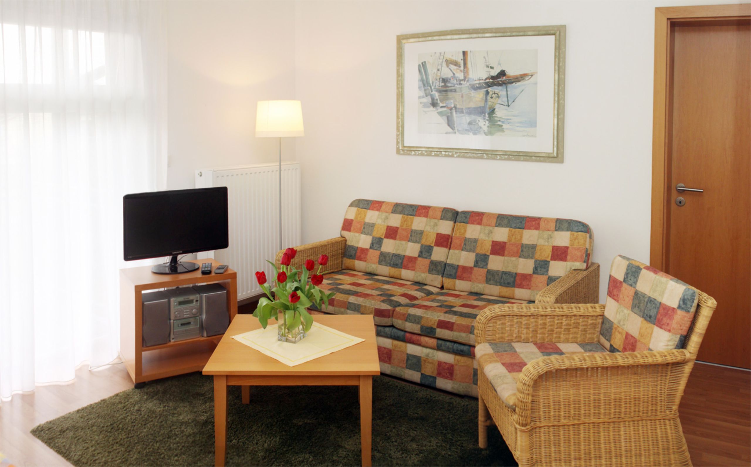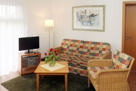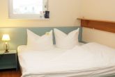 Das Schlafzimmer liegt sehr ruhig, weit weg vom hektischen Treiben und garantiert einen erholsamen Ostseeurlaub. Ein ausziehbarer Schlafsessel ermöglicht die Unterbringung einer dritten Person im Schlafzimmer.