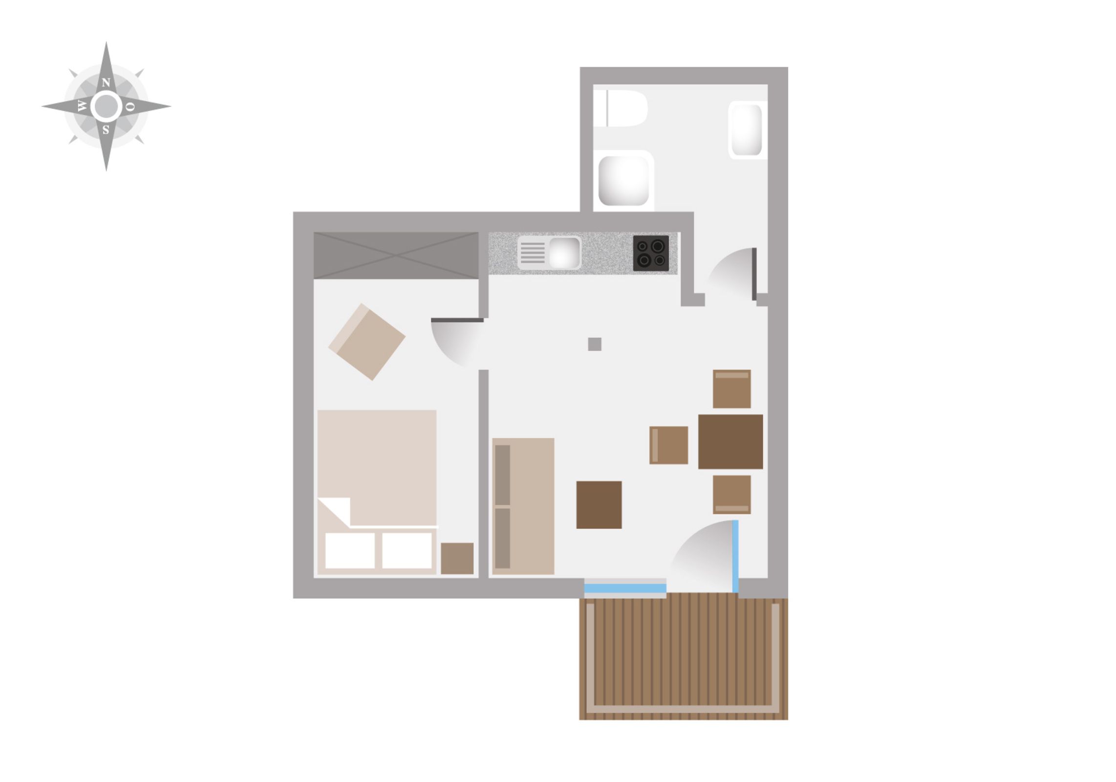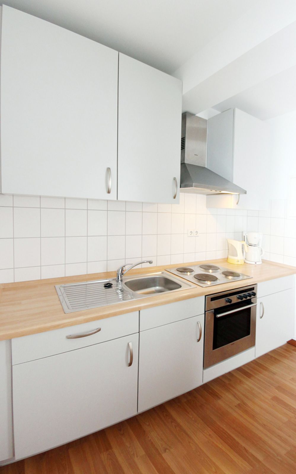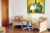 Über den ruhig gelegenen Südbalkon gelangen Sie in den Wohn- / Essraum. Die Küche ist mit Kühlschrank, Backofen, Vierplattenherd, Kaffeemaschine, Toaster, Wasserkocher und ausreichend Geschirr ausgestattet, so dass Sie auch im Urlaub, wenn Sie viel Zeit und Lust haben, ab und zu selbst kochen können.