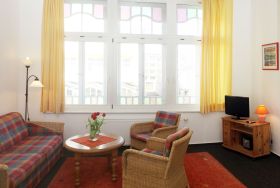 Unsere Ostsee-Ferienwohnung Abendrot für 2 Personen und 2 Aufbettungen, ca. 65 qm groß, befindet sich im ersten Obergeschoss der Villa Waldfrieden, unserem renovierten Altbau mit den typischen, hohen Räumen und den großflächigen, bunten, denkmalgeschützten Jugendstilfenstern.