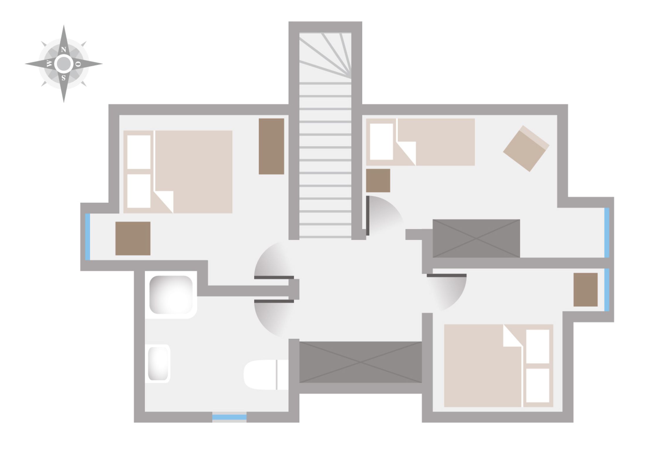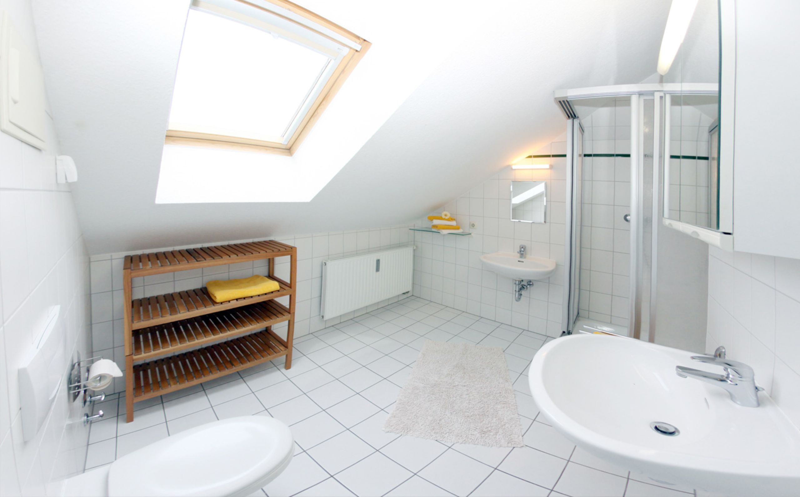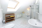 Im Obergschoss bieten die drei Schlafräume (2 mal Doppelbett, 1 mal Einzelbett + ausziehbarer Schlafsessel) viel Ruhe für die Nacht. Das Badezimmer (Dusche, WC, 2 Waschbecken), eine Garderobe im Entree sowie ein Vorratsraum runden das Raumangebot ab.