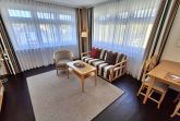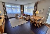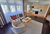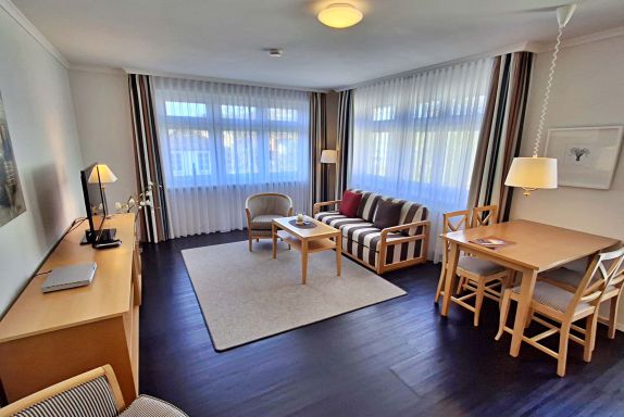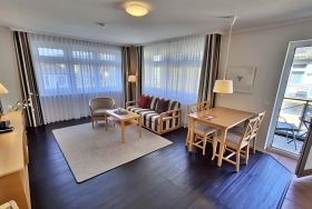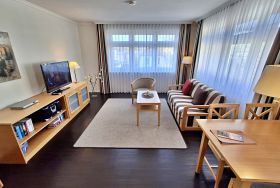 Die 54 qm große 2-Raum-Ferienwohnung befindet sich im 2. Obergeschoss (Westlage) der Appartementanlage und ist für 2 Erwachsene und 1 Kleinkind bis 1 Jahr ausgestattet. Die Wohnung verfügt über ein großes Wohnzimmer mit bequemer Couch, Sessel und eine Essecke mit 4 Stühlen. Für die Unterhaltung sorgen ein Flachbild-TV und eine Stereo-Anlage. Die vollständig ausgestattete Küchenzeile mit Ceranherd, Backofen, Mikrowelle, Kühlschrank mit Gefrierfach und Geschirrspülmaschine lässt keine Wünsche offen. Im Schlafzimmer befindet sich ein gemütliches Doppelbett. Das Tageslicht-Bad ist mit Dusche/WC, Haarfön sowie Kosmetikspiegel ausgestattet. Ein Balkon lädt zum Sitzen und Verweilen ein. Ein Kinderbett mit Wäsche sowie ein Hochstuhl können auf Anfrage gegen eine Gebühr von einmalig 50 € vom Verwalter zur Verfügung gestellt werden.