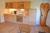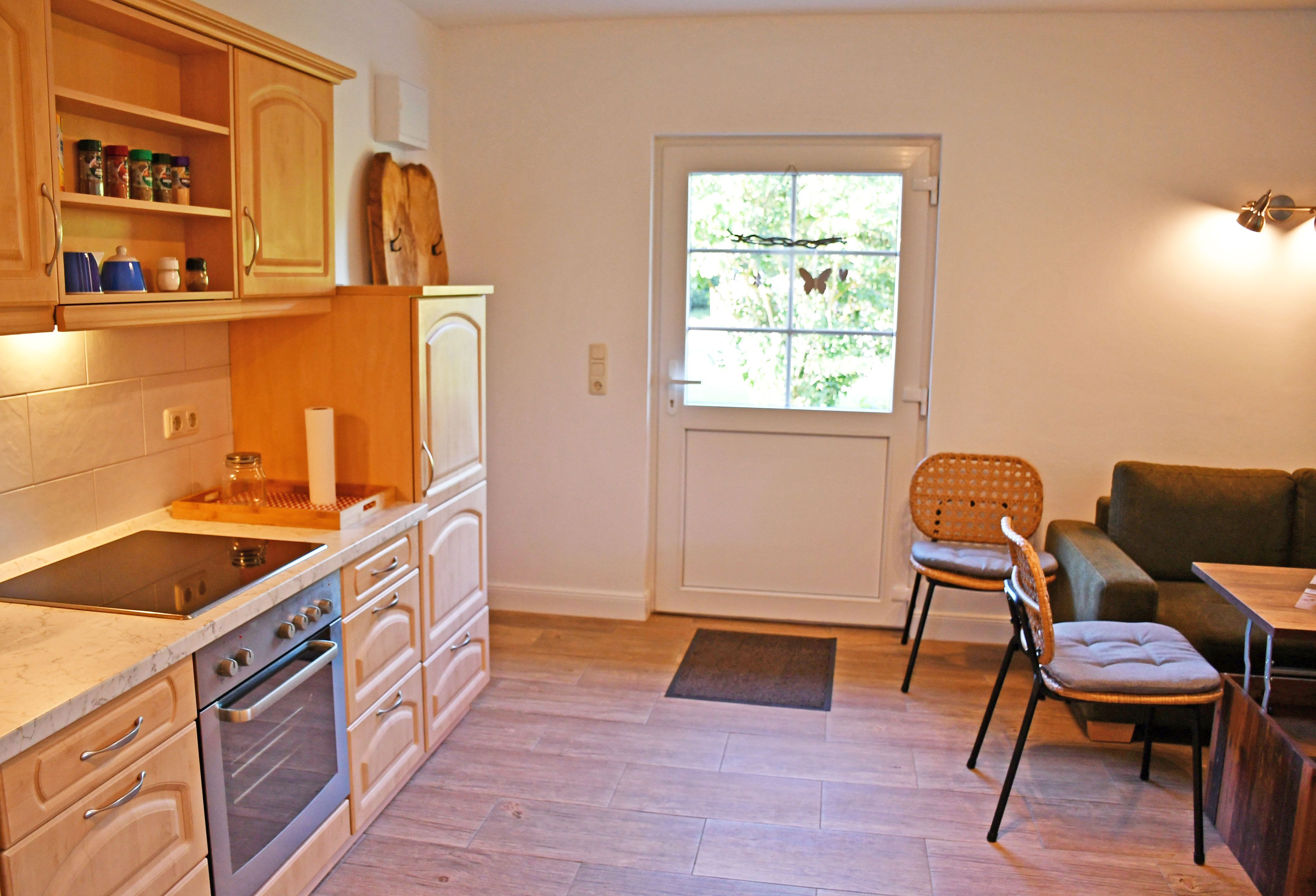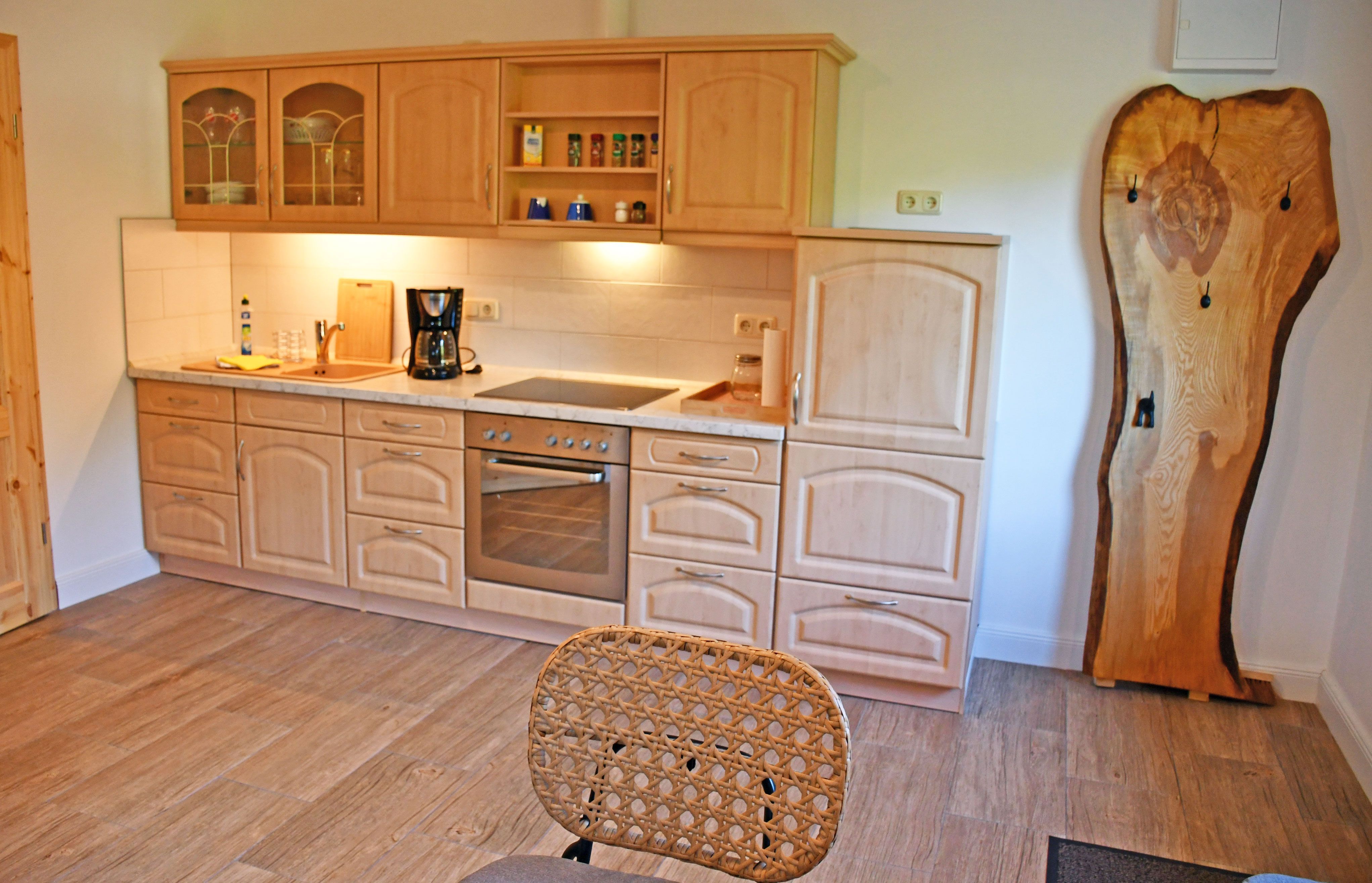Die Küchenzeile ist mit einem Ceranfeld-Herd, Abzugshaube, Backofen, Wasserkocher, Kaffeemaschine, Toaster und Kühlschrank komplett ausgestattet.