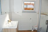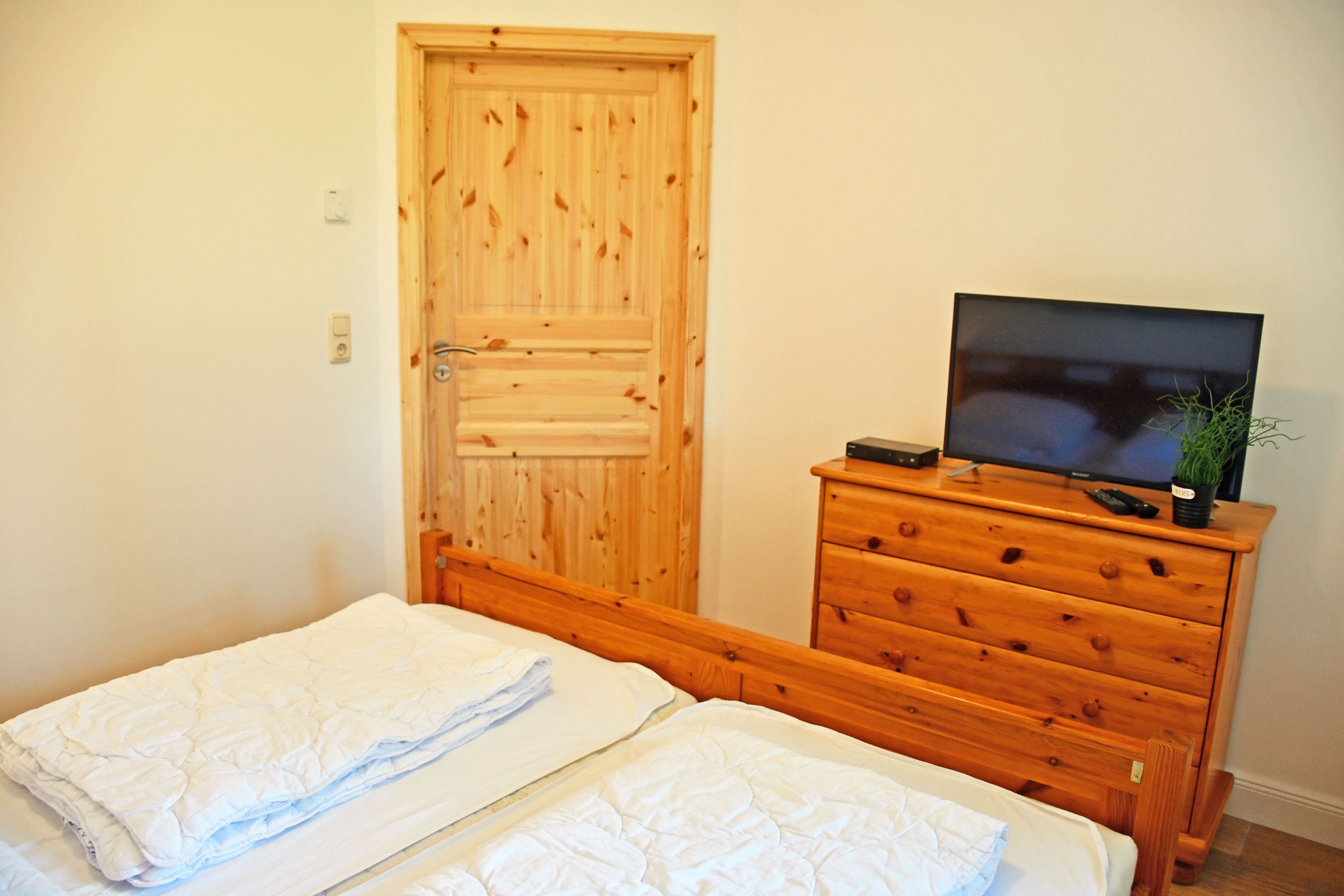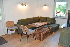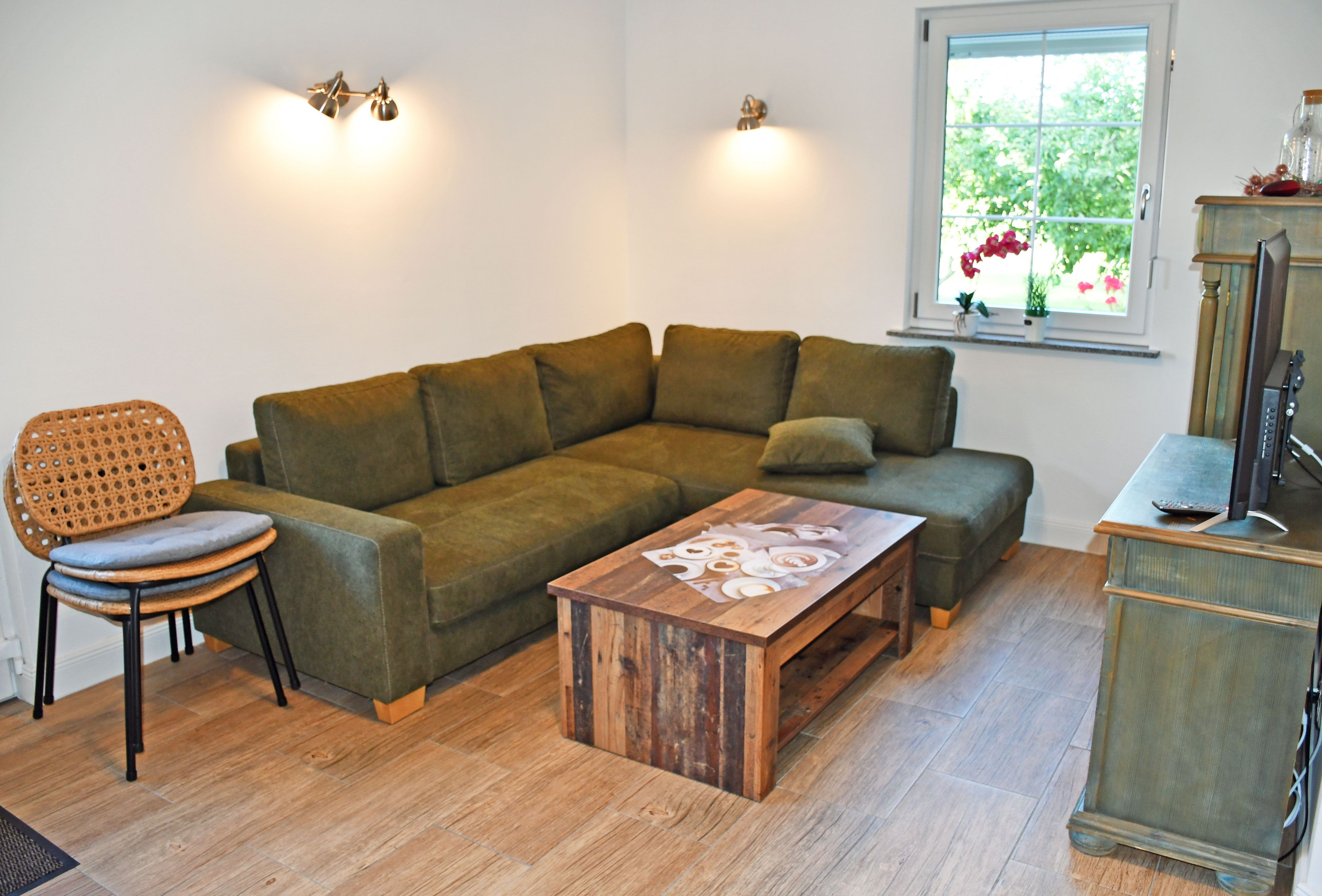 Die neu errichtete Ferienwohnung Achtern im Erdgeschoss verfügt über einen separaten Eingang. Sie ist ca. 35 qm groß, hat Platz für maximal 4 Gäste, wurde modern und liebevoll eingerichtet und bietet ein WLAN-Internetzugang. Im Wohnraum befinden sich eine bequeme Couch mit Tisch und ein modernes Flachbild-TV-Gerät . Hier steht auch ein Esstisch mit Stühlen. Die Couch kann bei Bedarf für zwei Gäste aufgebettet werden.