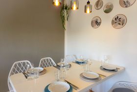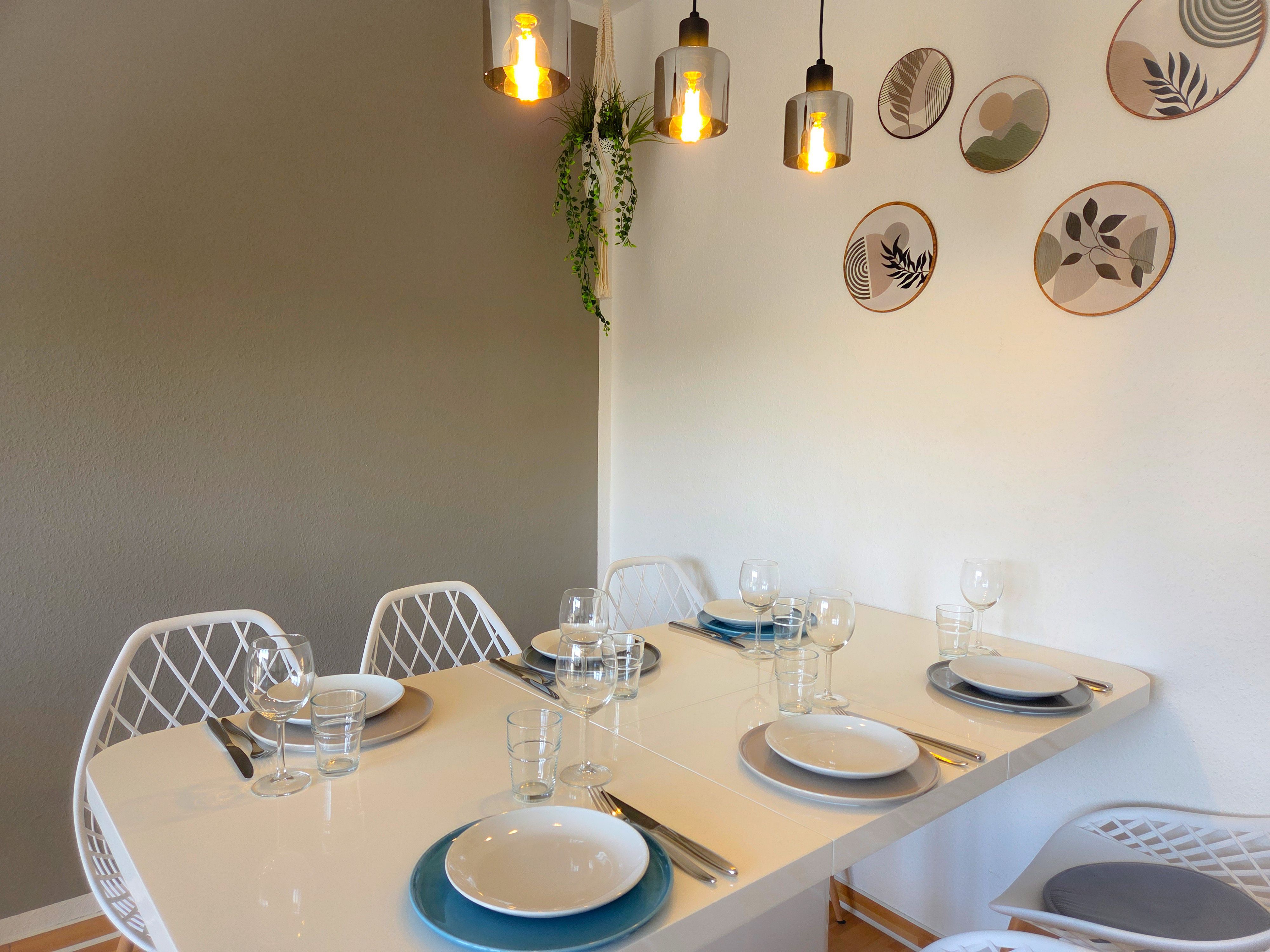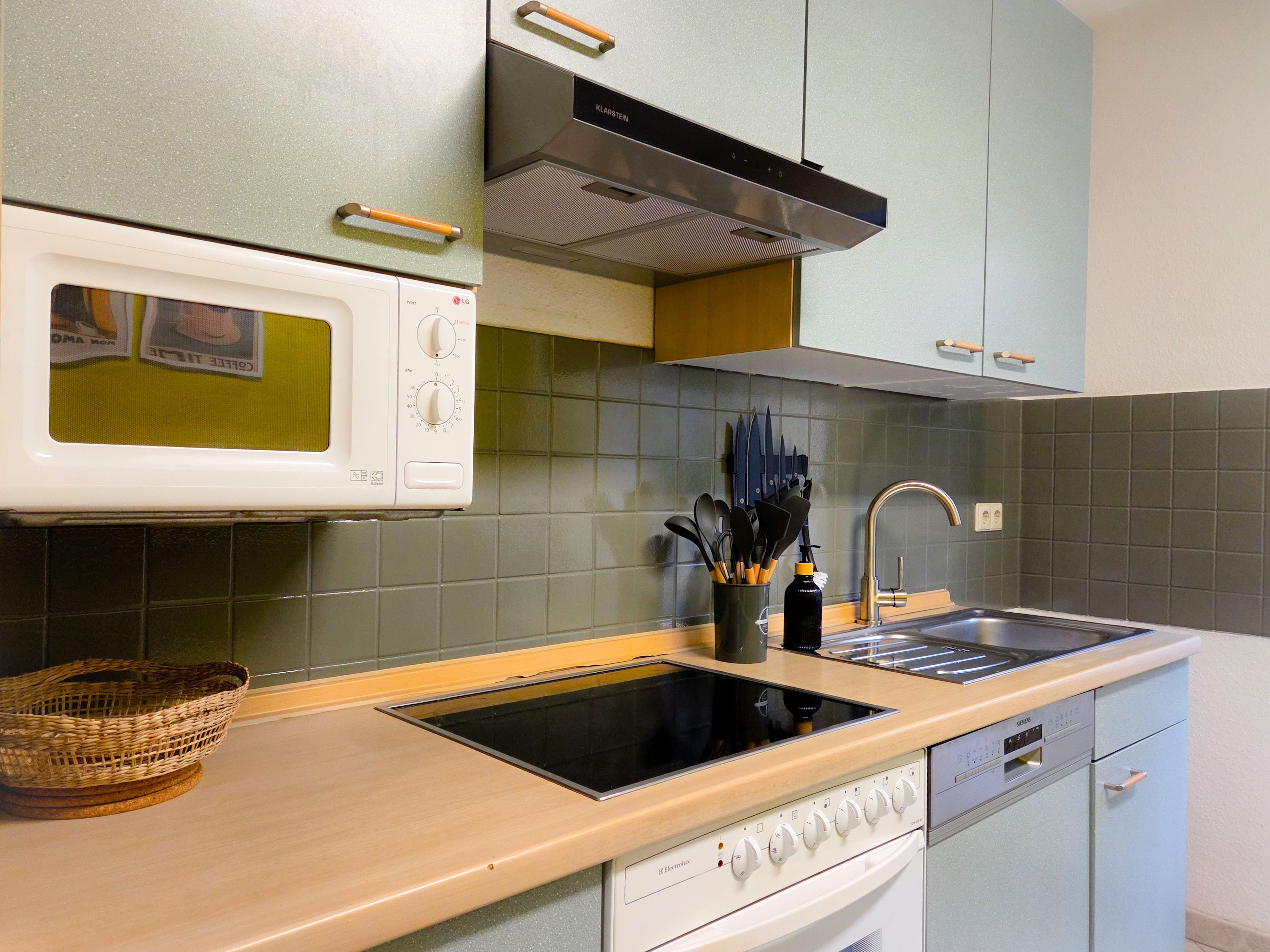 Die separate Küche verfügt über eine komplett ausgestattete Küchenzeile mit Ceranfeld, Backofen, Geschirrspüler, Mikrowelle, Kühl-/Gefrierschrank, Wasserkocher, Toaster, Kaffeemaschine und diverse Küchenutensilien. Auch hier steht Ihnen ein Esstisch mit 4 Stühlen zur Verfügung.