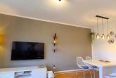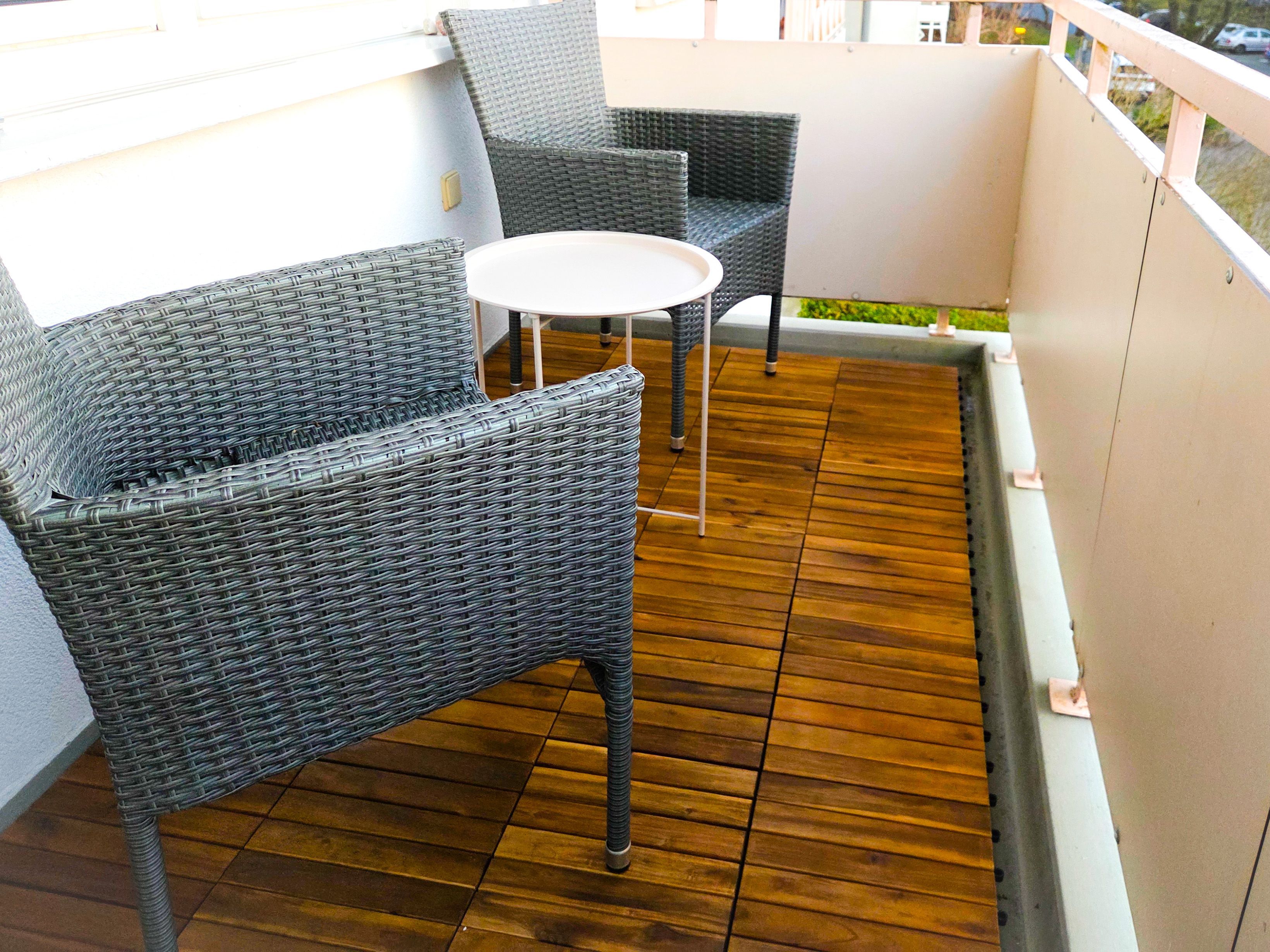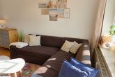 Das helle Wohnzimmer verfügt über eine Eckcouch mit Couchtischchen, kleinem Regal als Ablagemöglichkeit, Mini-Stereo-Anlage und Flachbild-TV. Der gemütliche Essbereich bietet für 6 Personen ausreichend Platz. Vom Wohnbereich aus gelangen Sie auf den Balkon, der Richtung Südwesten ausgerichtet ist.