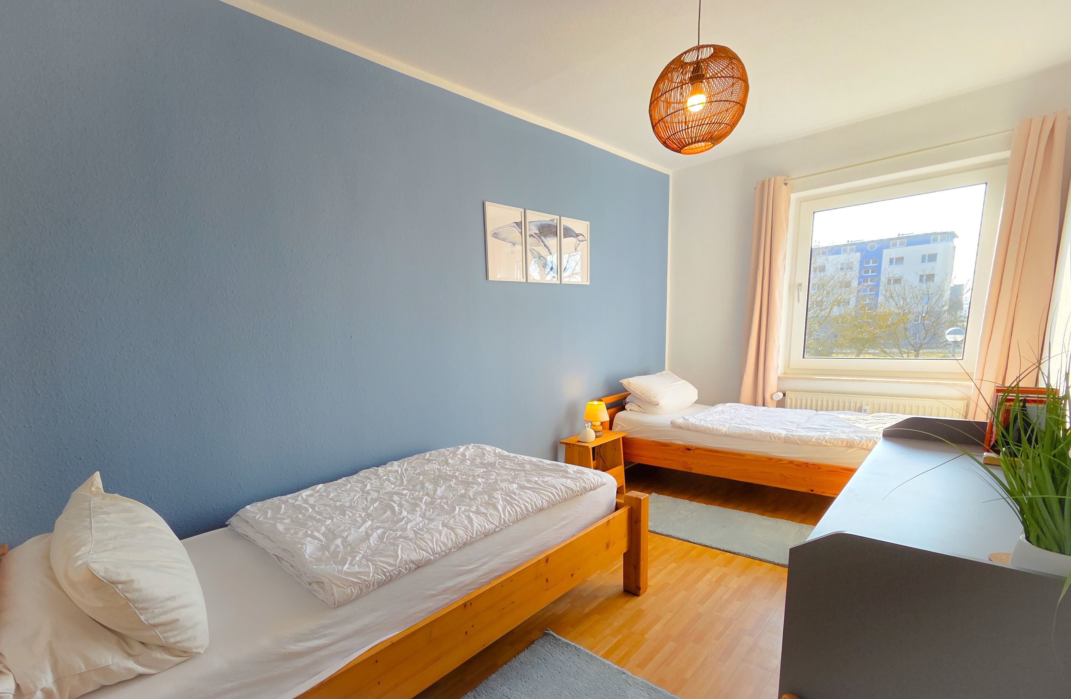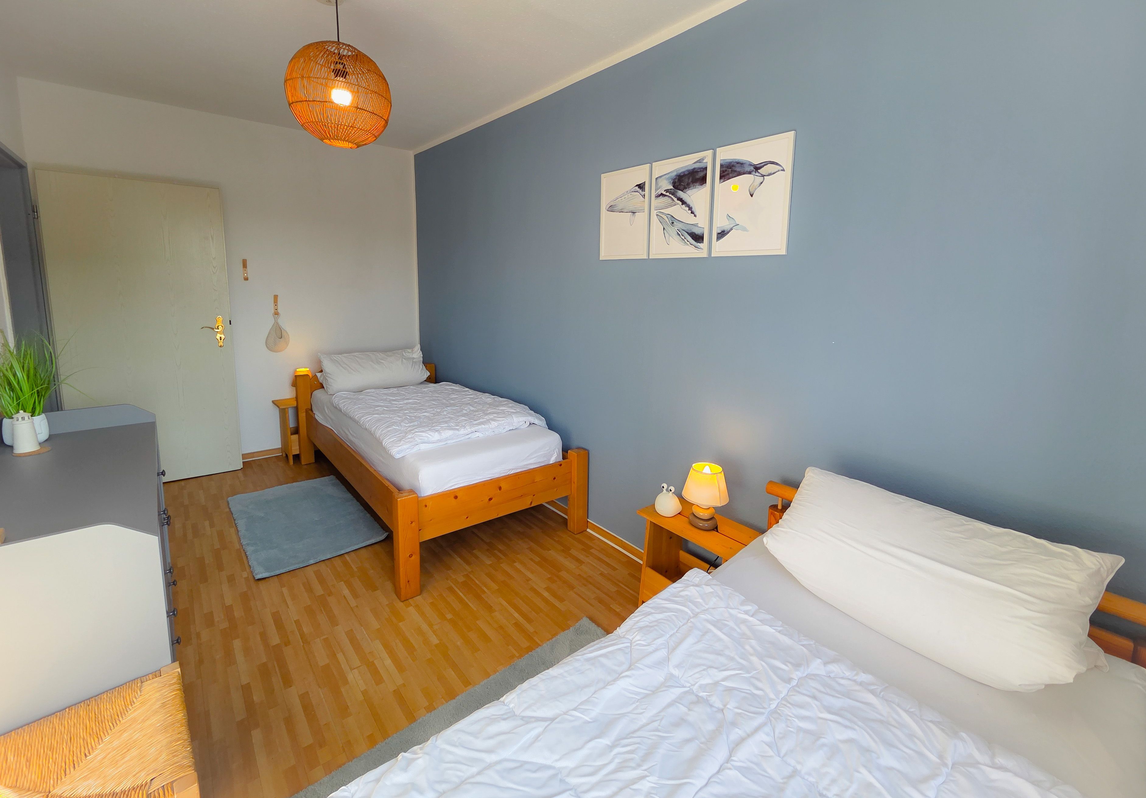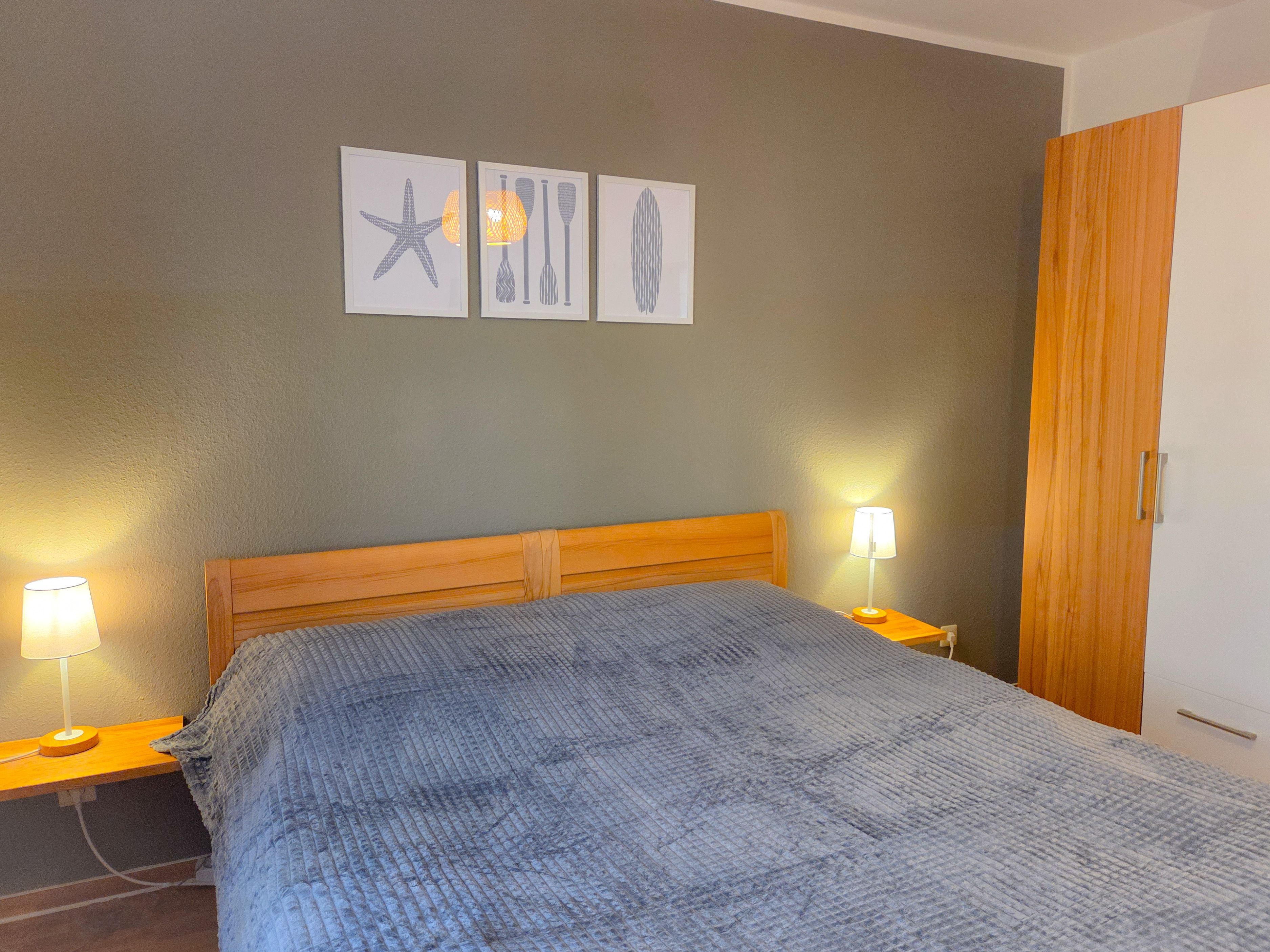 Das 1. Schlafzimmer besteht aus einem Doppelbett (1,60x2,00m mit Einzelmatratzen) mit Nachttischen, Kleiderschrank und einem kleinen Sideboard. Hier ist zusätzlich Platz, um ein Kinderreisebett aufzustellen. Das 2. Schlafzimmer verfügt ebenfalls über ein Doppelbett (1,60x2,00m mit Einzelmatratzen) mit einem kleinen Nachttisch und einem Sideboard. Im 3. Schlafzimmer befinden sich zwei hintereinanderstehende Einzelbetten (je 0,90x2,00m) mit Ablageflächen und einem Sideboard. Alle 3 Schlafzimmer verfügen über Verdunklungsmöglichkeiten.