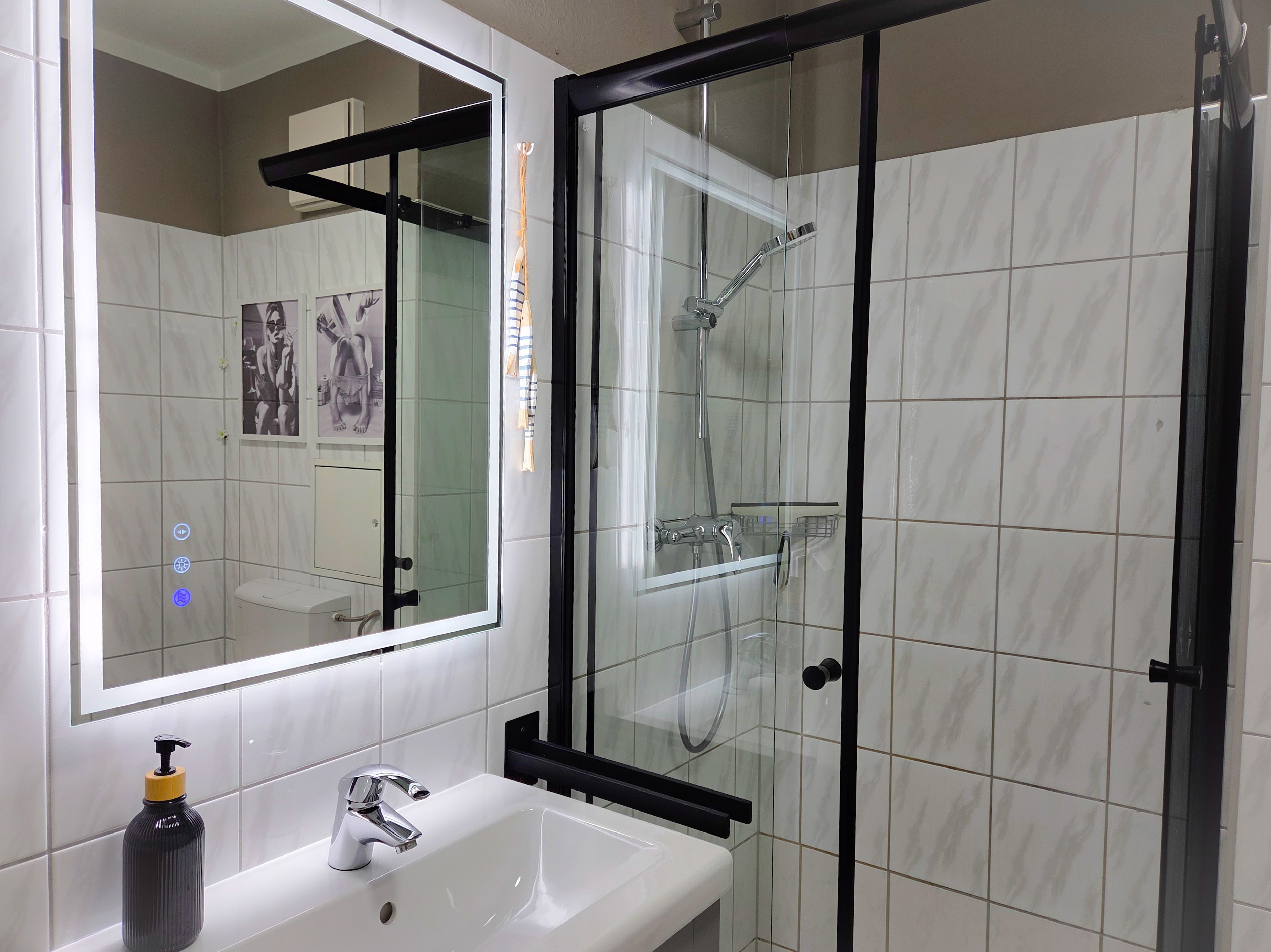 Das Badezimmer mit Dusche, WC und Waschtisch verfügt über eine Waschmaschine. Ergänzt wird die Ausstattung durch Ablageflächen.