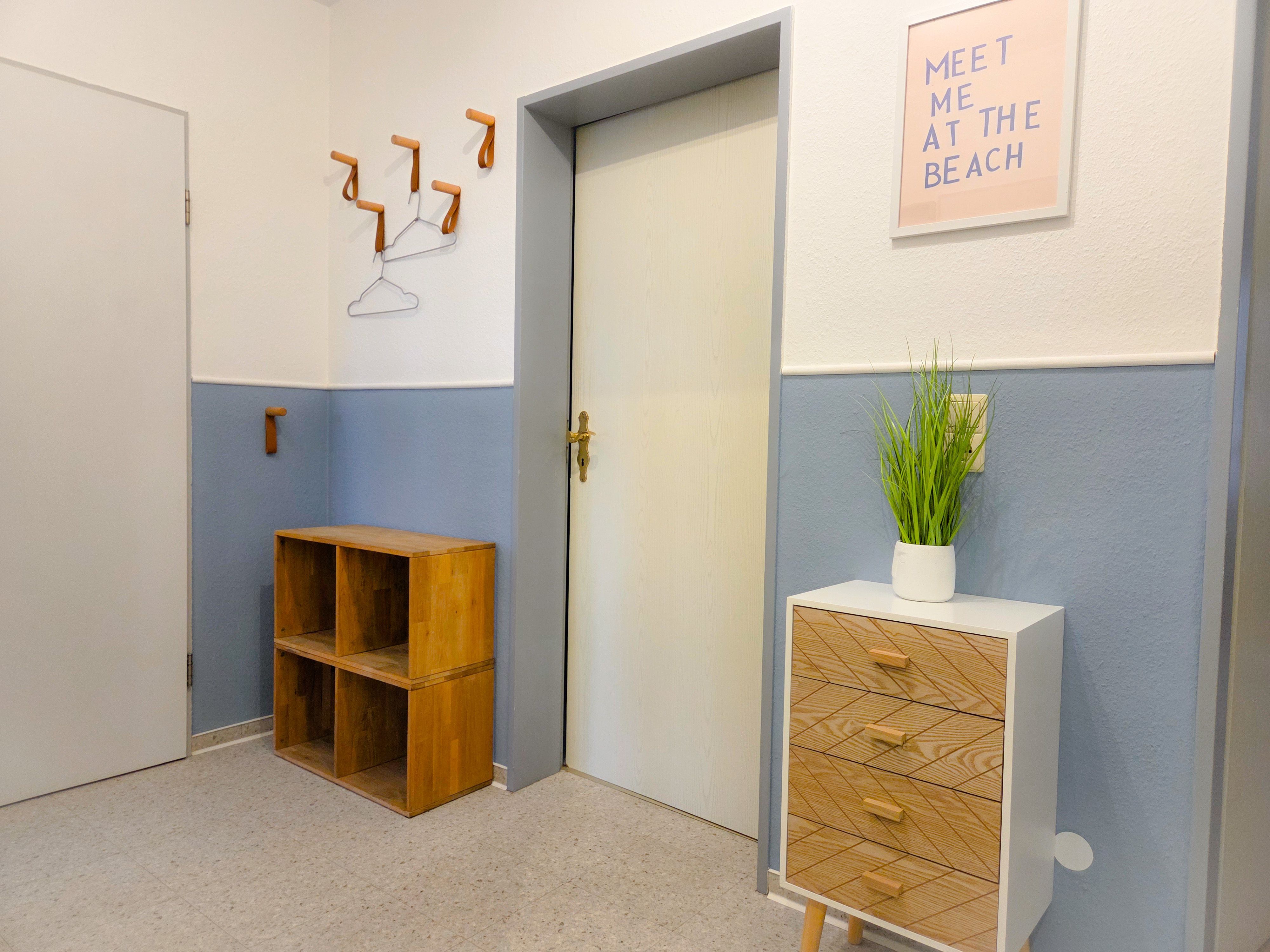 Der Flurbereich mit Garderobe wird durch ein kleines Regal, einen Spiegel und Abstellmöglichkeiten für Taschen sowie Schuhen ergänzt. Alle Bodenbelege sind mit pflegeleichtem Linoleum verlegt. Das Bad und die Küche sind gefliest.