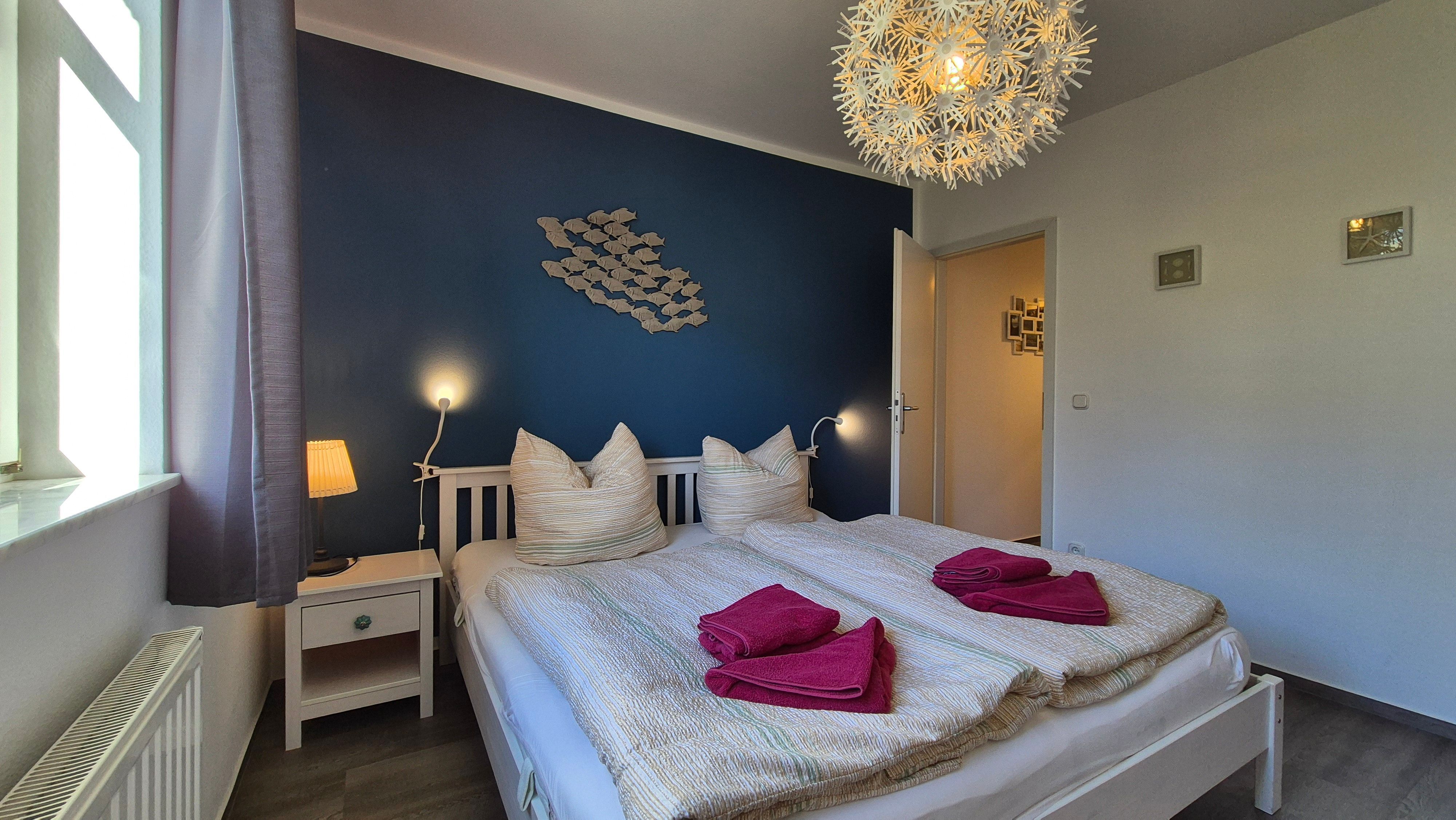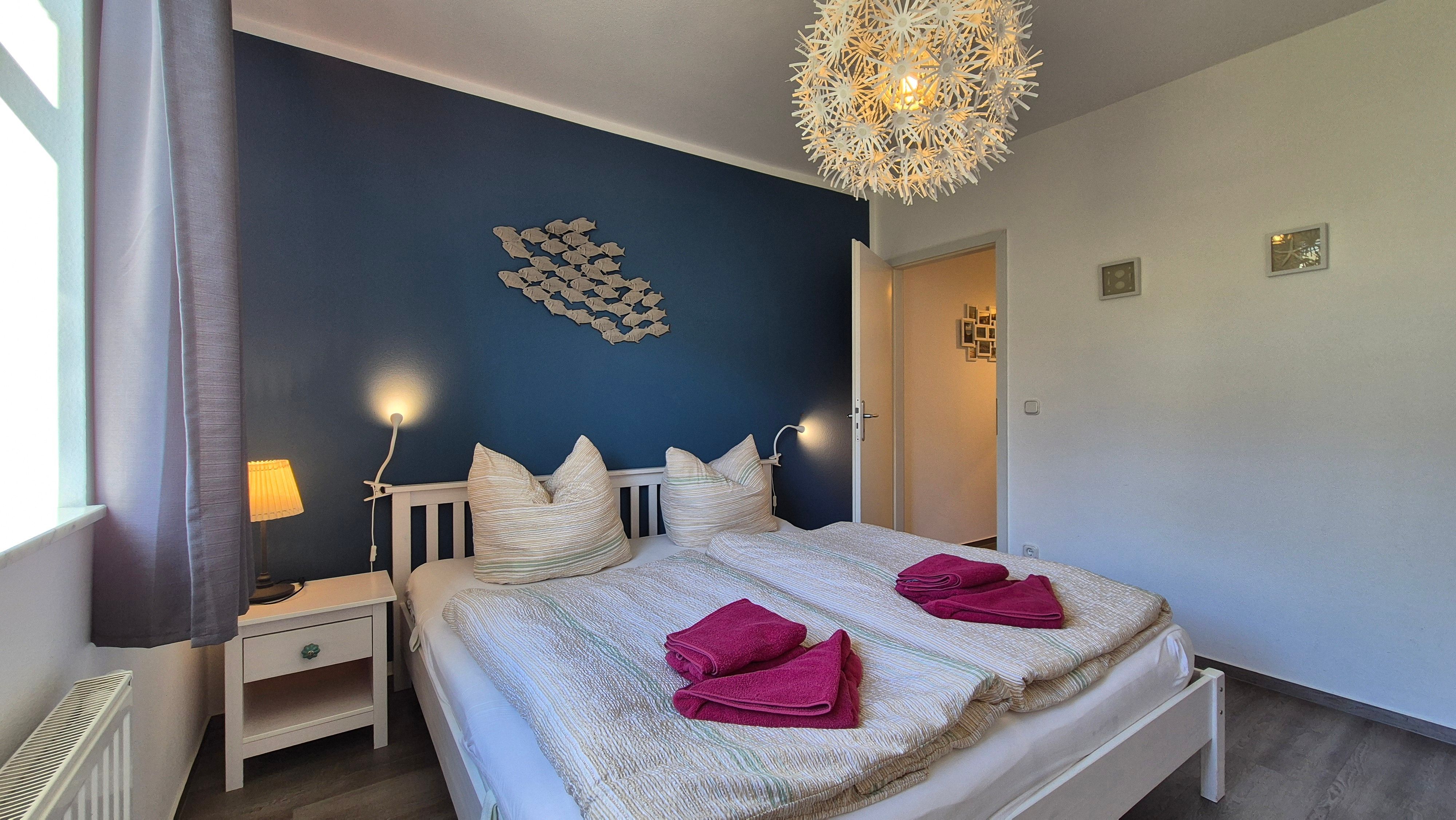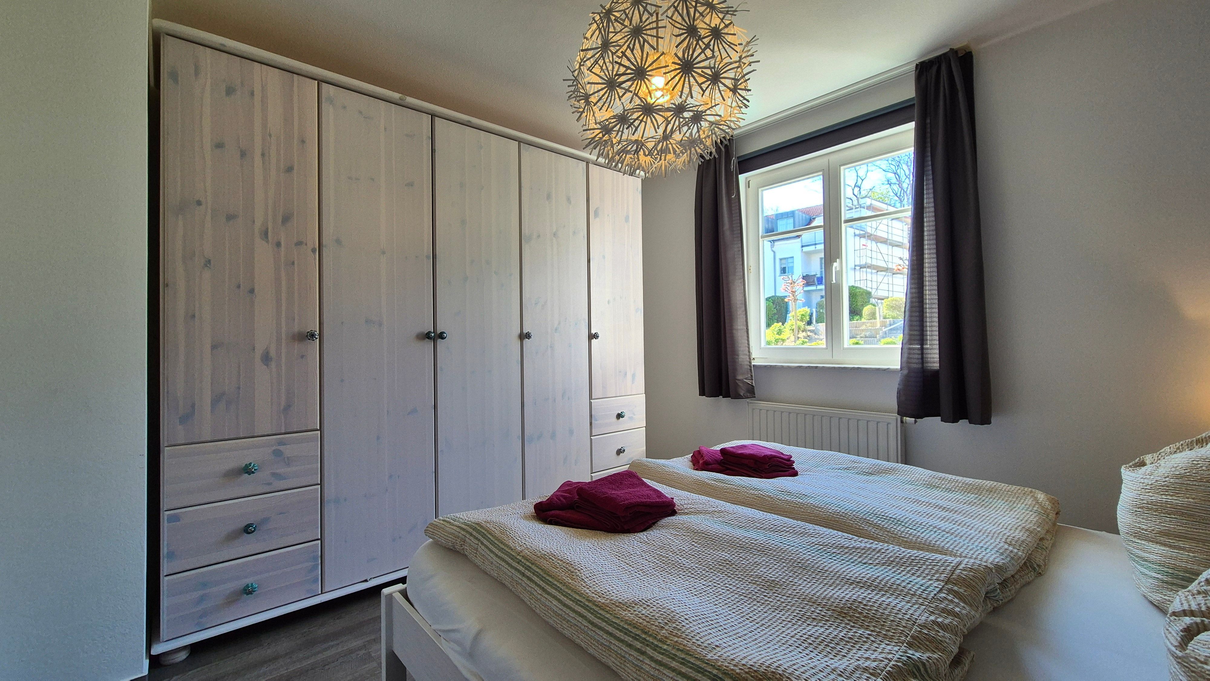 • Schlafzimmer mit Doppelbett (ca. 180 x 200 cm) für 2 Personen und Kleiderschrank.