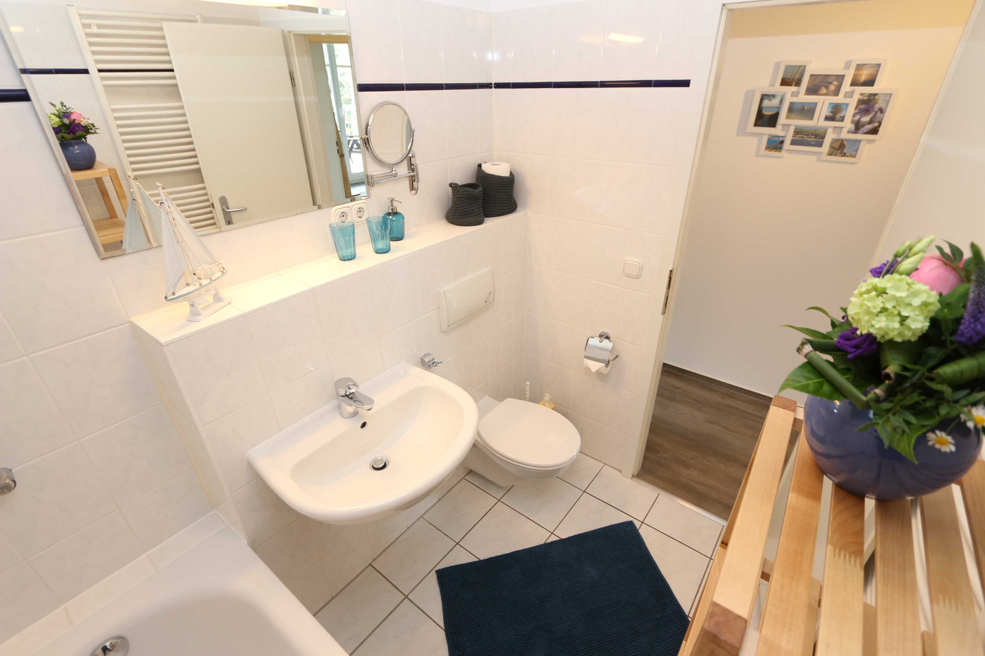 • Badezimmer mit Badewanne, WC, Waschbecken und Handtuchtrockenheizkörper.