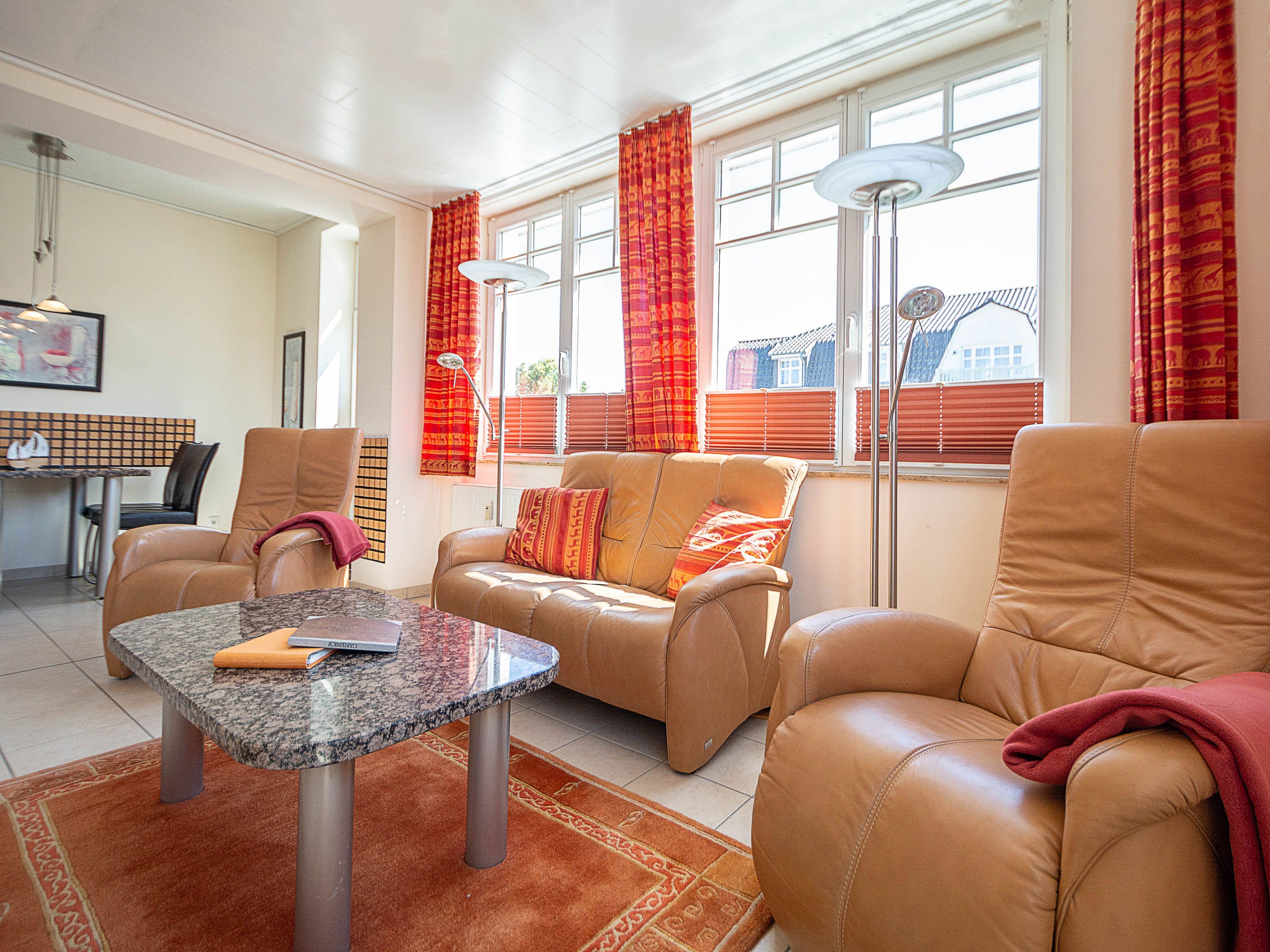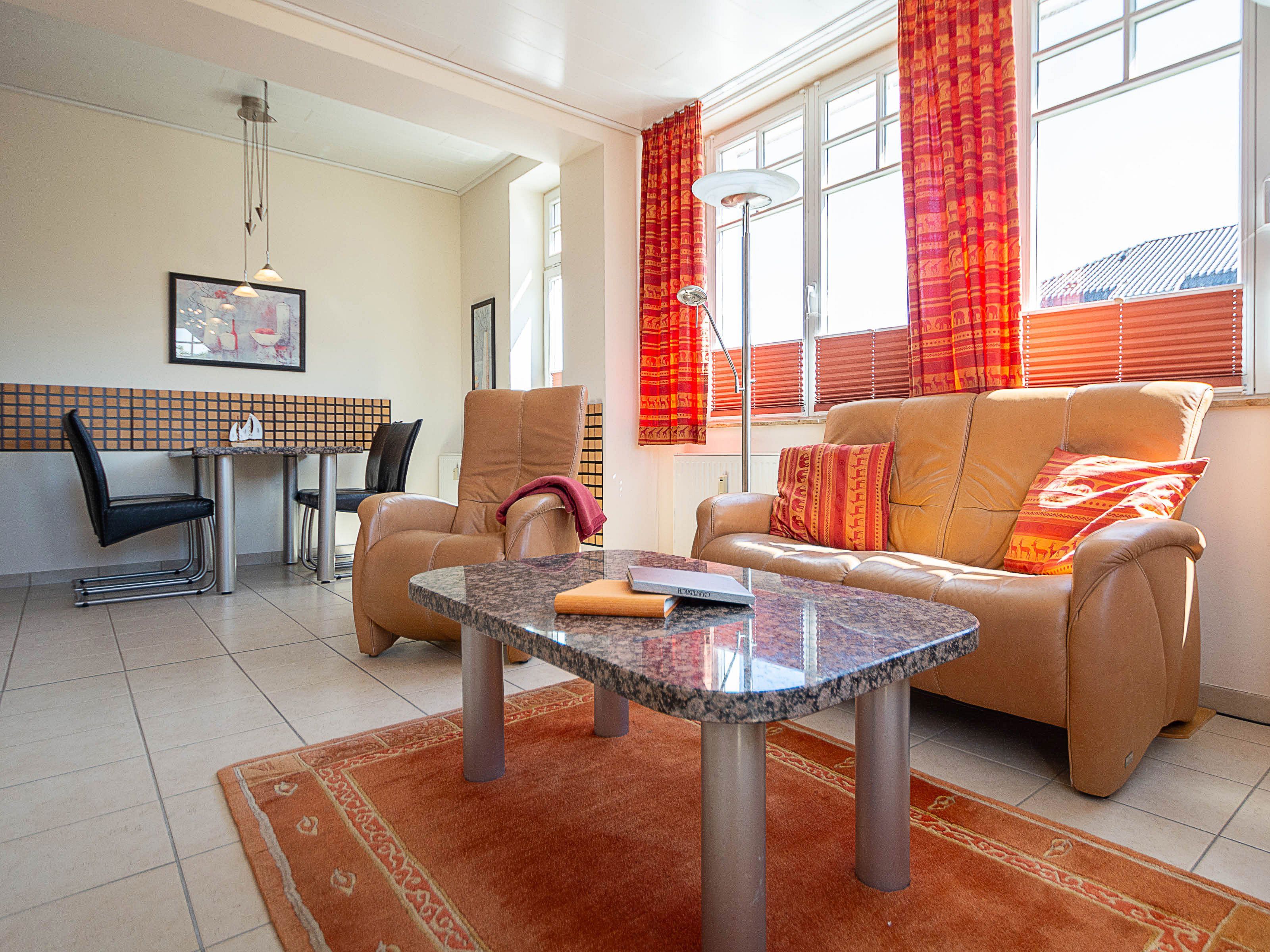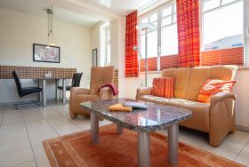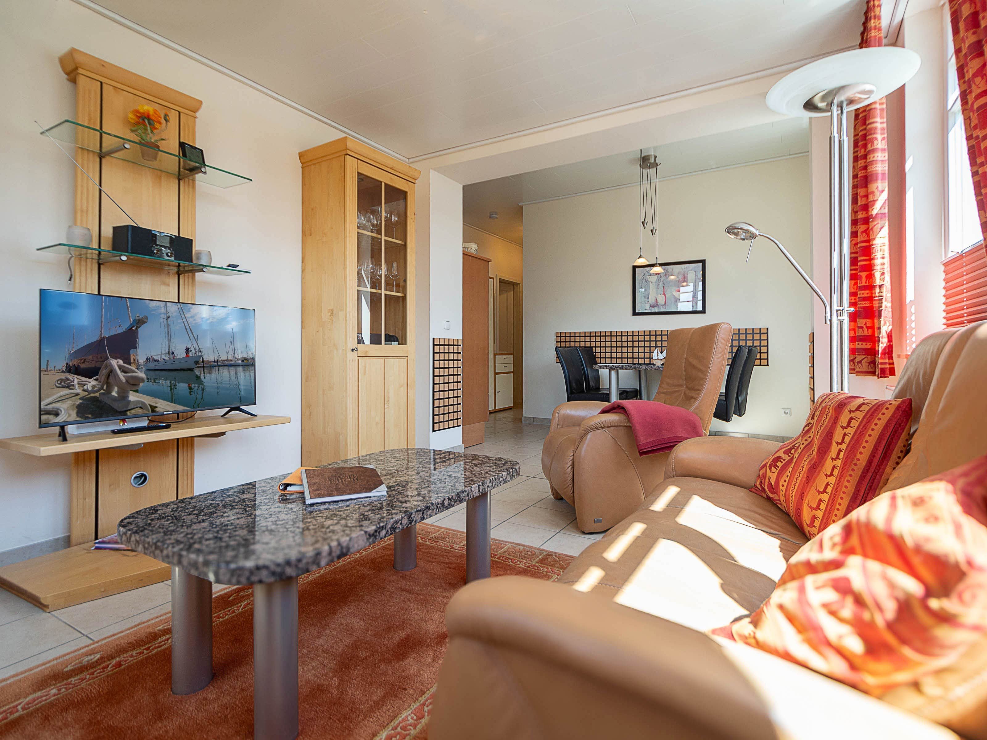 Der liebevoll eingerichtete Wohnbereich ist mit einer bequemen Ledercouch-Kombination, einem Flatscreen-TV sowie einer Stereoanlage eingerichtet. Der angrenzende Essbereich bietet Ihnen reichlich Platz für gemeinsame Mahlzeiten. Von hier betreten Sie den nach Osten ausgerichteten Balkon. Hier können Sie Ihren Tag am Meer zu einem Frühstück in der Morgensonne starten oder einfach nur Relaxen und Sonne tanken.