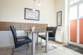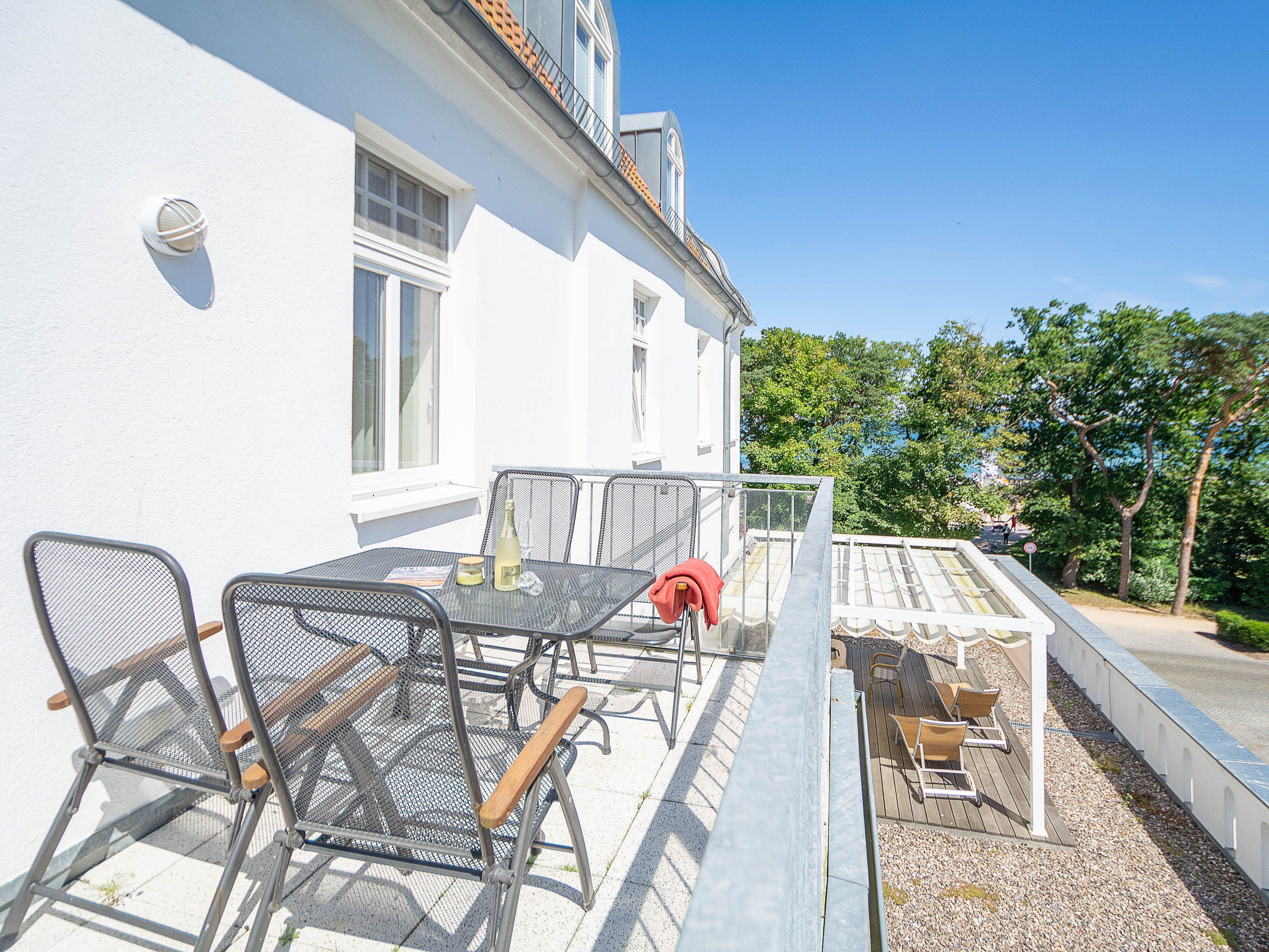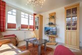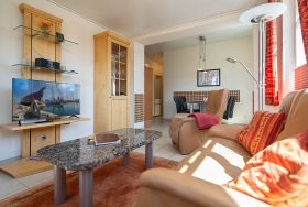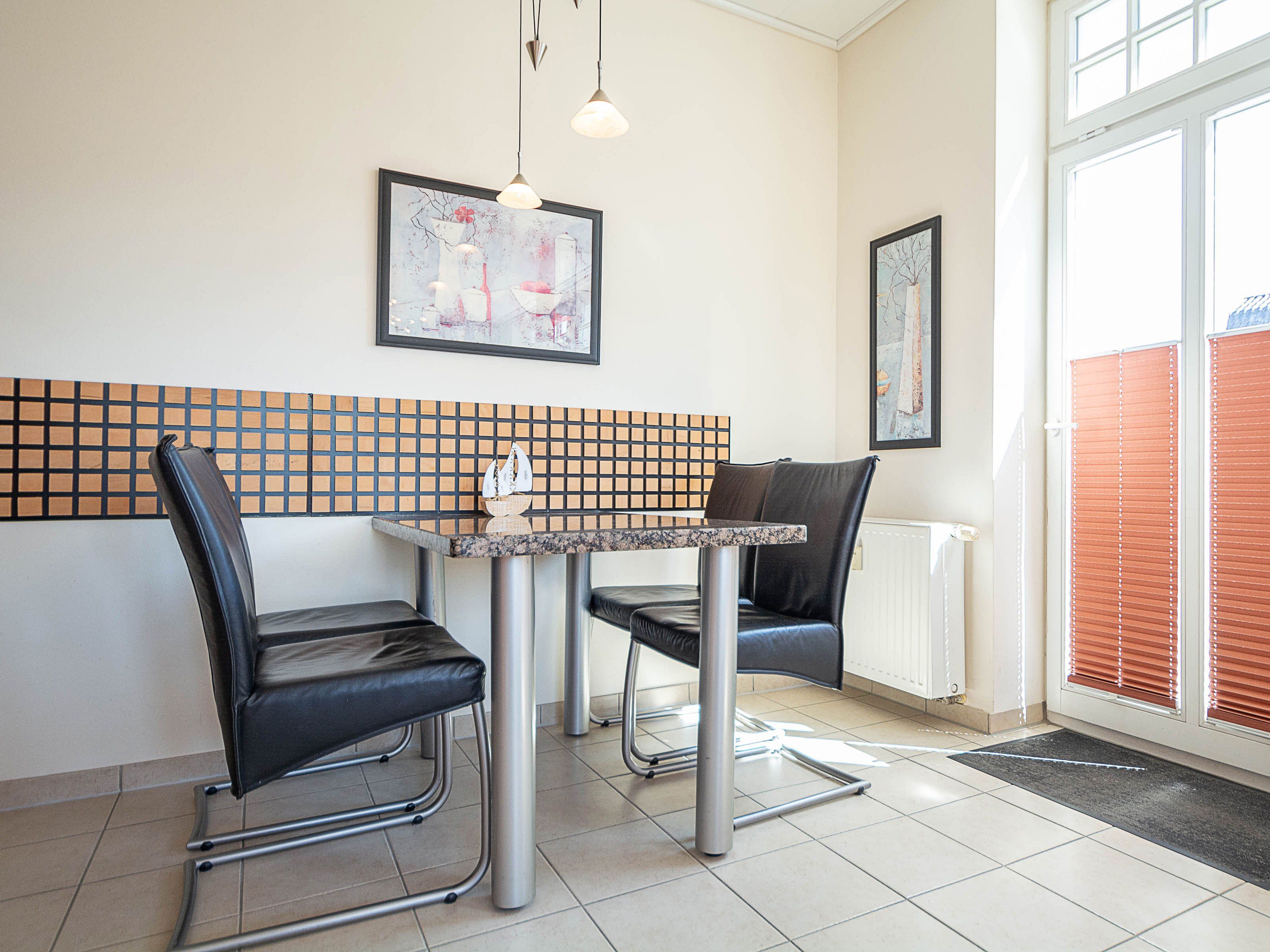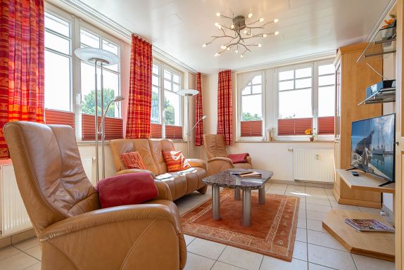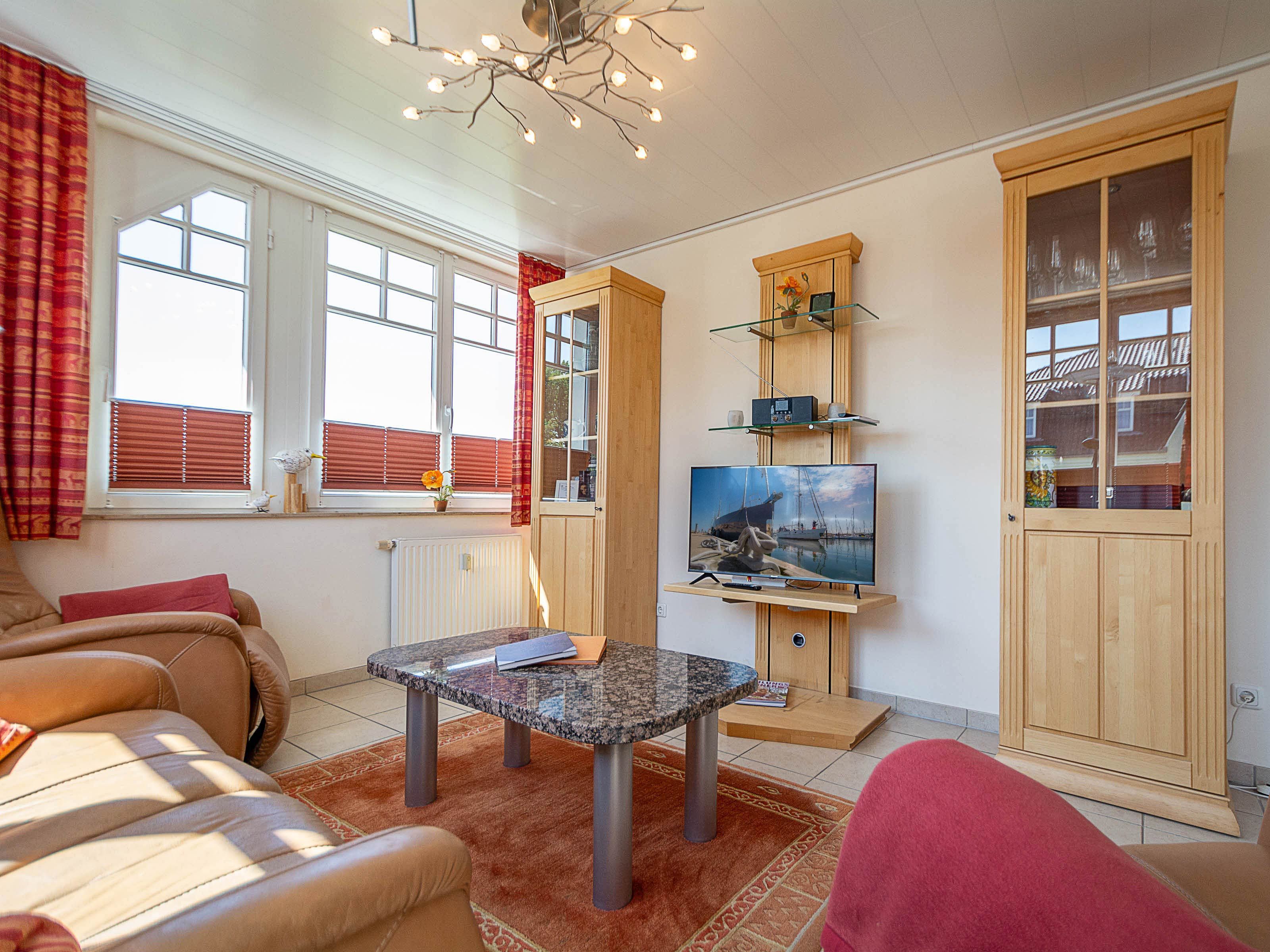 Der liebevoll eingerichtete Wohnbereich ist mit einer bequemen Ledercouch-Kombination, einem Flatscreen-TV sowie einer Stereoanlage eingerichtet. Der angrenzende Essbereich bietet Ihnen reichlich Platz für gemeinsame Mahlzeiten. Von hier betreten Sie den nach Osten ausgerichteten Balkon. Hier können Sie Ihren Tag am Meer zu einem Frühstück in der Morgensonne starten oder einfach nur Relaxen und Sonne tanken.