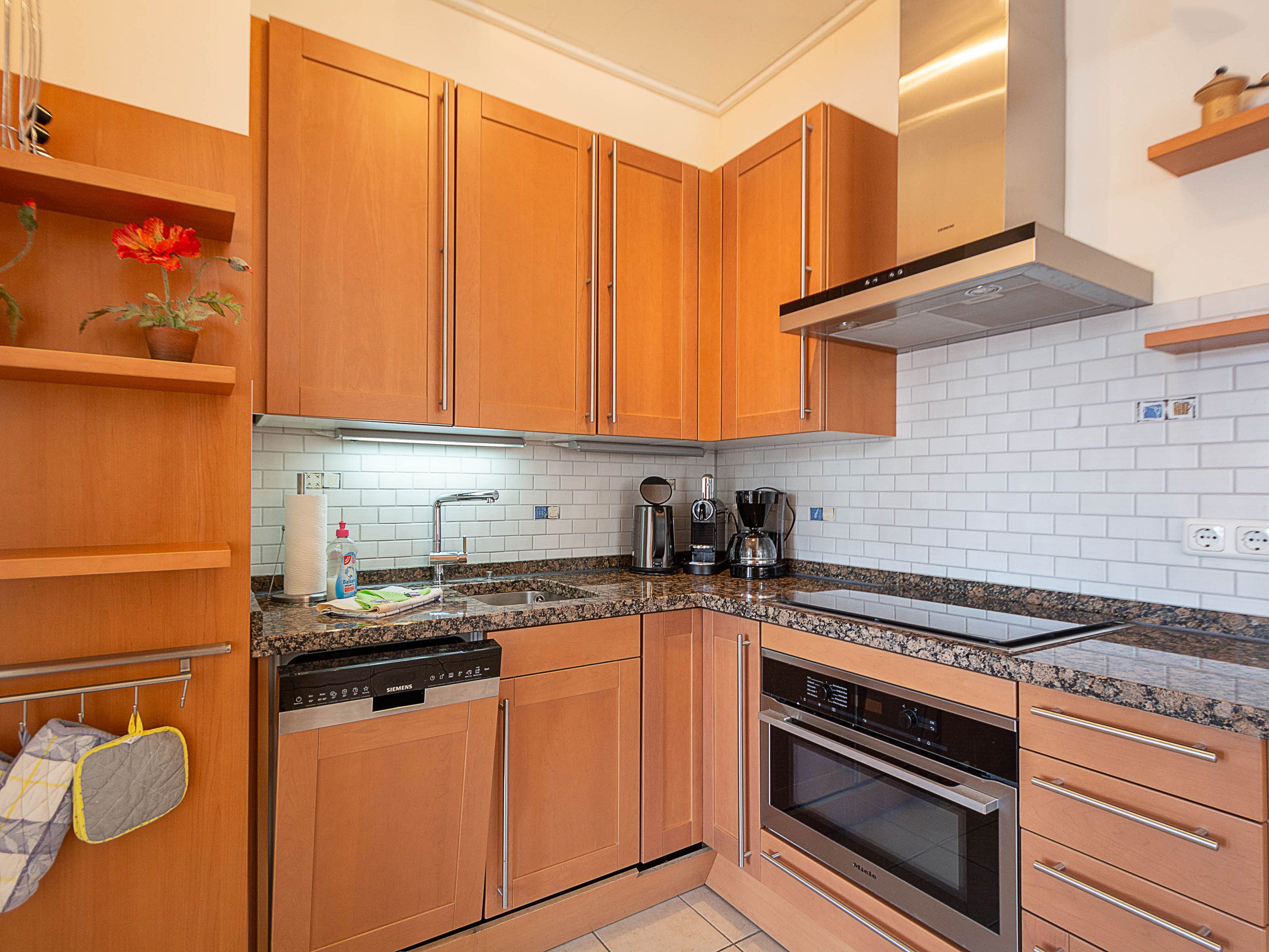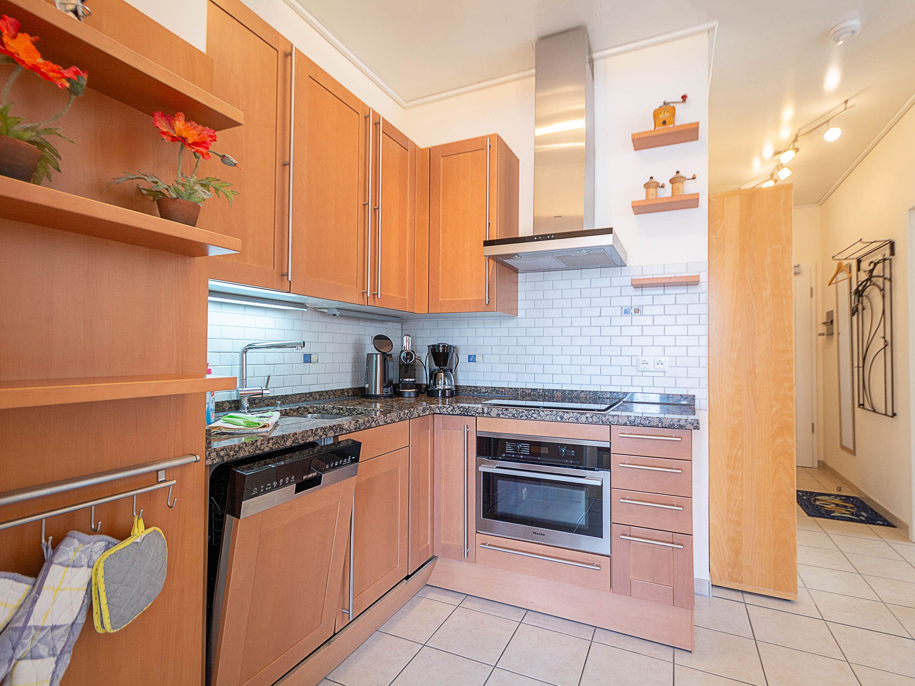 Die offene Küchenzeile im modernen Landhausstil hält für Sie alle wichtigen Küchengeräte und -utensilien bereit, die Sie für Ihr perfektes Dinner benötigen: Ein 4-Zonen-Cerankochfeld mit Dunstabzug, ein Backofen, ein Geschirrspüler sowie ein Kühlschrank mit Gefrierfach befinden sich in der Küche. Eine Kaffeemaschine, ein Wasserkocher und ein Toaster sowie genügend Koch- und Essgeschirr vervollständigen die Kücheneinrichtung.