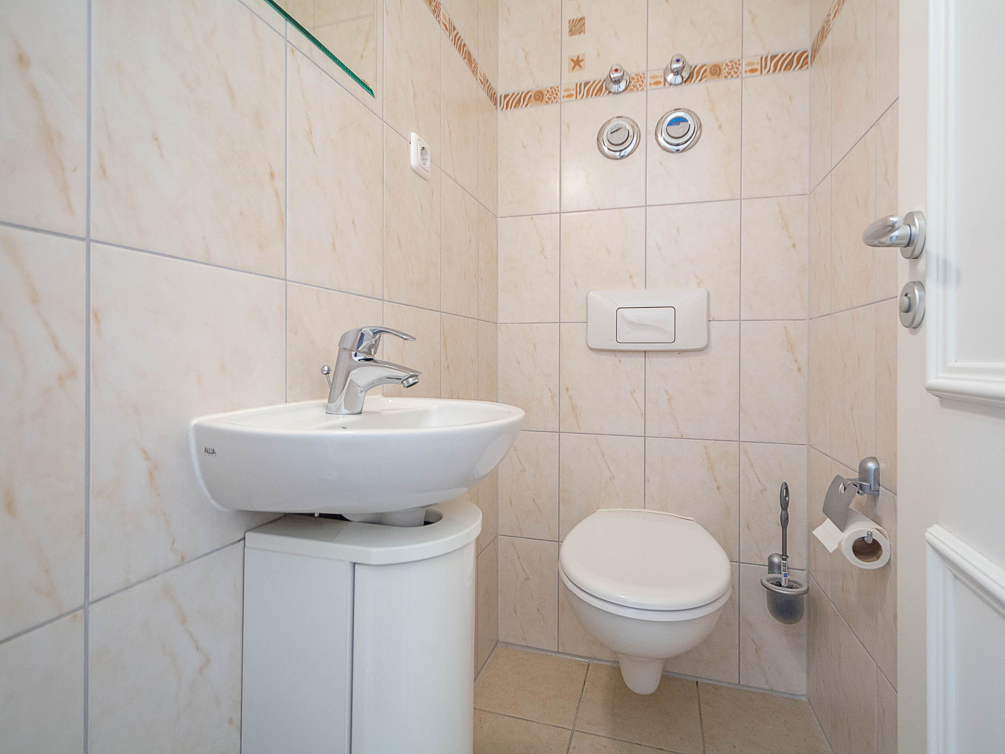 Das geflieste Bad ist ausgestattet mit einer Dusche, einem Doppel-Waschbecken, und Föhn. Ein Handtuchheizkörper sorgt für kuschelig warme Handtücher. Das separate WC komplettiert die Gesamteinrichtung dieser Ferienwohnung.