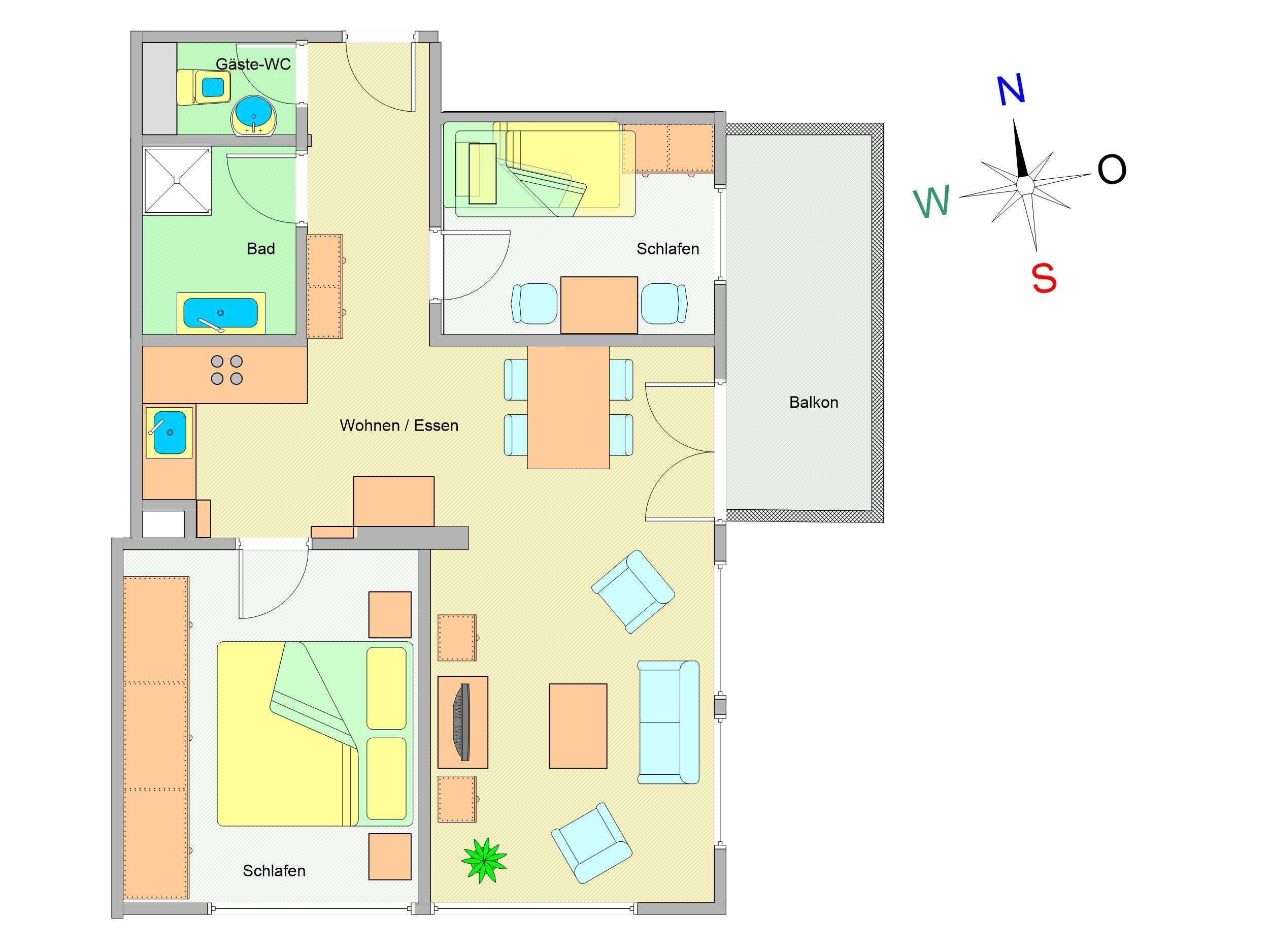 Herzlich willkommen in der Ferienwohnung Nr. 30 im Haus Miramare! Die helle freundliche 3-Raum-Ferienwohnung befindet sich im 2. Obergeschoss des Hauses. Auf 59 qm Wohnfläche können hier bis zu 4 Personen erholsame Urlaubstage genießen. Es empfangen Sie ein heller offener Wohn-und Essbereich mit einer Küchenzeile, zwei Schlafzimmer, ein Duschbad und ein separates WC sowie ein Balkon mit Ost-Ausrichtung.