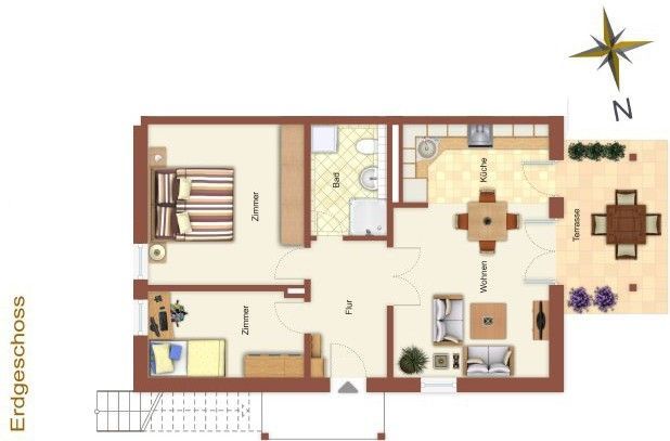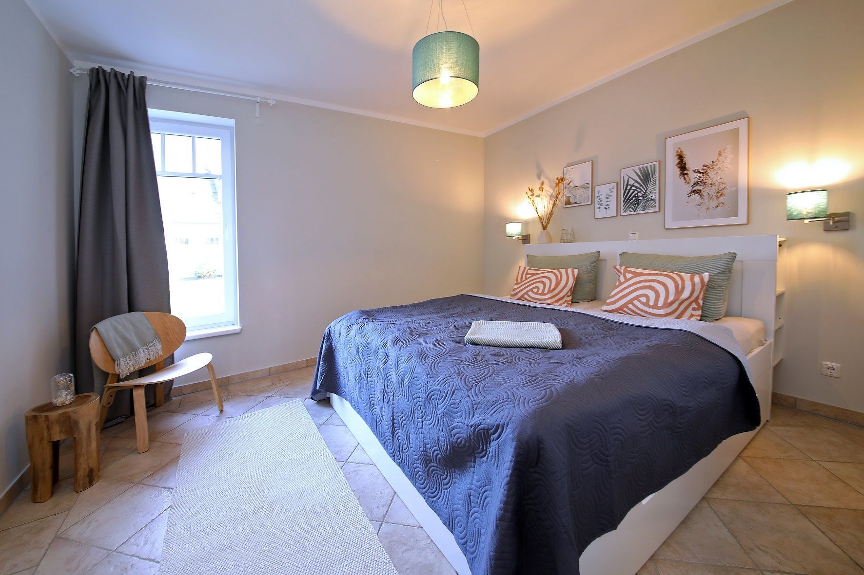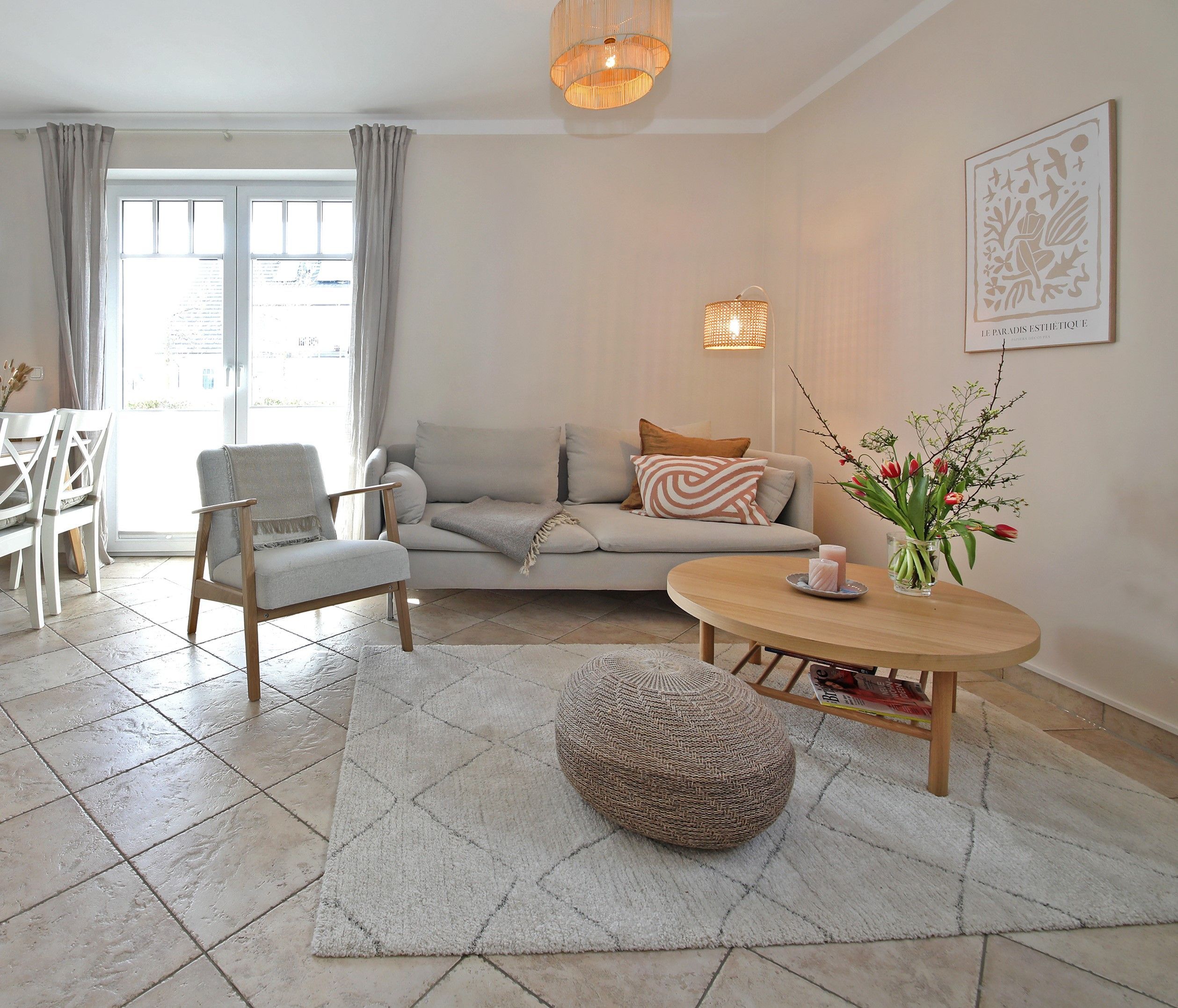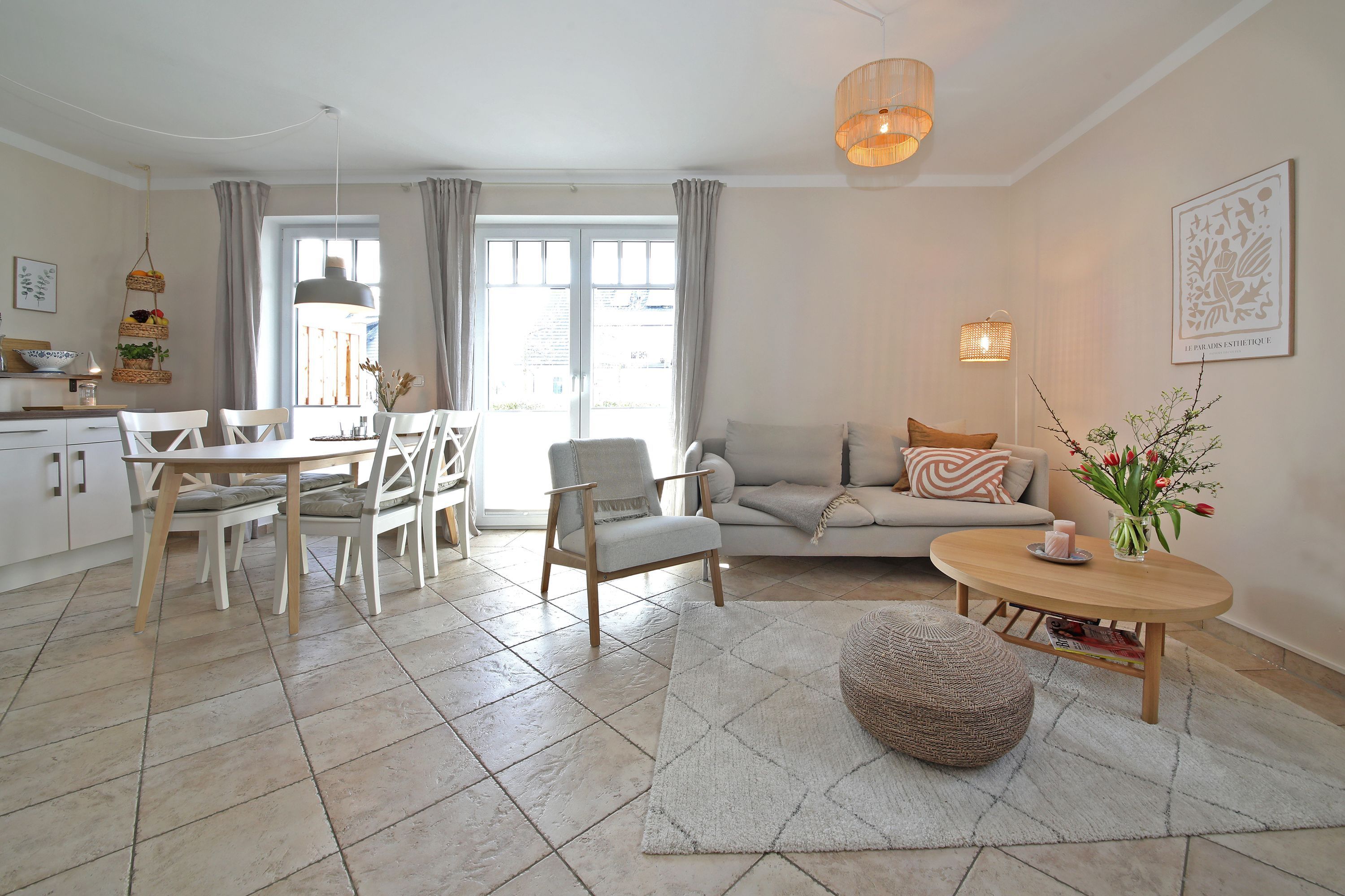 Die gemütliche Ferienwohnung wurde 2022 renoviert und neu eingerichtet und befindet sich im Erdgeschoss des Hauses. Der Wohnbereich ist mit einem Kaminofen (Kaminholz muss selbst organisiert werden) und einer gemütlicher Sitzecke inklusive Smart-TV und Fernsehen über WaipuTV mit über 250 Sendern ausgestattet. Vom Wohnbereich gelangen Sie direkt auf die schöne, sonnige Terrasse mit Gartenmöbeln. Die offene Küche ist voll ausgestattet mit Herd inklusive Backofen, Kühlschrank inklusive Gefriermöglichkeit, Geschirrspülmaschine, Mikrowelle, Kaffeemaschine, Toaster und Wasserkocher. Der Essbereich sind in den Wohnbereich integriert. Das erste Schlafzimmer ist mit einem Doppelbett und Kleiderschrank eingerichtet und das zweite kleinere Schlafzimmer verfügt über ein Bett mit Ausziehfunktion für eine zweite Person. Ein Kinderreisebett und ein Kinderhochstuhl stehen kostenfrei zur Verfügung. Eine Fußbodenheizung sorgt für wohlige Wärme in allen Räumen. Das Badezimmer ist mit Dusche, WC und Föhn ausgestattet.
