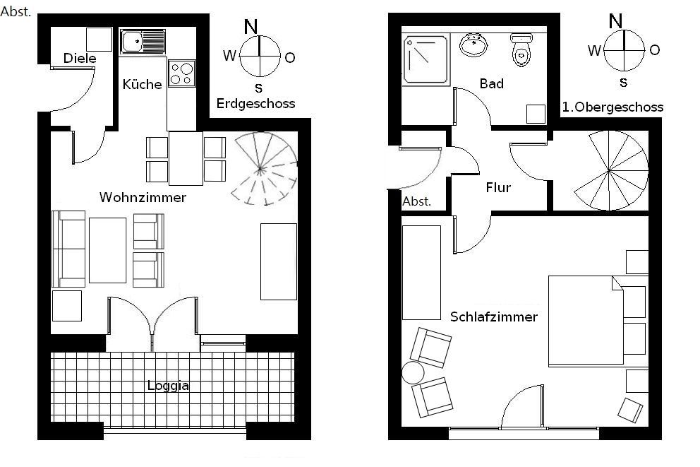 Die komfortabel ausgestattete Wohnung für bis zu 4 Personen (61 qm) erstreckt sich über zwei Etagen (EG und 1.OG). Dies trennt in angenehmer Weise Wohn- und Schlafbereich. Die Wohnung mit Südausrichtung verfügt im Erdgeschoss über ein Wohnzimmer mit Couch, welche auch zum Schlafen geeignet ist, eine Essecke mit 4 Stühlen sowie bequeme Sessel. Für die Unterhaltung sorgt ein Flachbild-TV und HiFi-Anlage. Die Die vollständig ausgestattete Küche mit Ceranherd mit Backofen, Geschirrspülmaschine, Mikrowelle, Kühlschrank mit Gefrierfach, Kaffeemaschine, Wasserkocher und Toaster lässt keine Wünsche offen. Vom Wohnzimmer besteht Zugang zur überdachten Terrasse (Loggia zum Innenhof). Über eine Wendeltreppe gelangen Sie in das 1. OG, wo sich auch das Schlafzimmer mit Doppelbett (2,20 m lang mit offenem Fußende) und zusätzlichem 55 LCD-TV, ein Abstellraum sowie das 2024 vollständig erneuerte Bad mit DU/WC und Kosmetikspiegel. Eine gemütliche Sitzmöglichkeit mit zwei Sesseln und kleinem Tisch komplettiert die Ausstattung der Wohnung. Zusätzlich ist im 1. OG ein zweiter Eingang eingebaut worden, um leichter aus dem großen Glastreppenhaus ins Obergeschoss zu gelangen. Das Internet (W-LAN) ist kostenfrei nutzbar. Ein Kinderbett mit Wäsche (im Elternschlafzimmer) sowie ein Hochstuhl können auf Anfrage gegen eine Gebühr von einmalig 50 € vom Verwalter zur Verfügung gestellt werden.