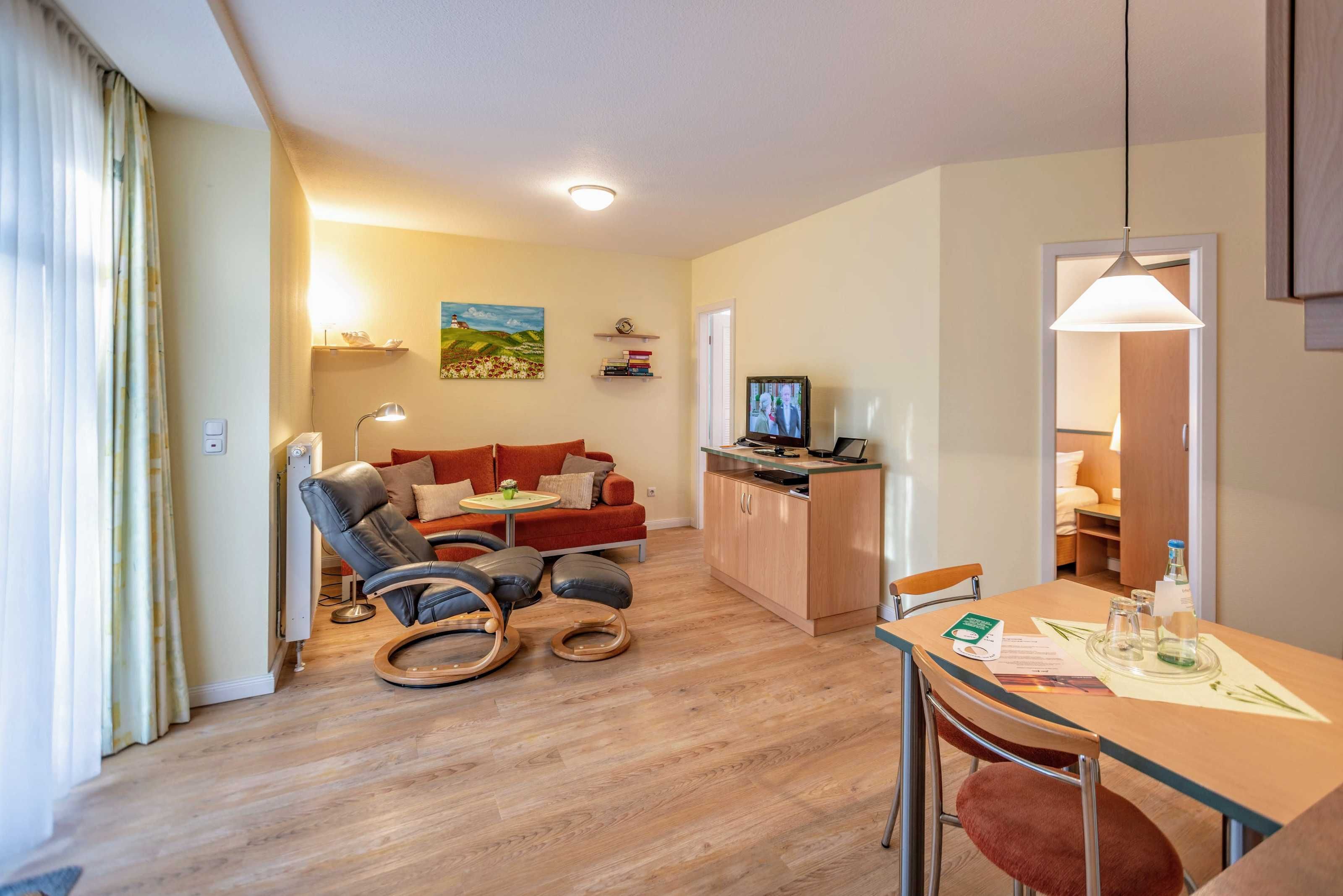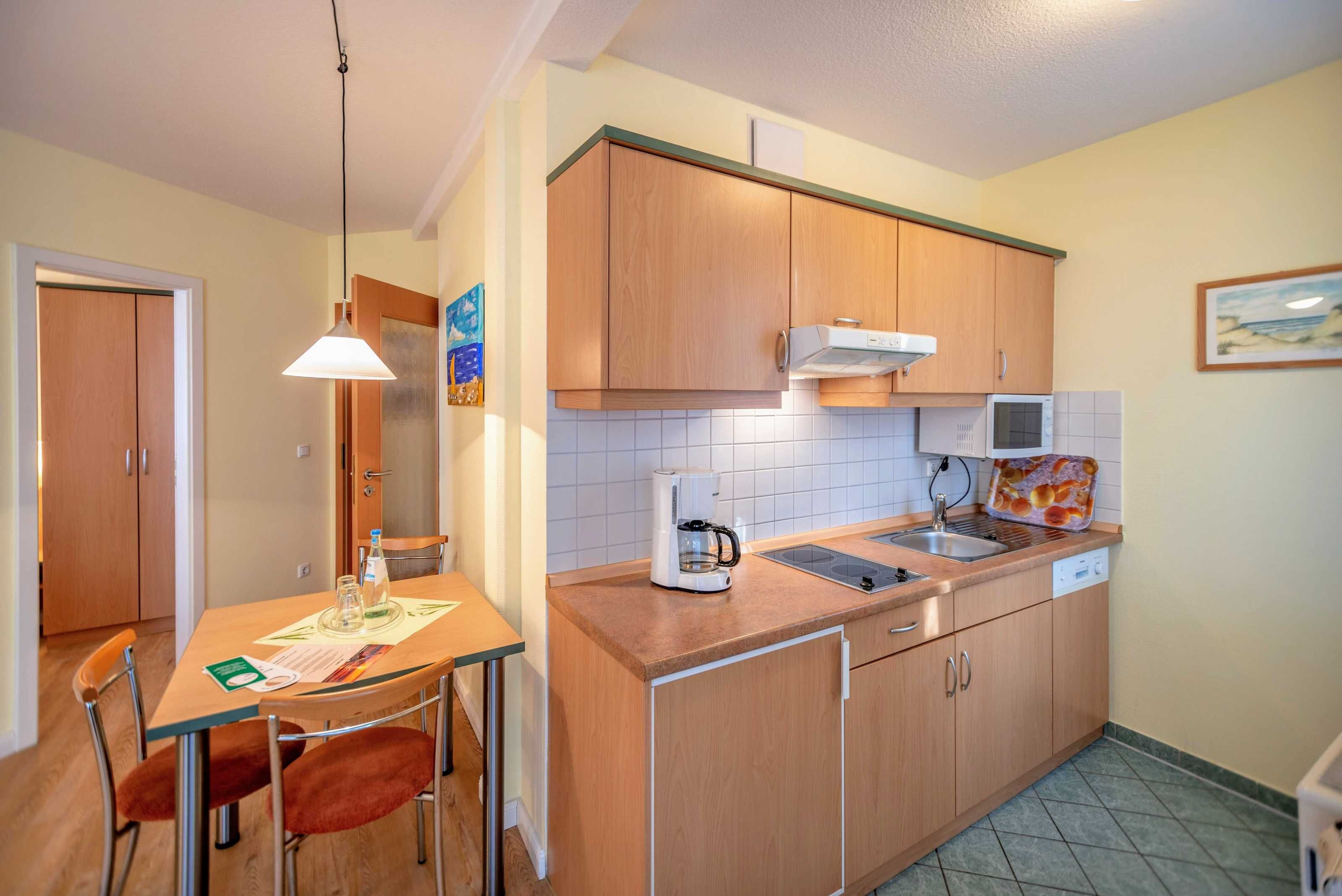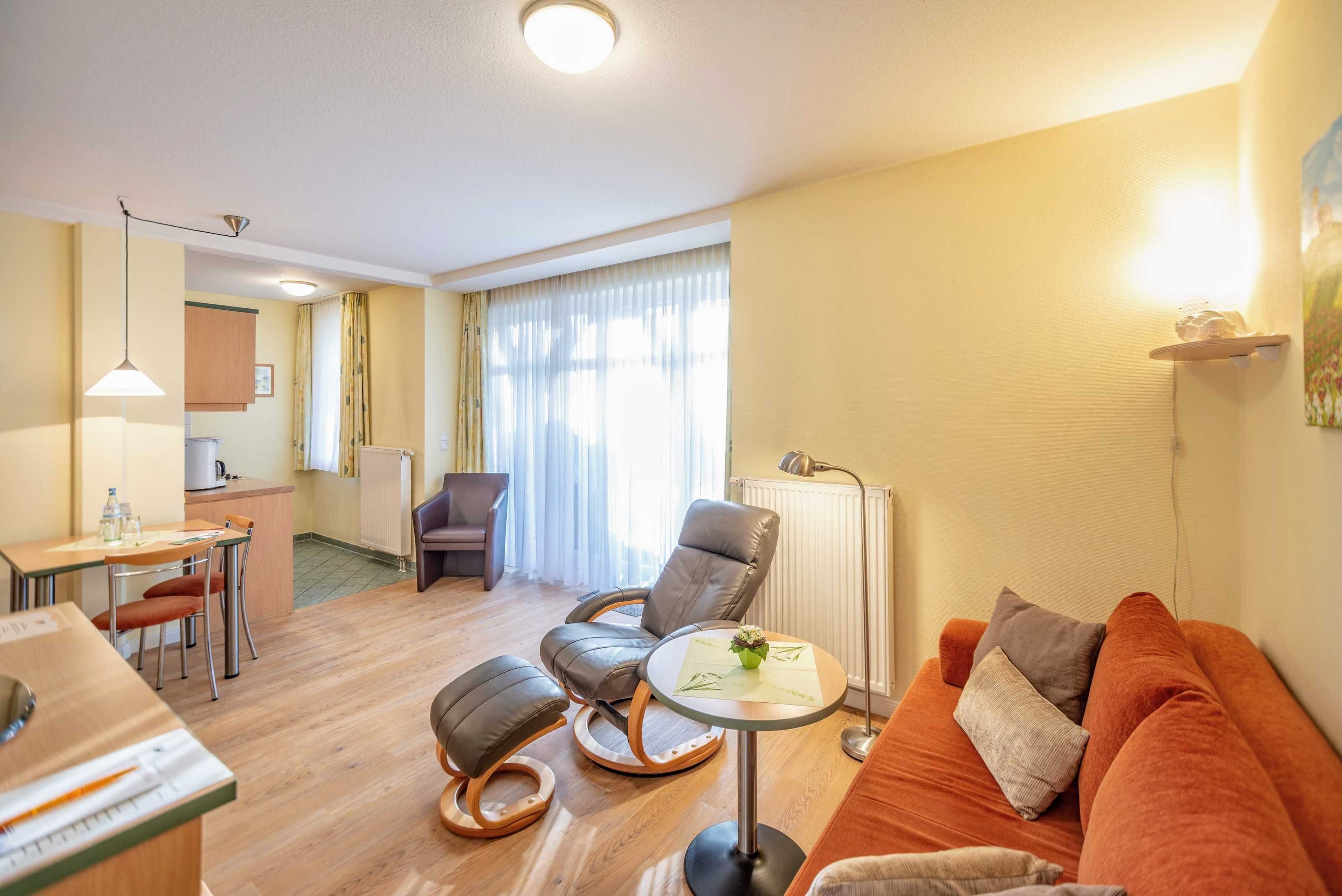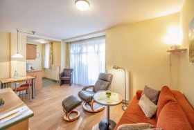 Das 2-Zimmer-Apartment mit Teppichboden befindet sich im Erdgeschoss des Hauses Waldeck. Mit ca. 40 m² Wohnfläche und einer Terrasse mit Strandkorb zur Südseite und Blick zum Stadtwald (sehr ruhige Lage), besteht das Apartment aus einem Wohnzimmer mit Schlafcouch und einer voll ausgestatteten Küchenzeile mit Geschirrspülmaschine, Kühlschrank, Mikrowelle, Zwei-Platten-Cerankochfeld, Kaffeemaschine, Wasserkocher und einem Toaster. Das Schlafzimmer verfügt über ein Doppelbett. Im Badezimmer befindet sich eine Badewanne, ein Fön wird Ihnen zur Verfügung gestellt. Das Apartment ist für maximal 2 Erwachsene und insgesamt 3 Personen geeignet, auch Hunde sind gestattet.